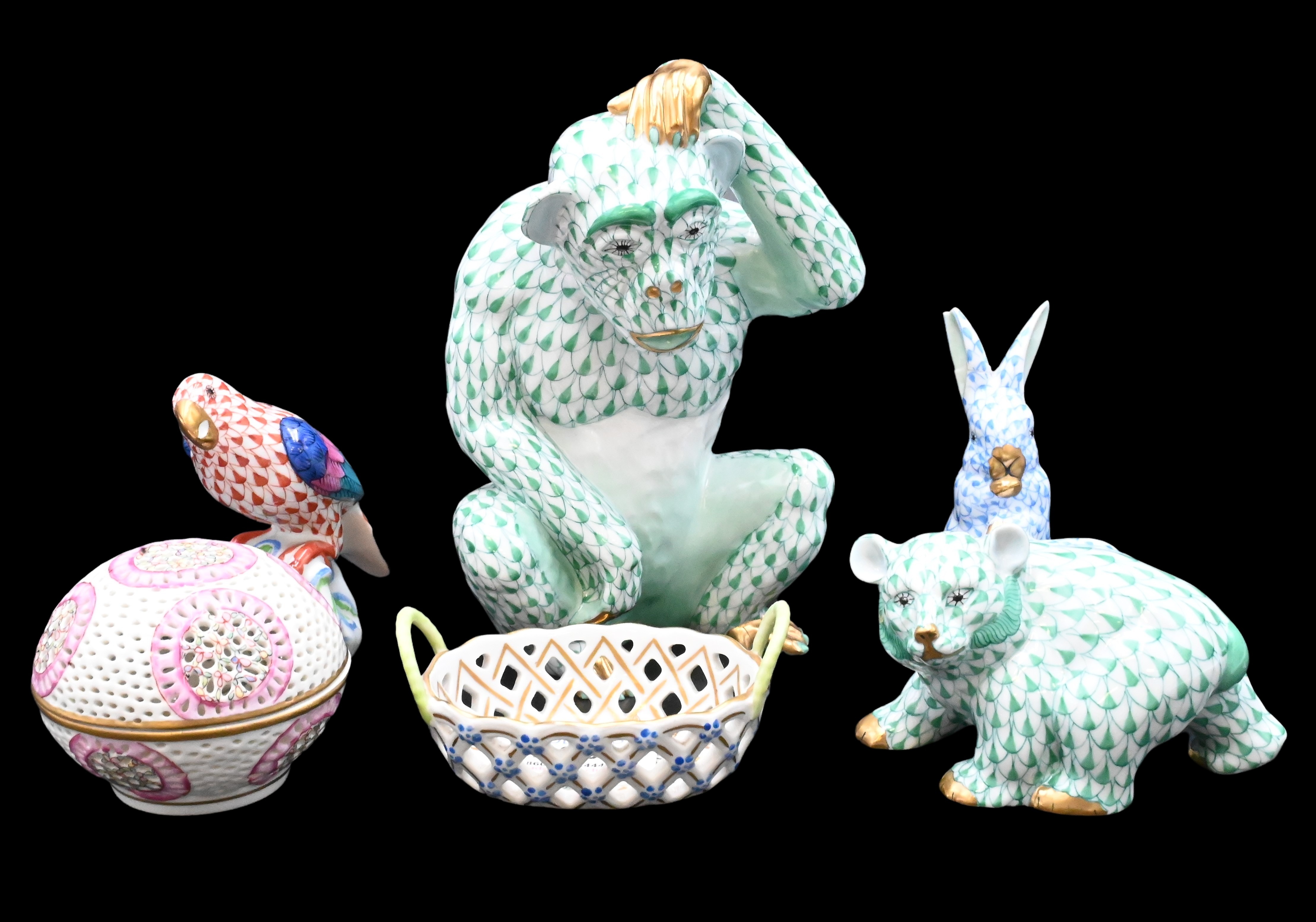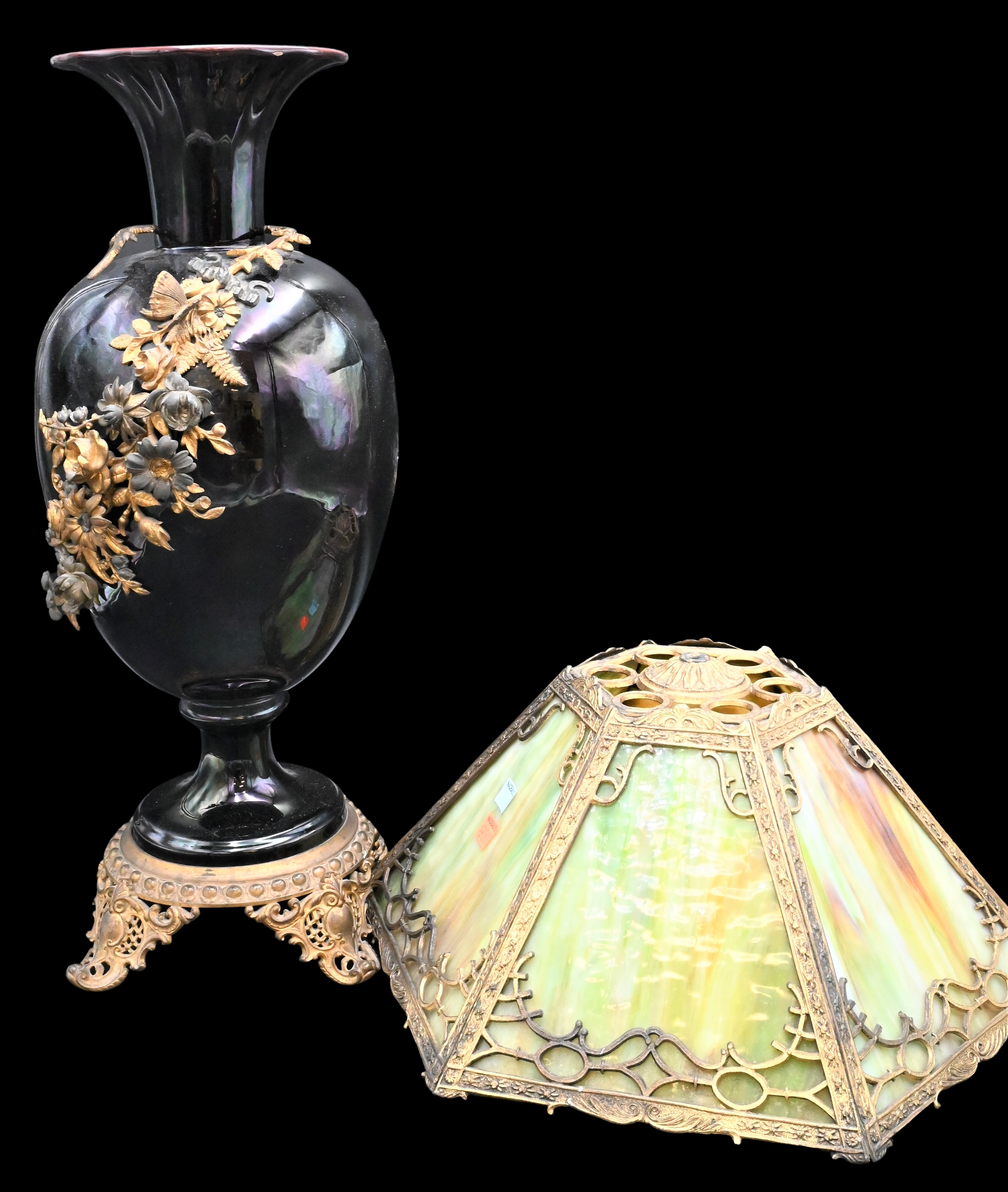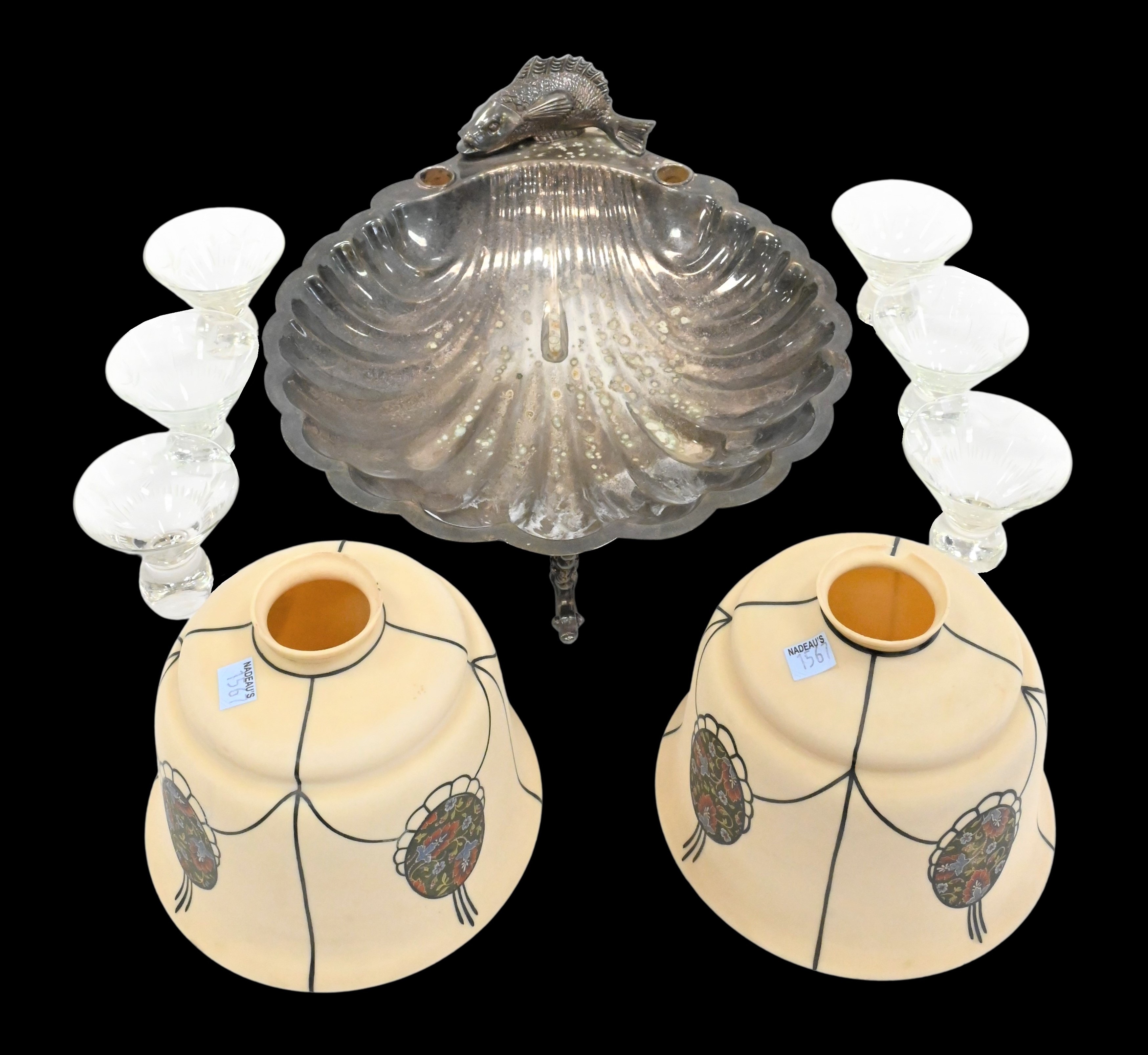 Nine Piece Assorted Grouping, to include a pair of calcite lampshades (chipped) having painted floral and egg design, six glasses, along with a silver painted shell tray; shade height 6 inches.