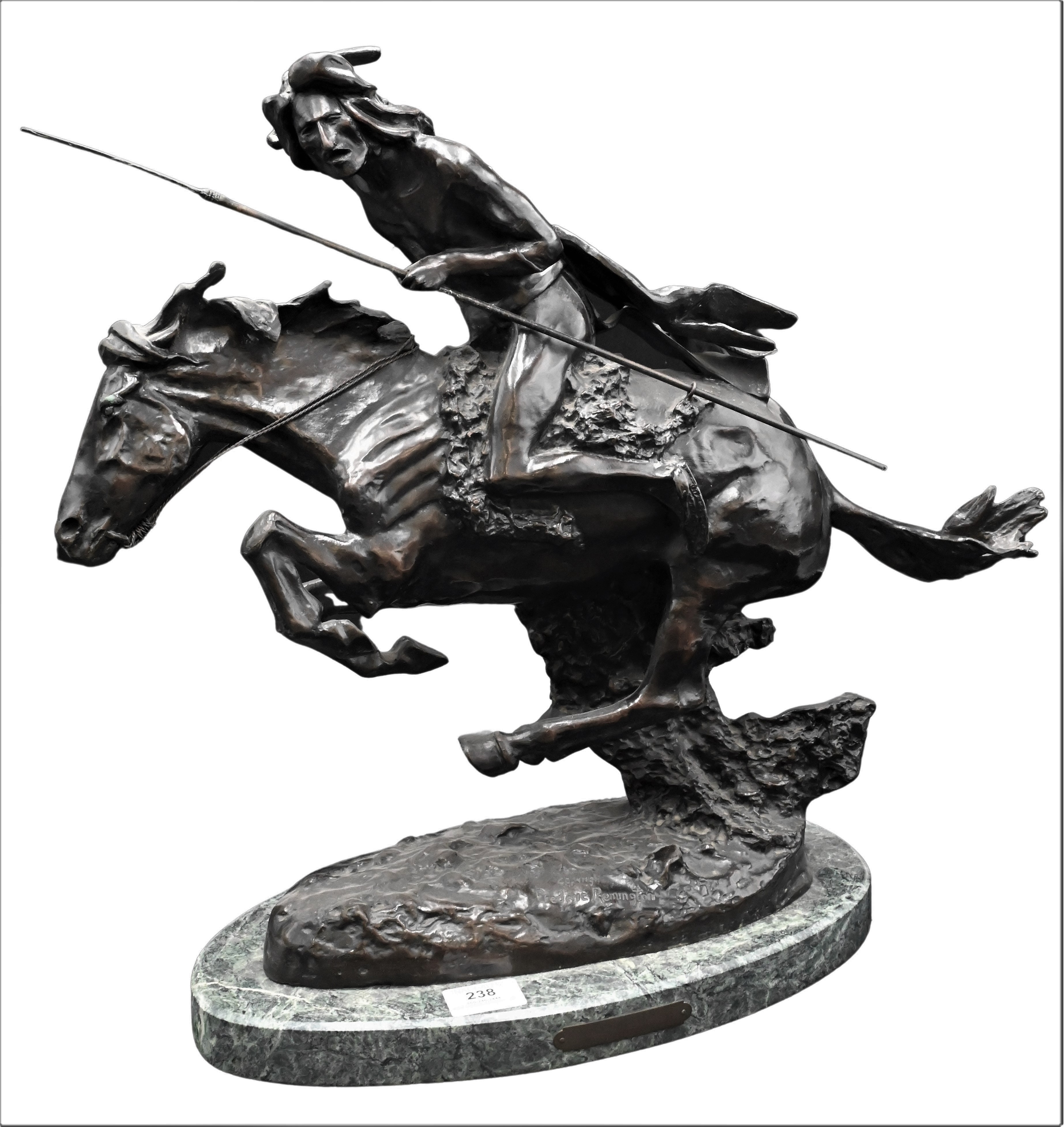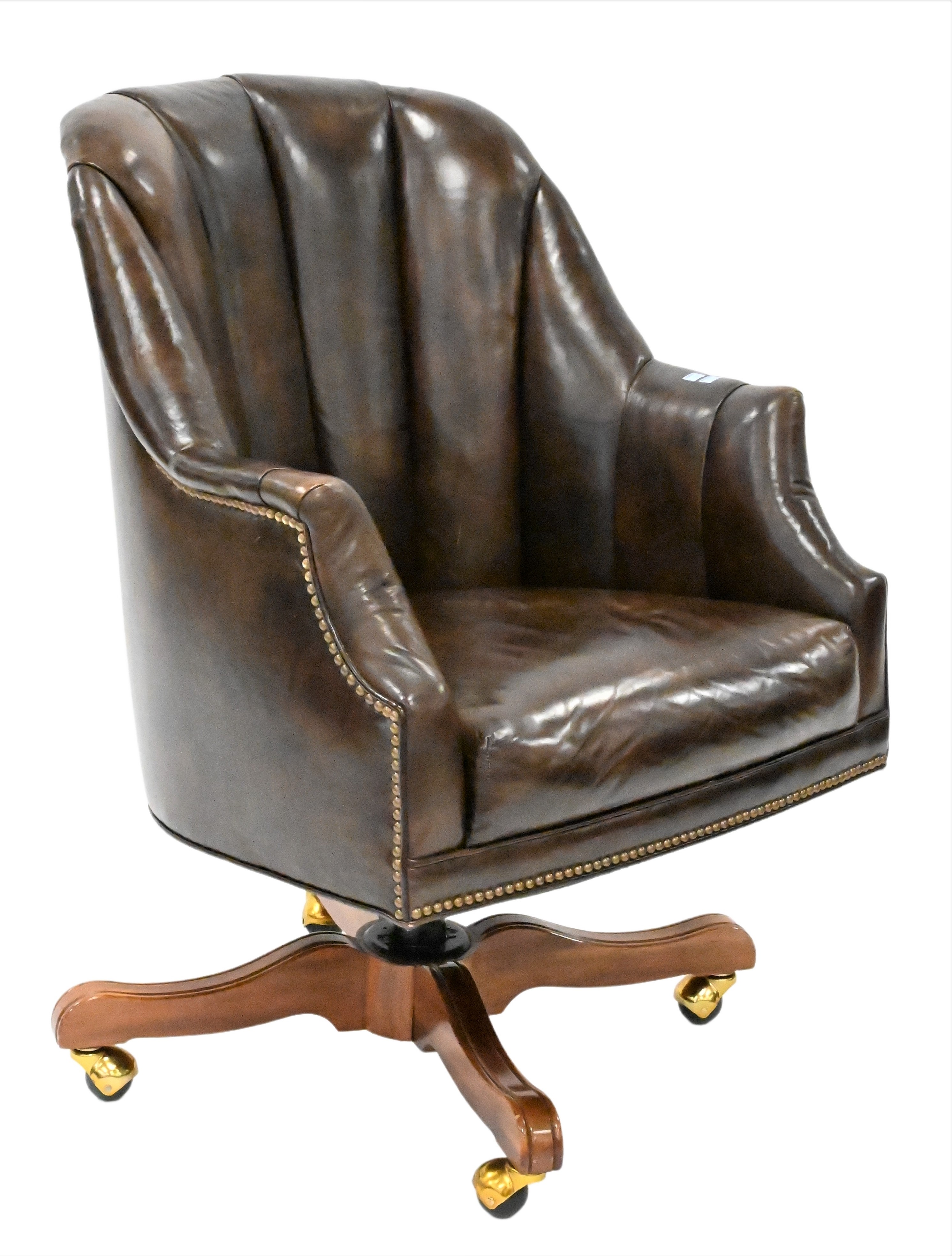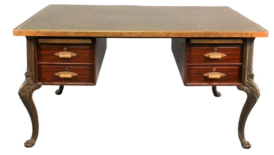 Metal Desk, faux mahogany on bronze legs with paw feet, top having inset leather and brass handles, attributed to Simmons Company, circa 1940, top slightly lifting on back corner, height 30 inches, top 48″ x 60″.