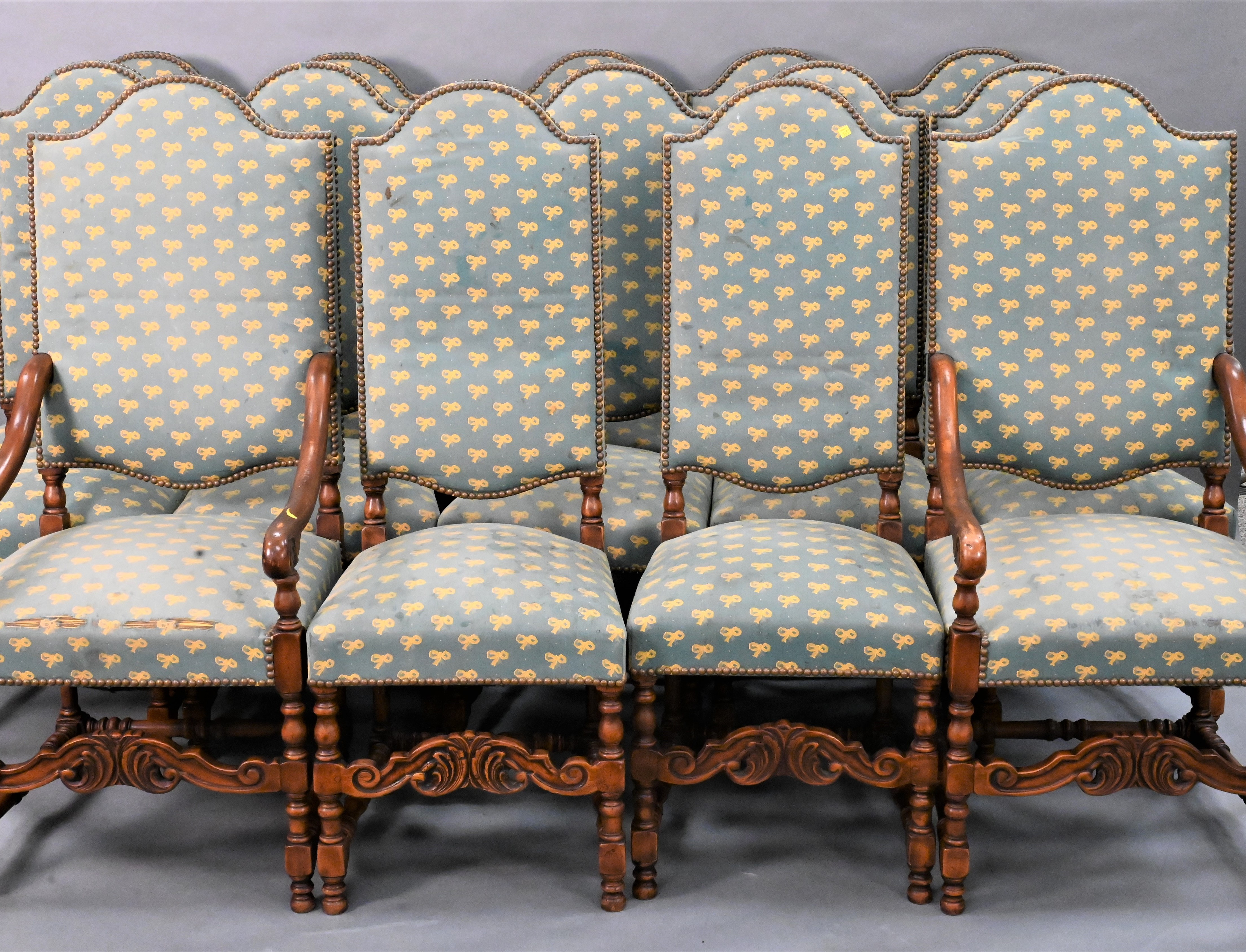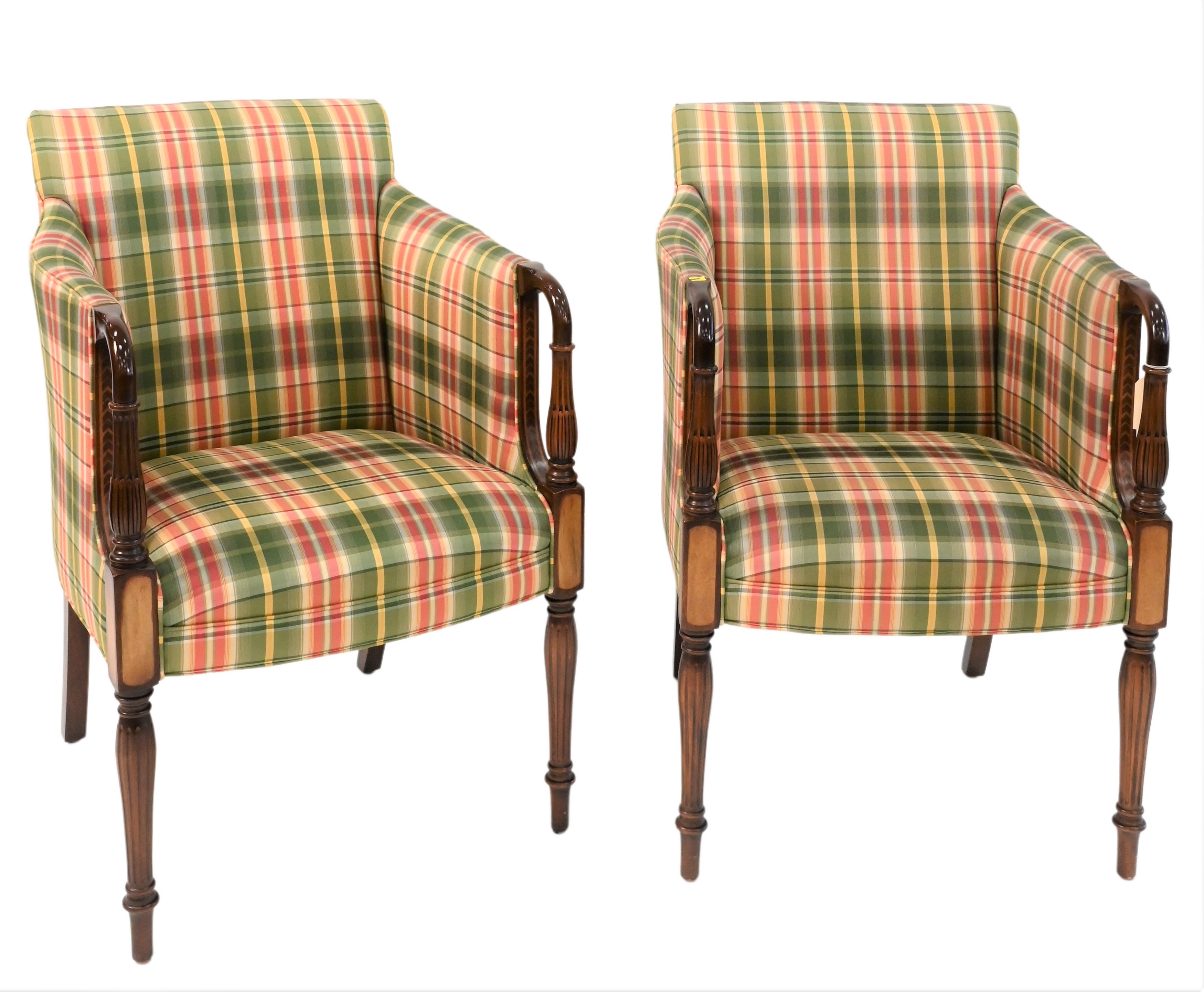 A Pair of Southwood Upholstered Sheraton Style Armchairs, having inlaid frame along with fluted legs, height 36 inches, width 24 inches, depth 26 inches.