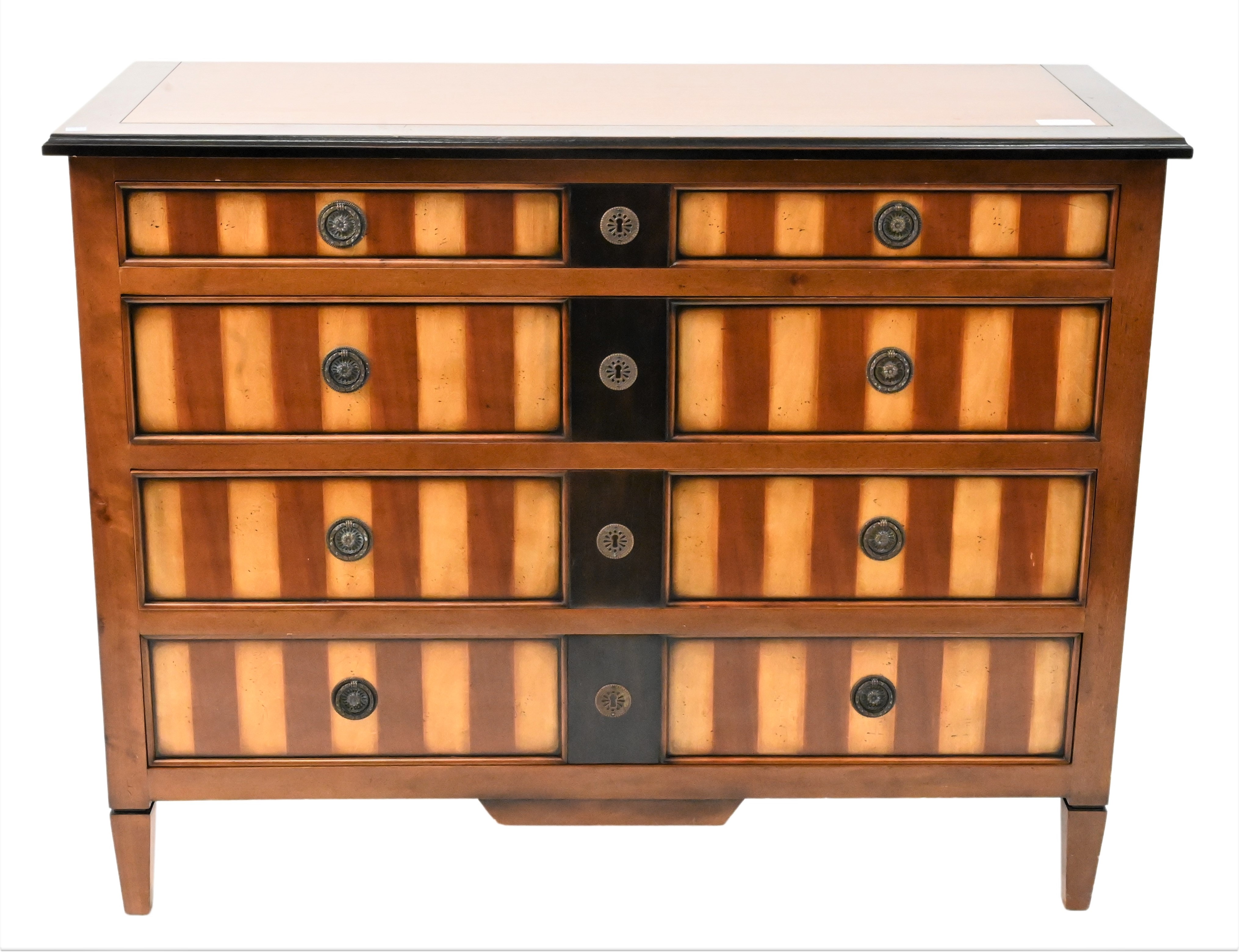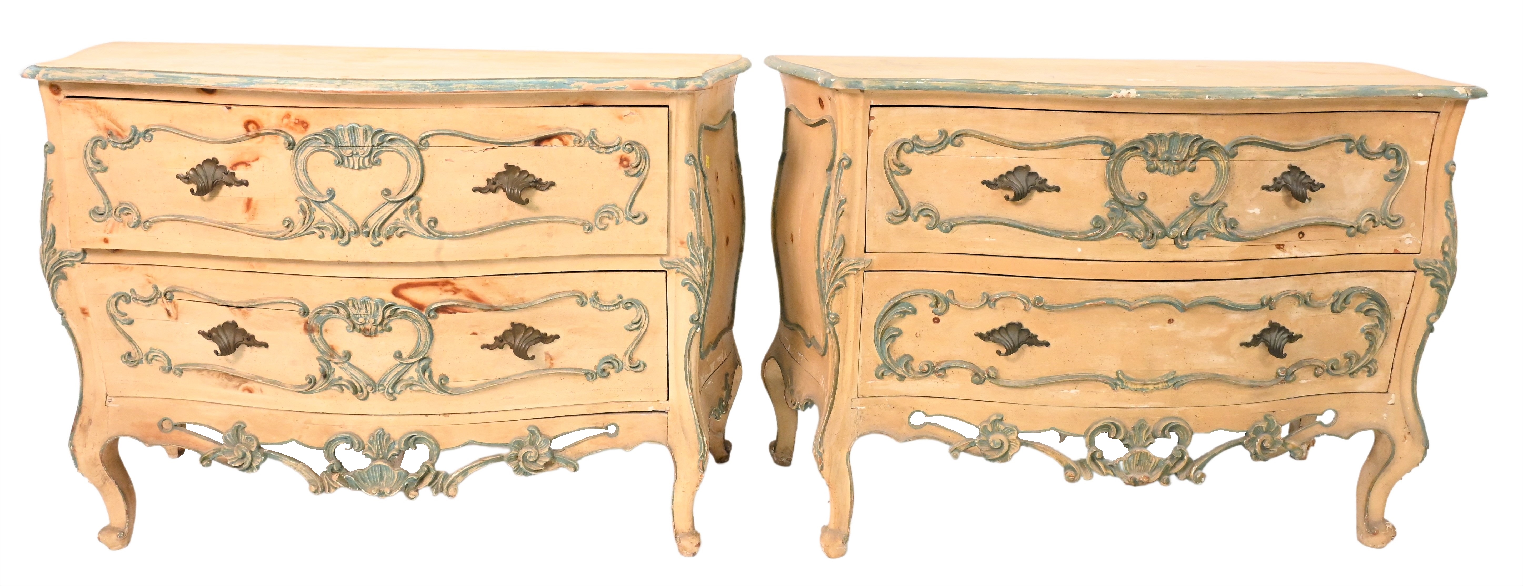 Pair of Louis XV Style Painted Commodes, each having shaped top over two large drawers set on cabriole legs, height 31 inches, having old paper label on back, top 17″ x 45″.