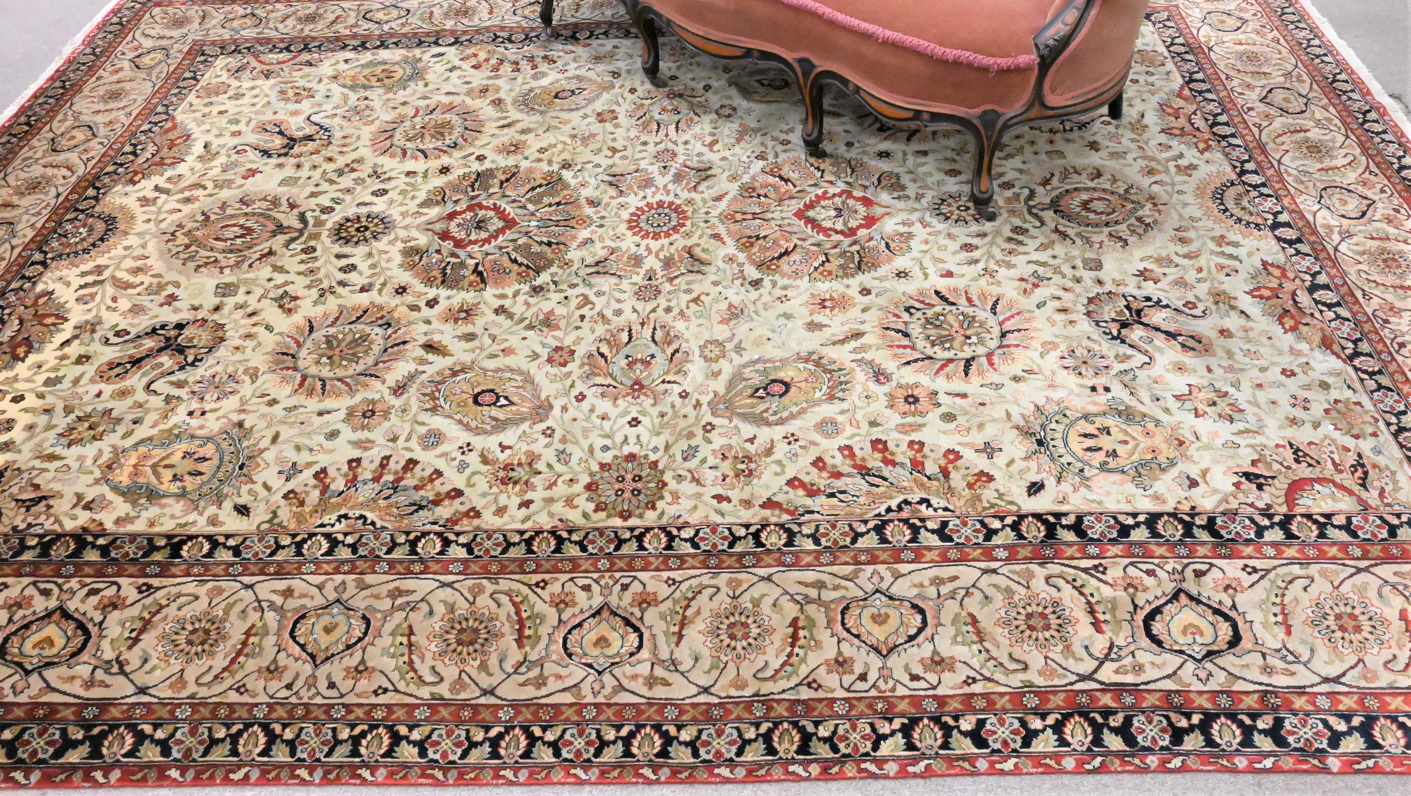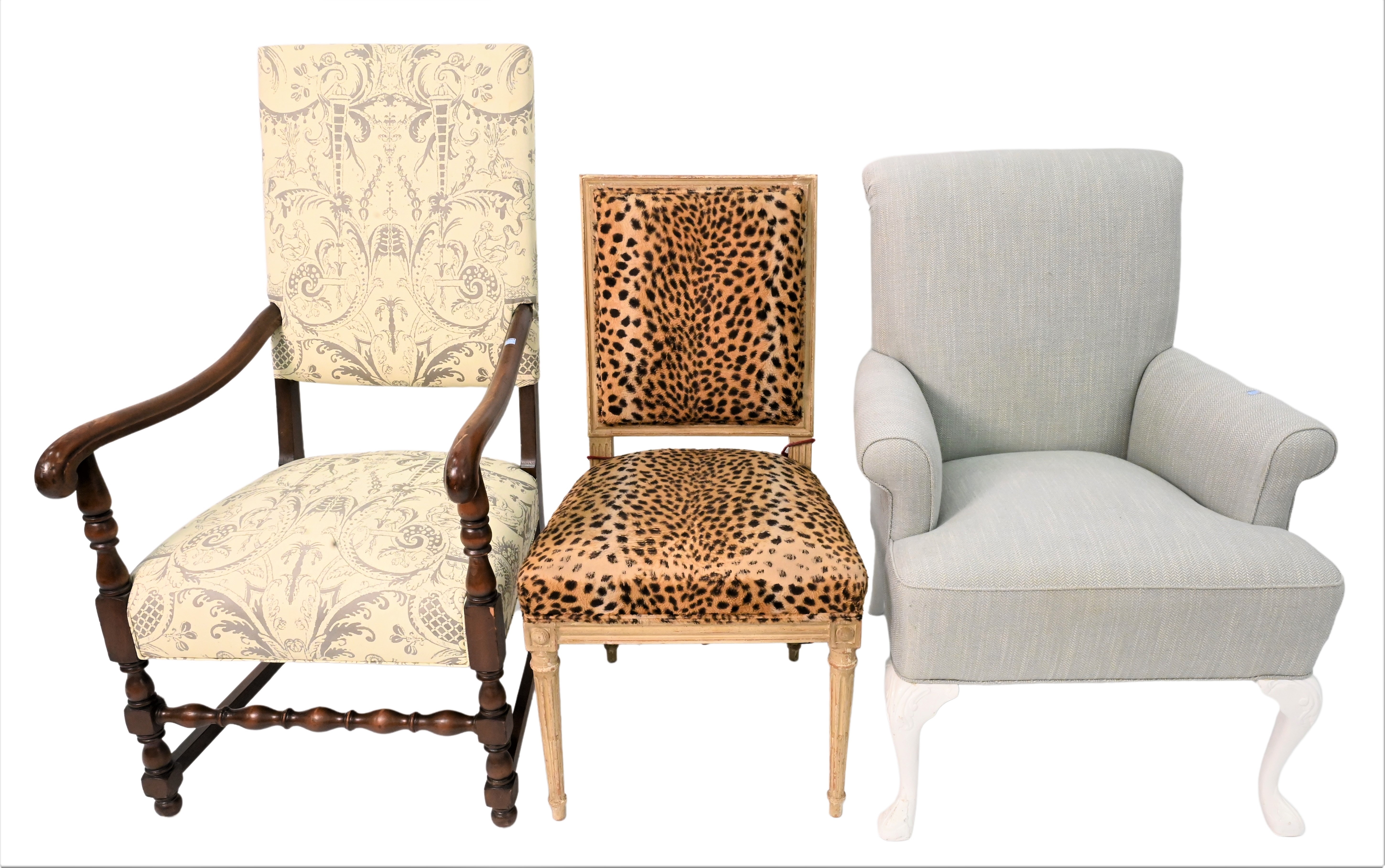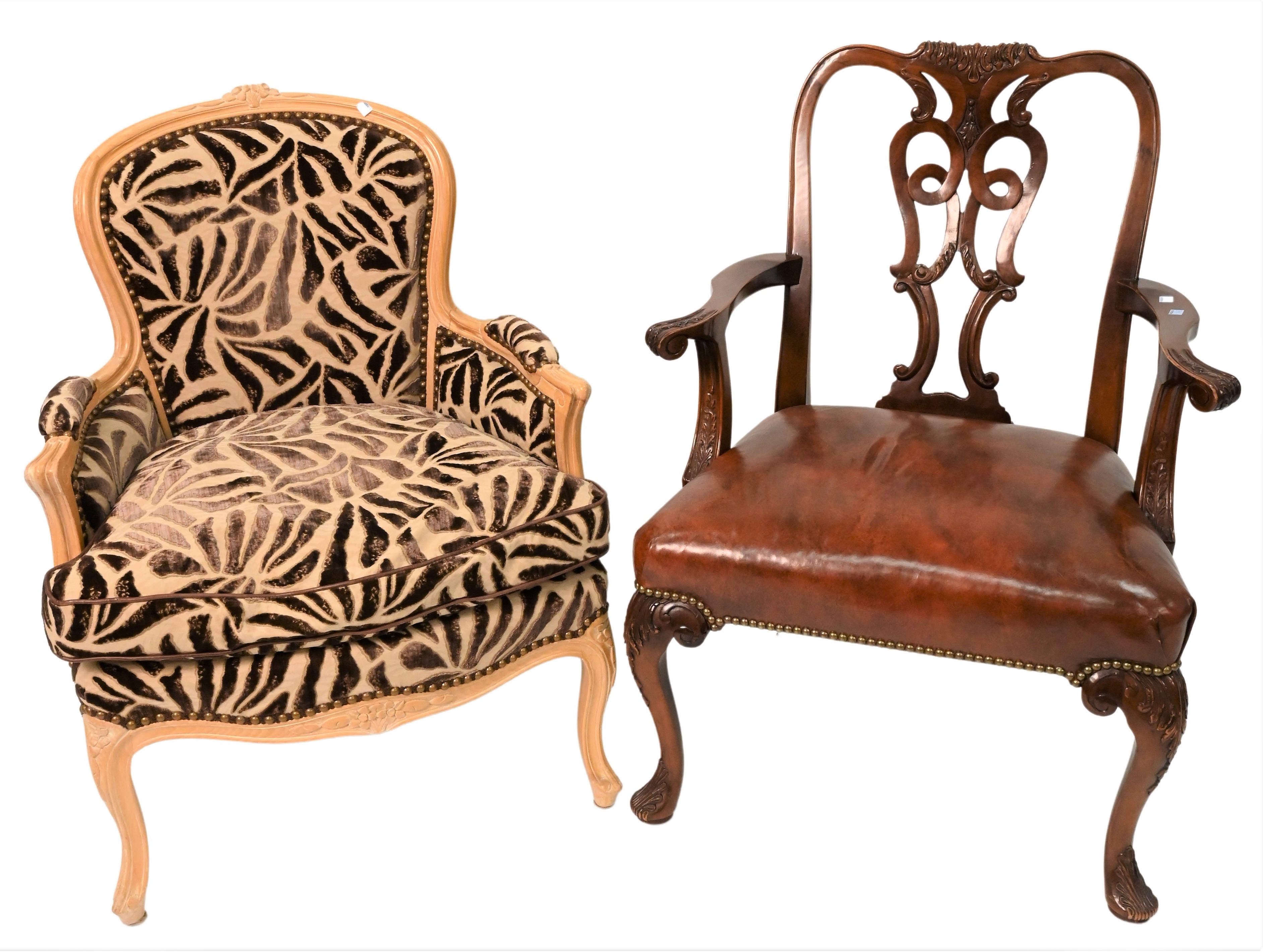 Three Piece Lot, to include a mahogany George IV style carved armchair, a Louis XV style custom upholstered fatoil, along with a Henredon sofa table, height 28 inches, top 16″ x 58″.