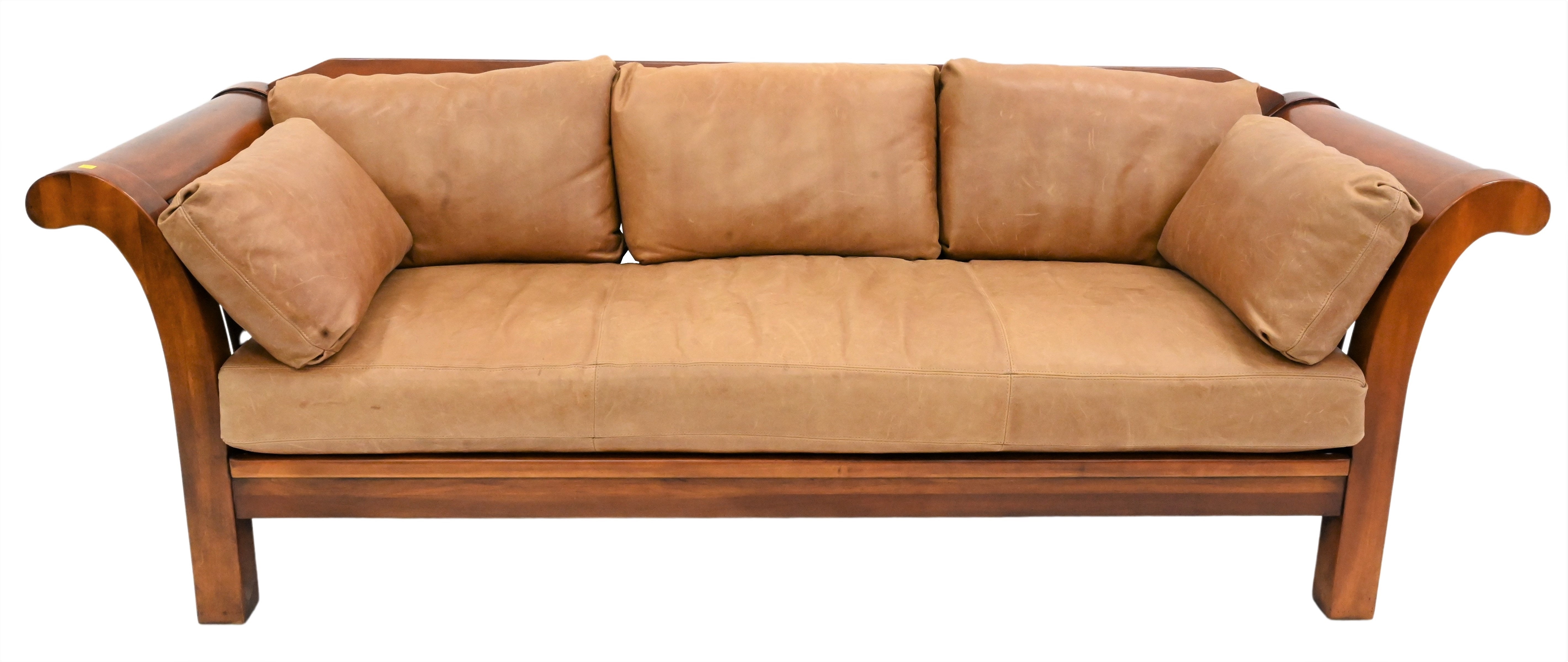 Three Piece Mission Style Cherry and Leather Group, to include a mission style cherry and leather sofa, height 31 inches, length 86 inches, a leather club chair, along with ottoman; height 35 inches, width 37 inches.
