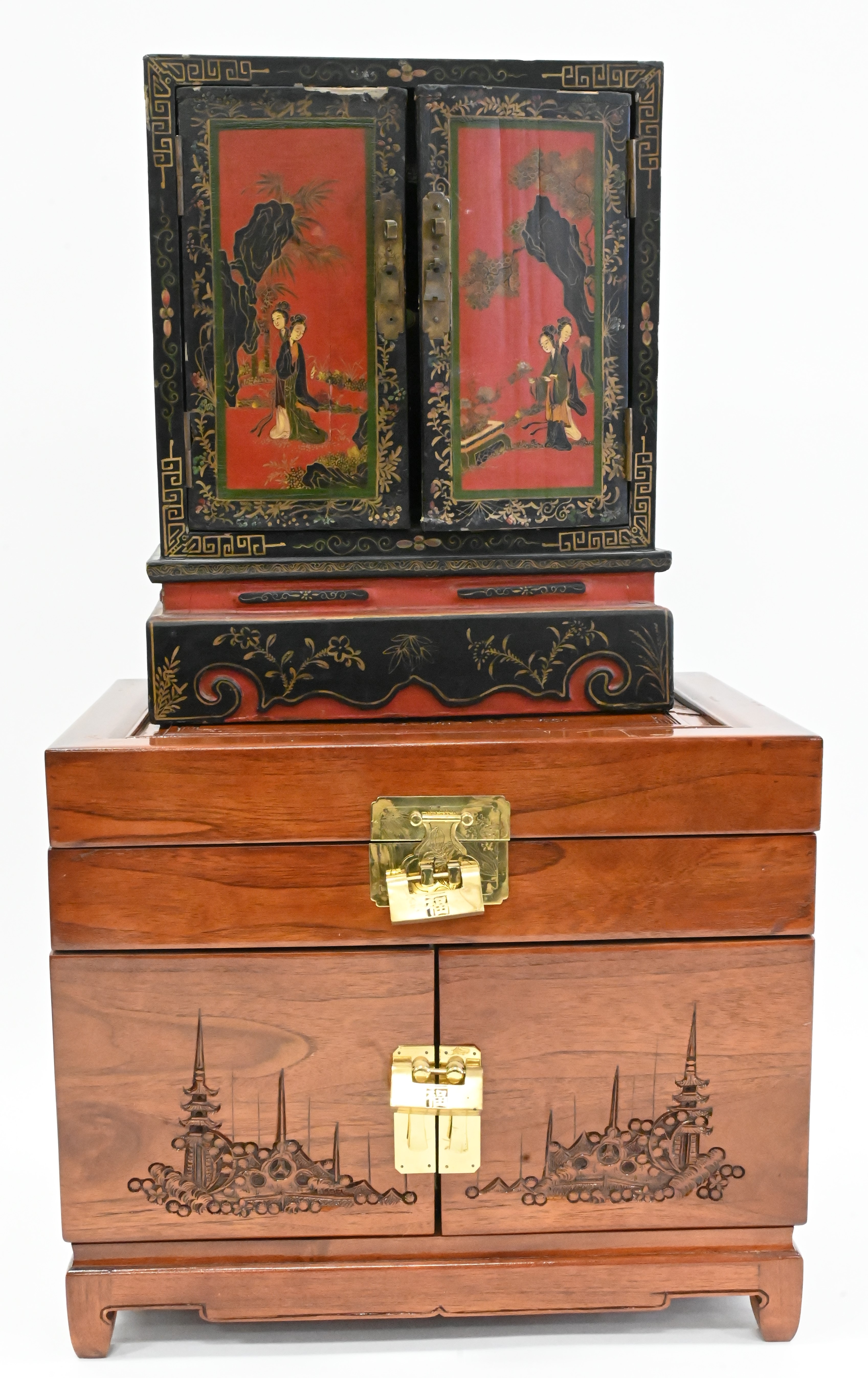 Two Chinese Boxes, to include a chinoiserie decorated cabinet, height 18 inches, width 14 inches; along with a carved wood cabinet with drawers, height 27 inches, width 20 inches.