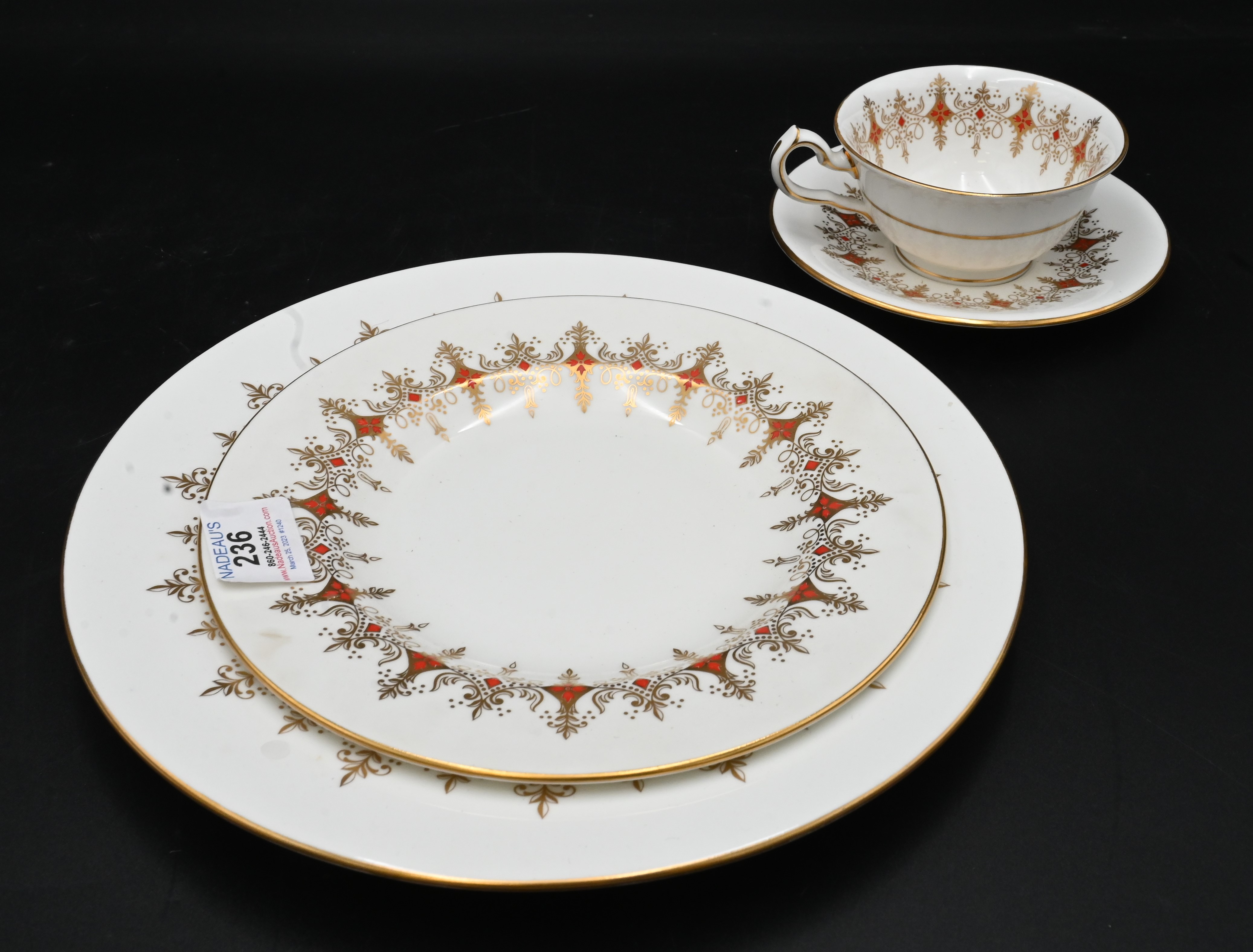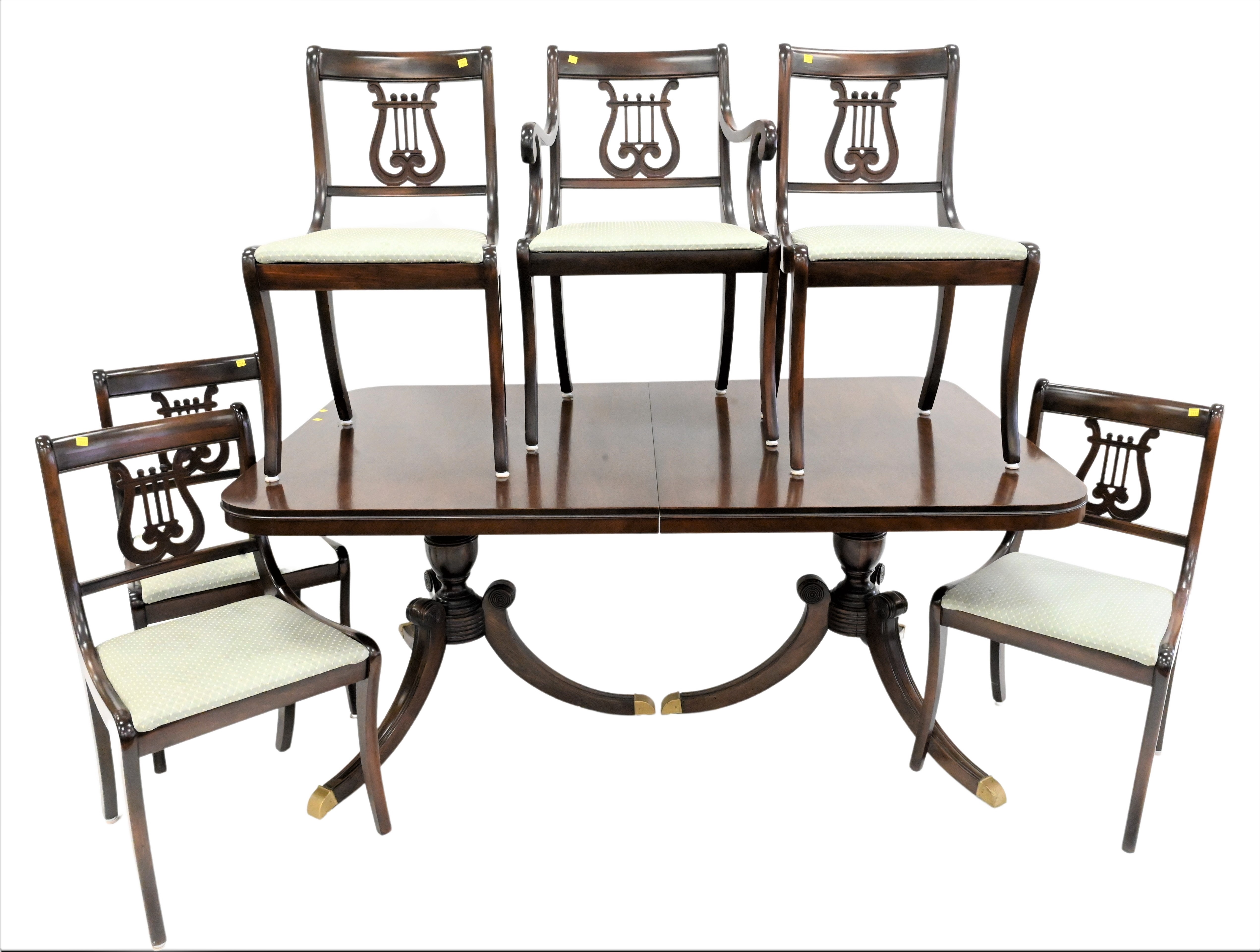 Seven Piece Mahogany Dining Set, to include a double pedestal table, six chairs, along with 12 inch leaves and pads, height 28 inches, top 41″ x 66″, when open 41″ x 102″.