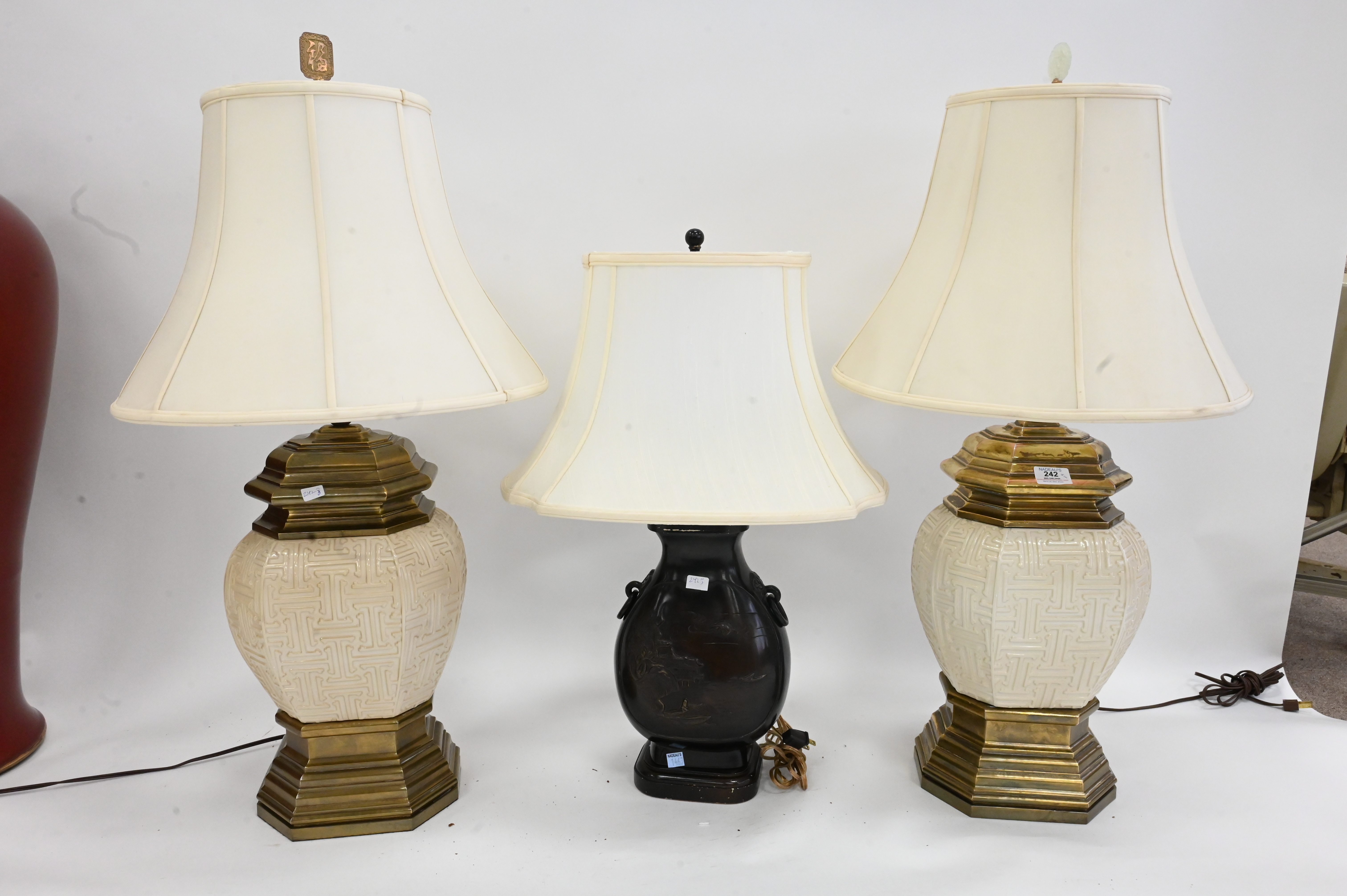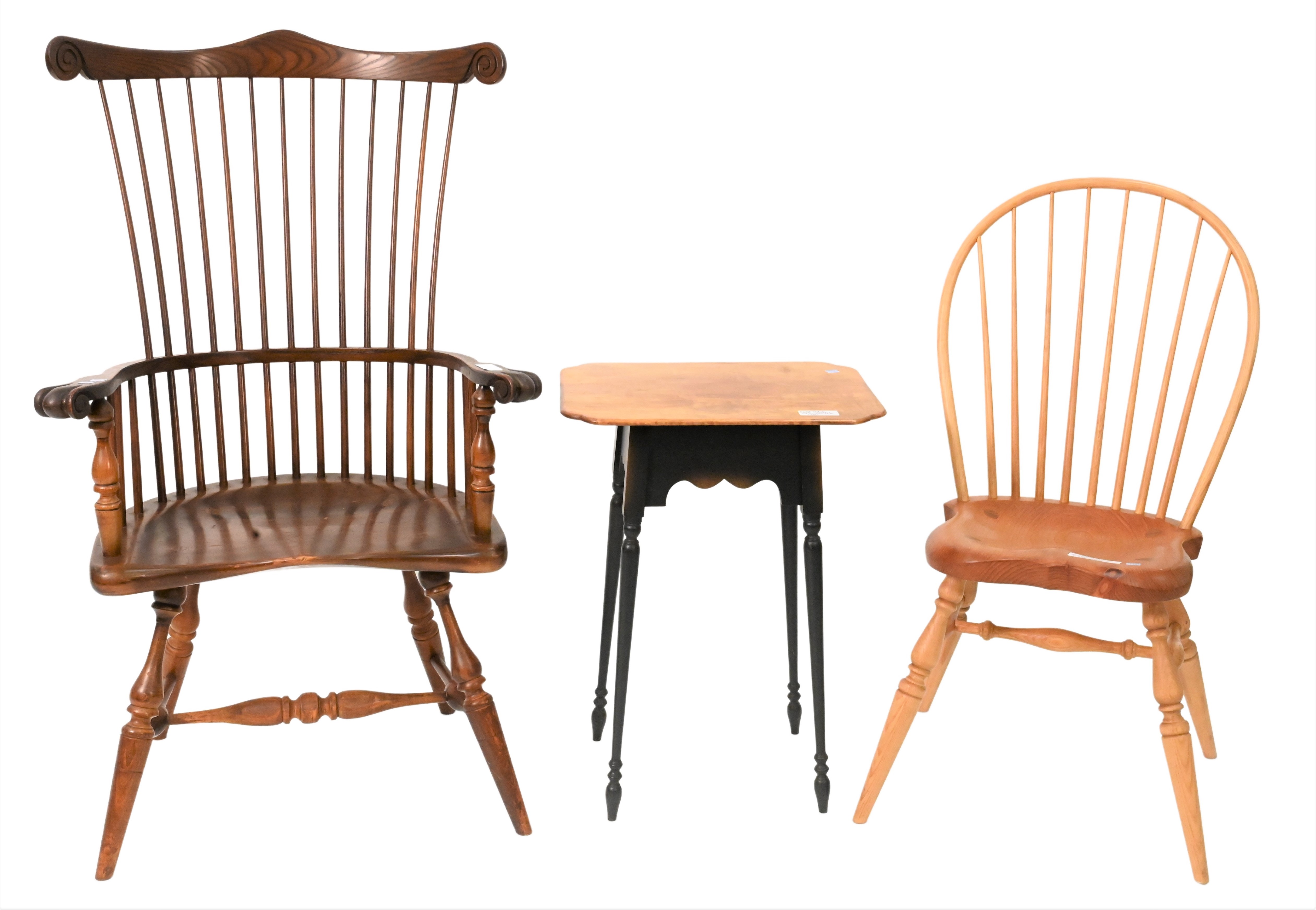 Three Piece Custom Lot, to include two Windsor chairs, one armchair signed Frederick Duckloe, a side chair signed J. Brown, Lincolnville, ME, along with a Riverbend candle stand, tallest 46 inches.