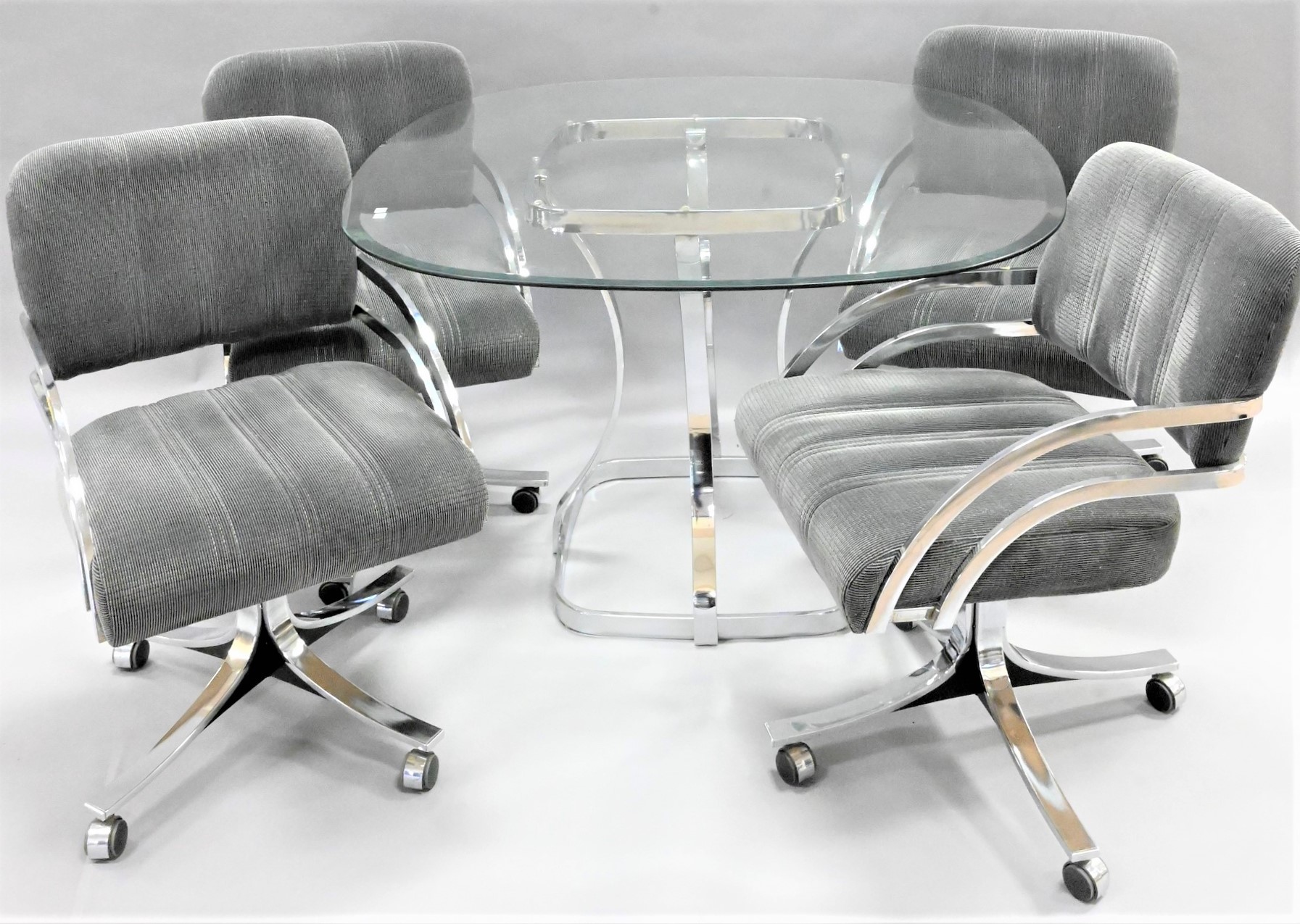 Five Piece Chrome Dining Set, to include a round glass top table set on pedestal base, four upholstered chrome armchairs, set on casters, along with a mid century modern floor pole lamp, and a non-matching chrome armchair, height 29 inches, diameter 54 inches.