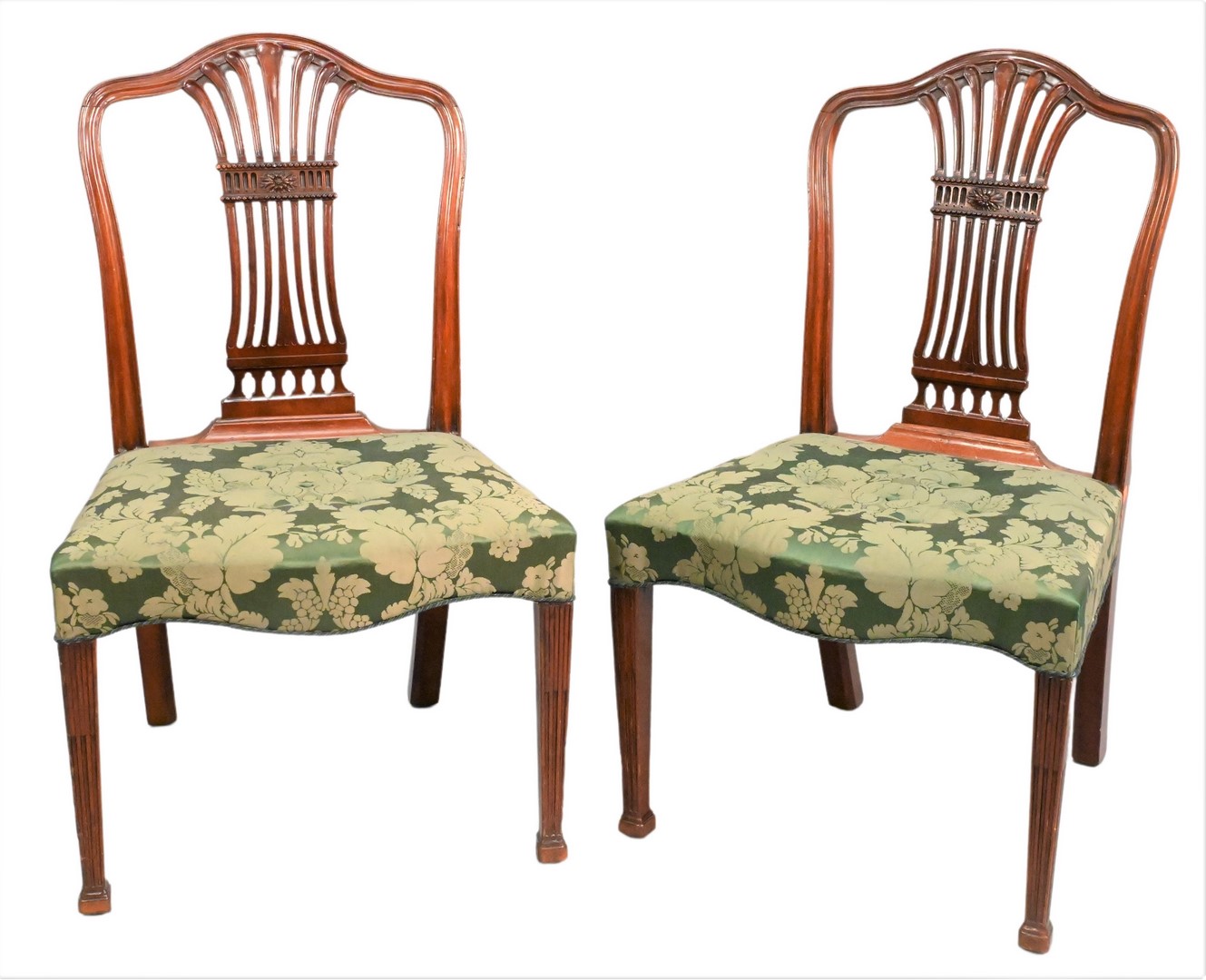 Pair of George IV Mahogany Side Chairs, having fully upholstered seats, circa 1800, height 37 1/2 inches, seat height 17 inches. Provenance: Estate of Peter Tillou, Litchfield, Connecticut.