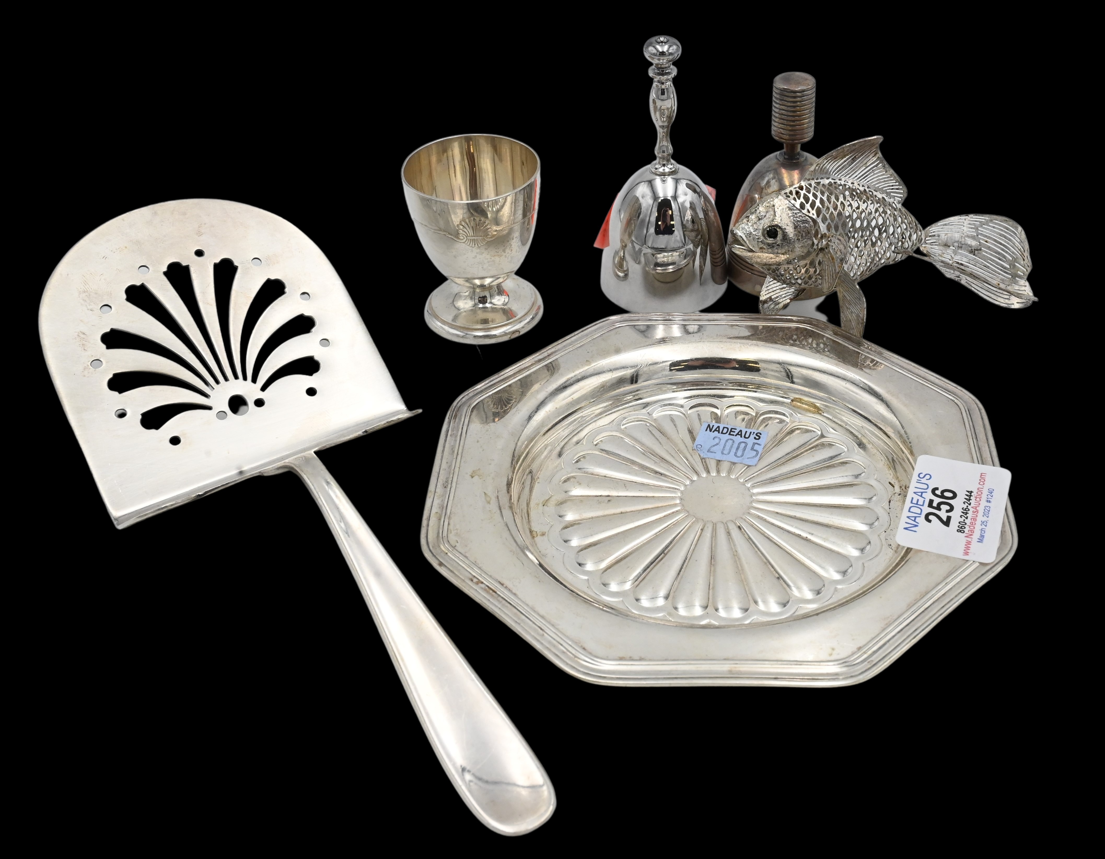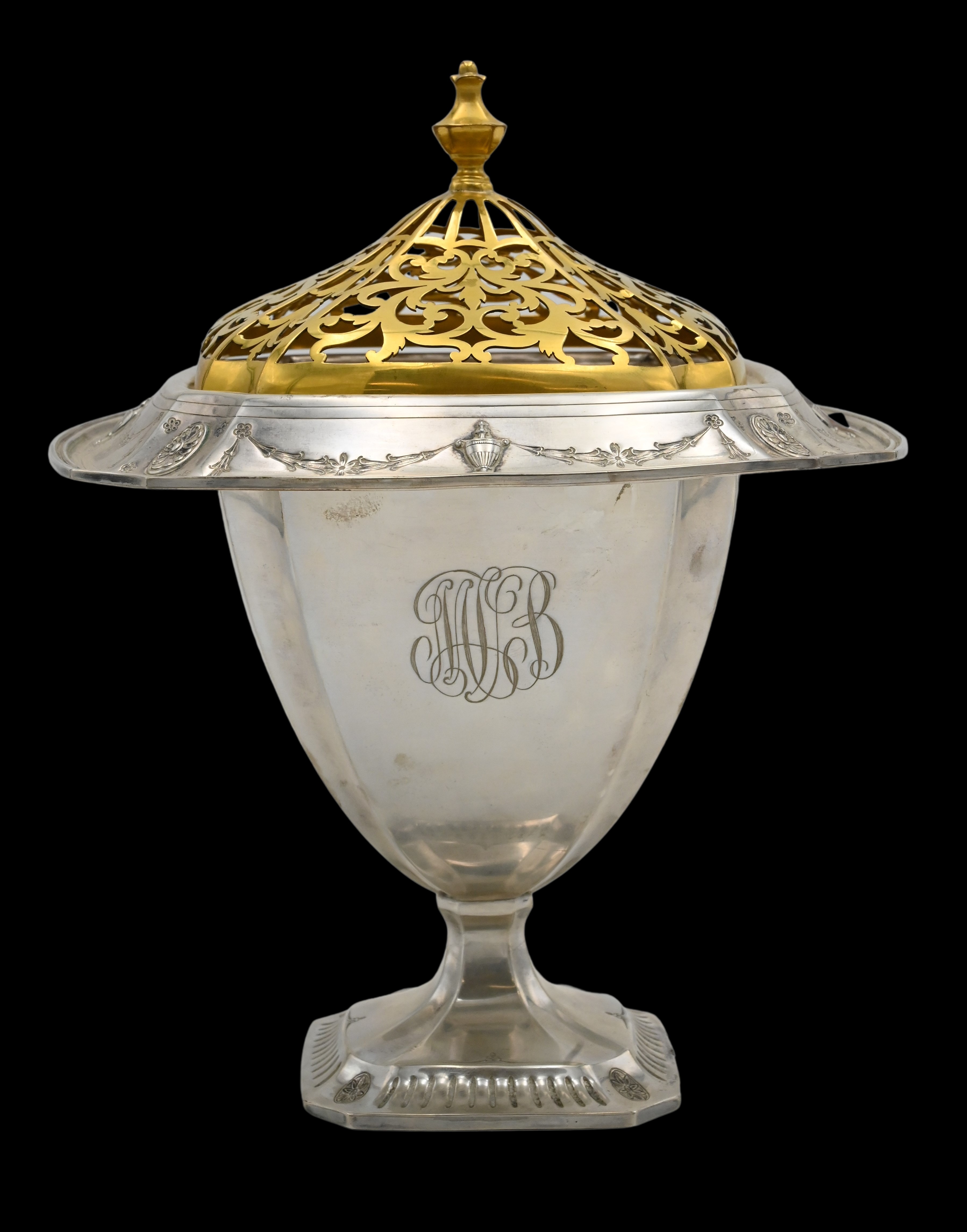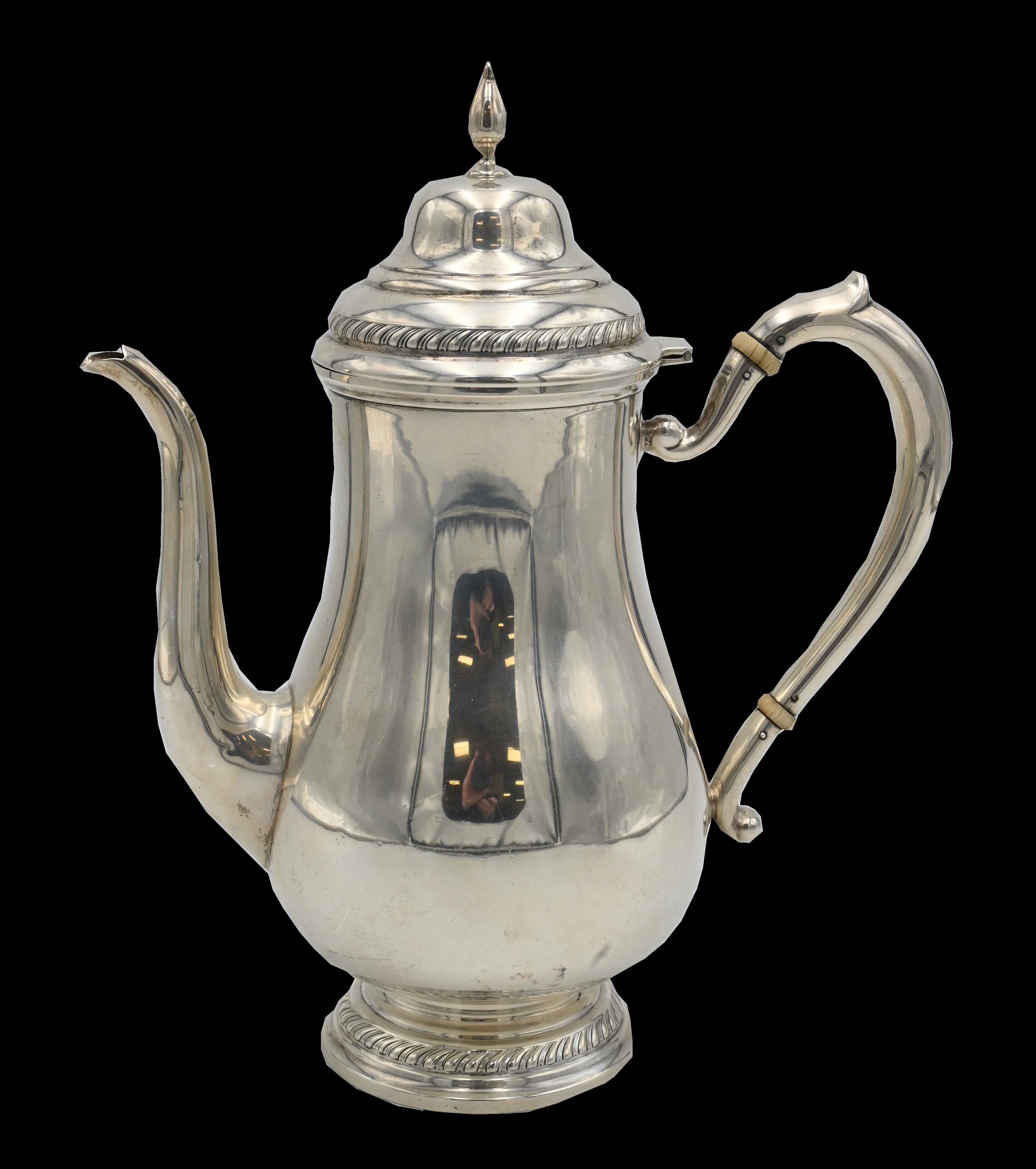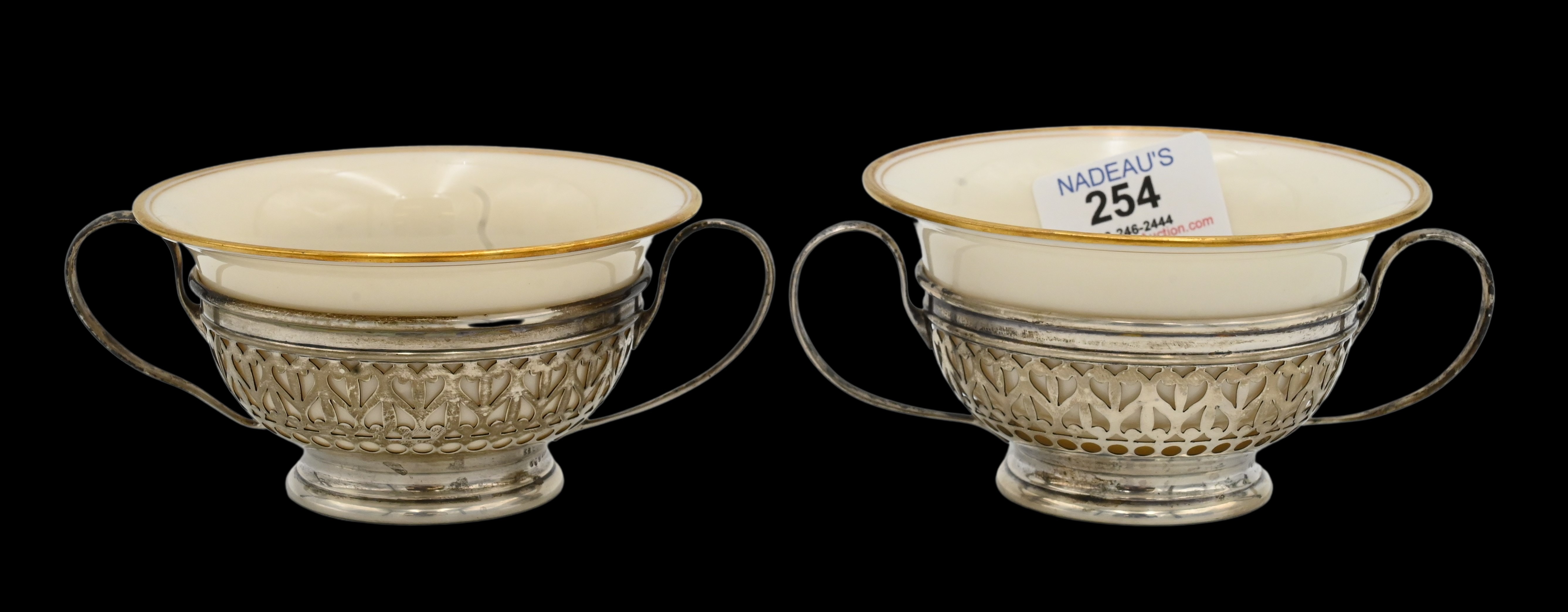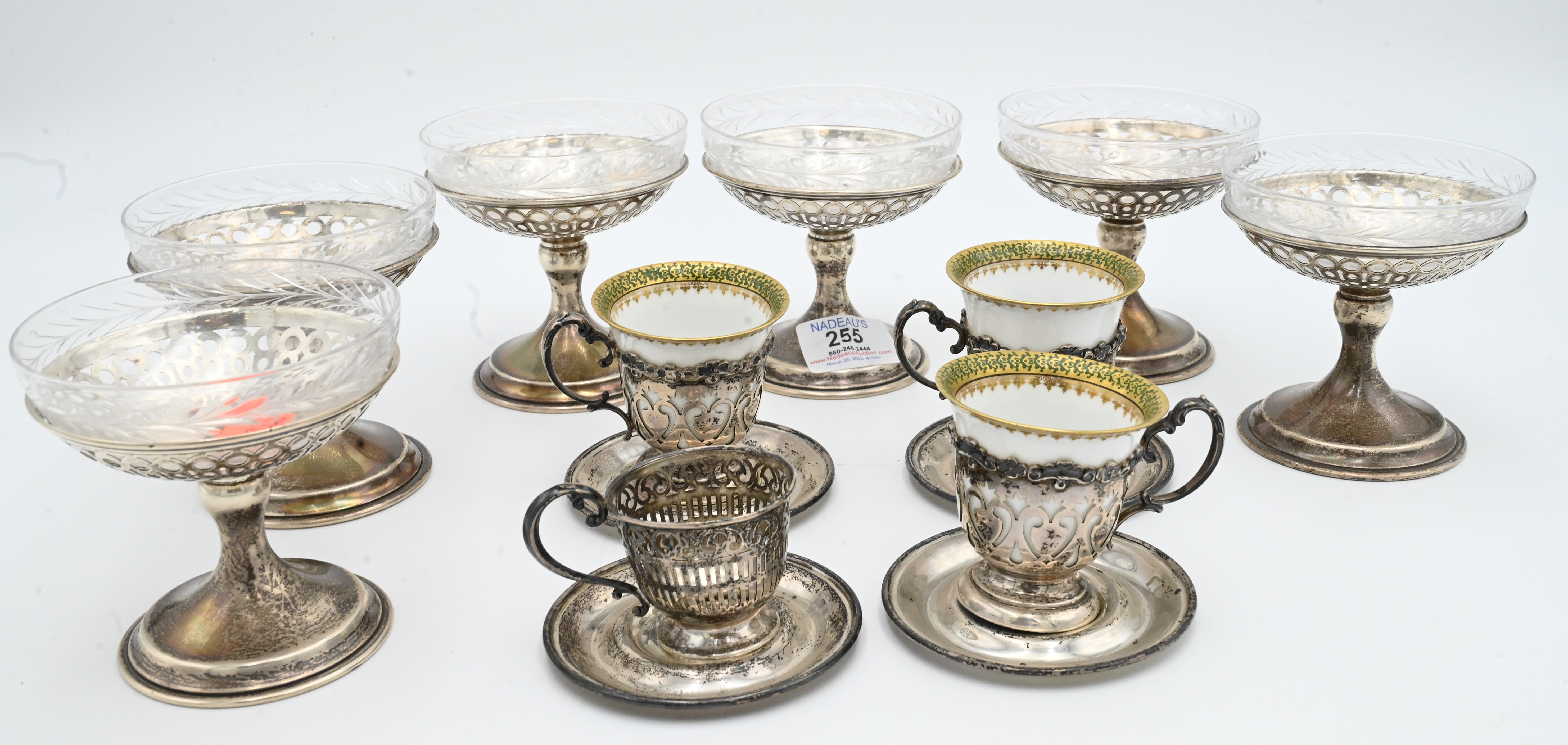 Set of Six Sterling Silver Champagne Chalices, along with glass inserts, together with four sterling silver and porcelain teacups, saucers, one porcelain cup missing, 20.6 t.oz.