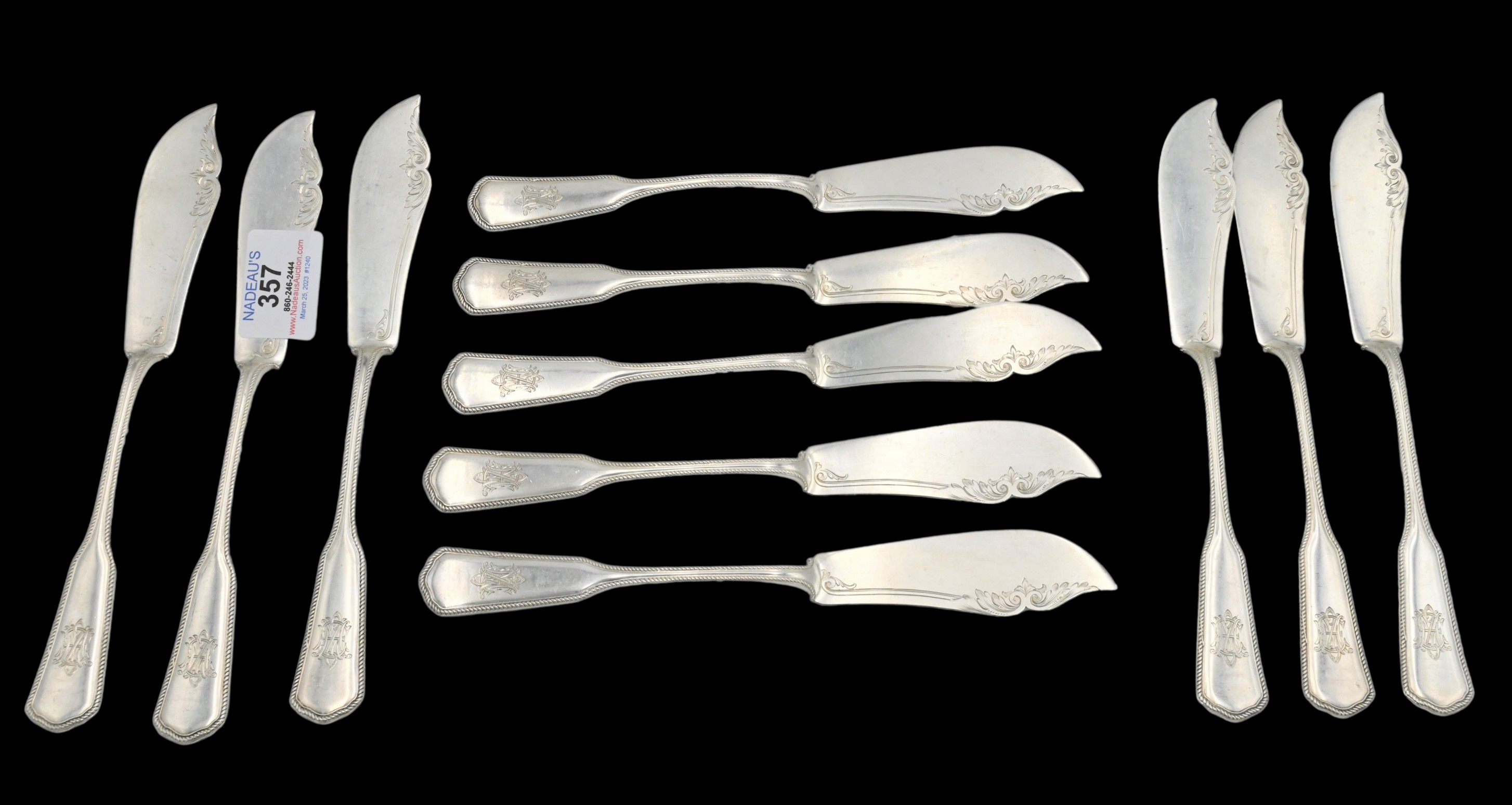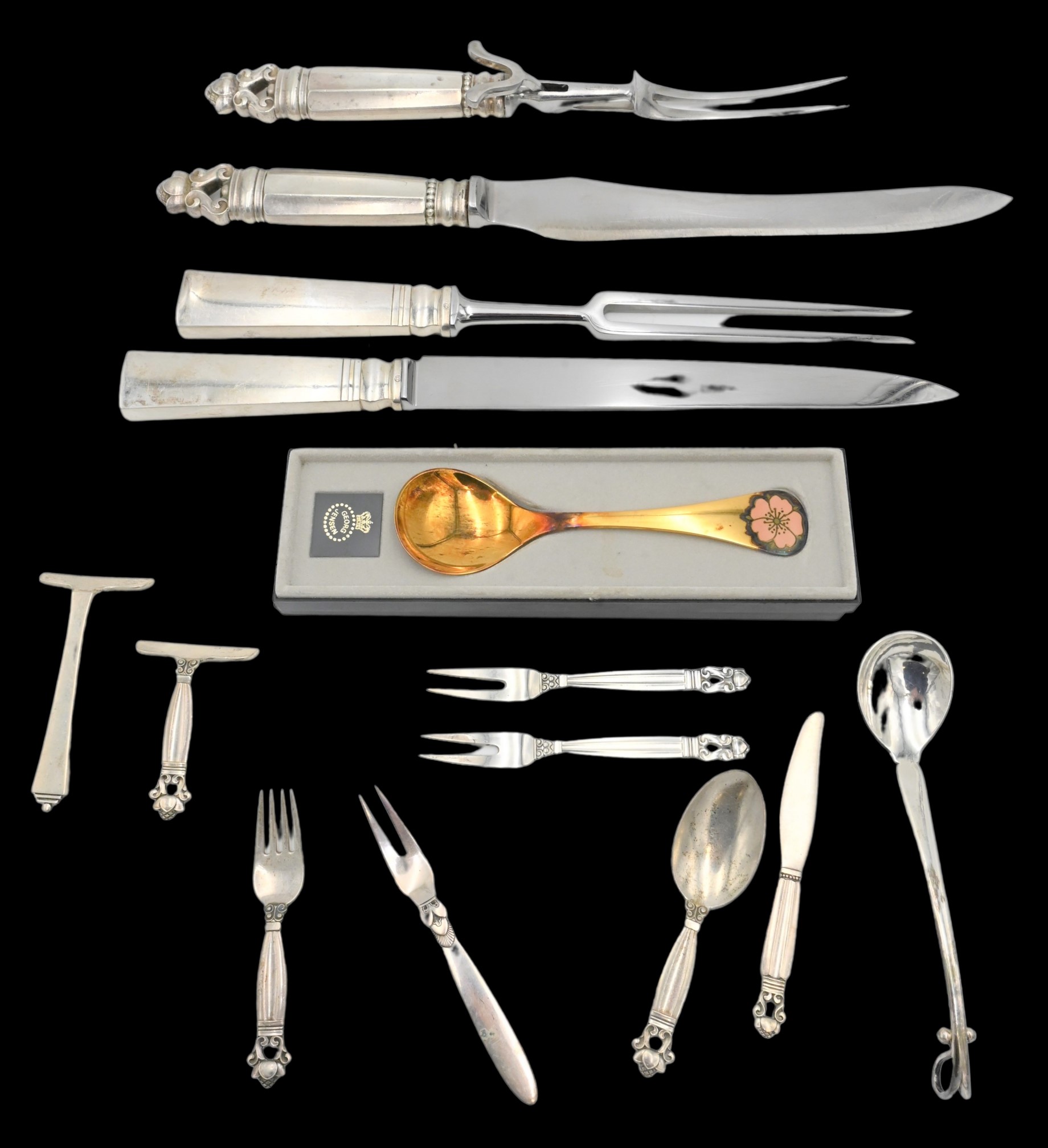 13 Piece Georg Jensen Sterling Silver Group, to include acorn pattern childs set of flatware, two sets of carving knives and forks, spoon, two ice scrapers, along with a gold wash and enamel spoon, weighable 6.6 t.oz.