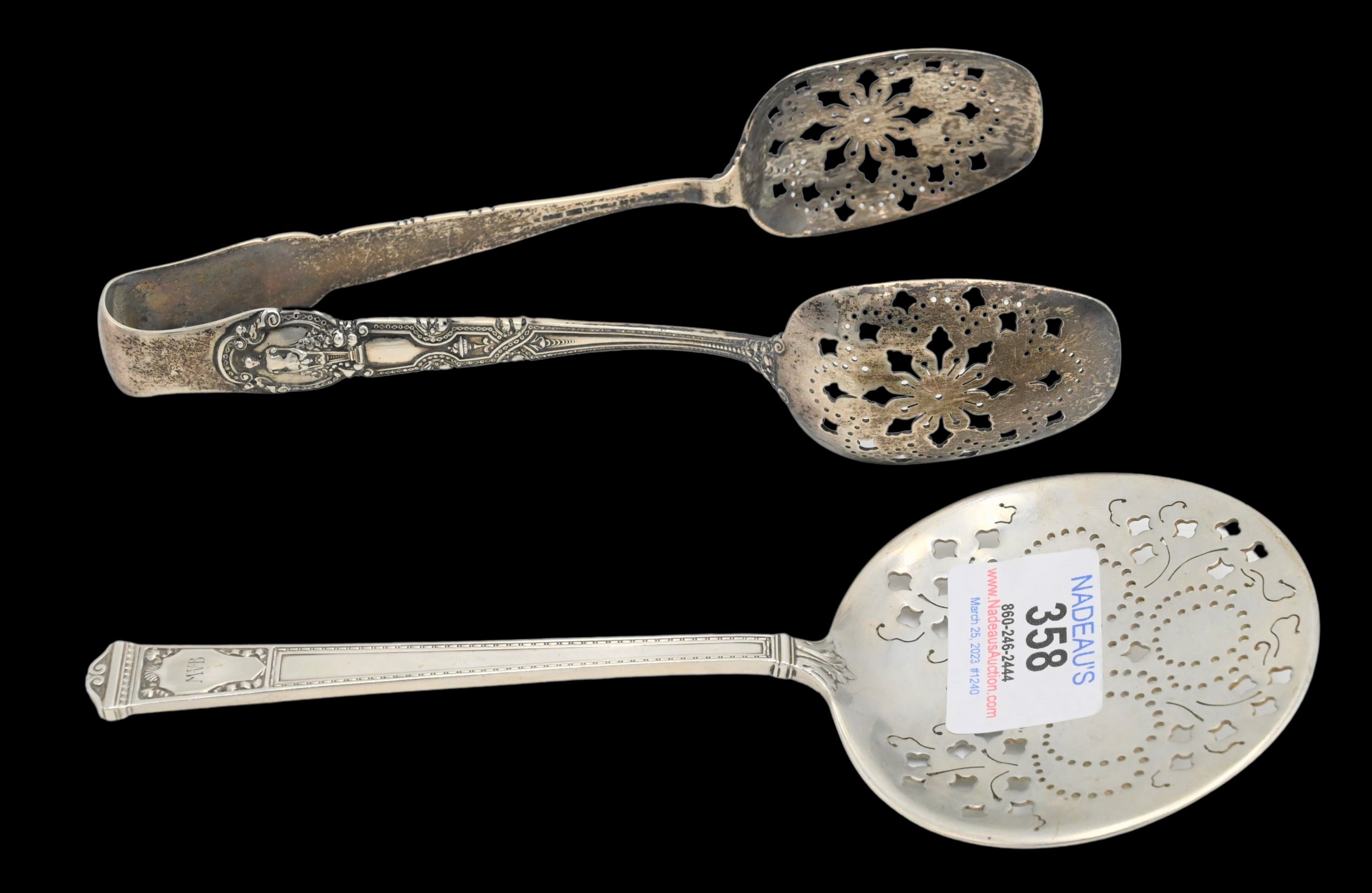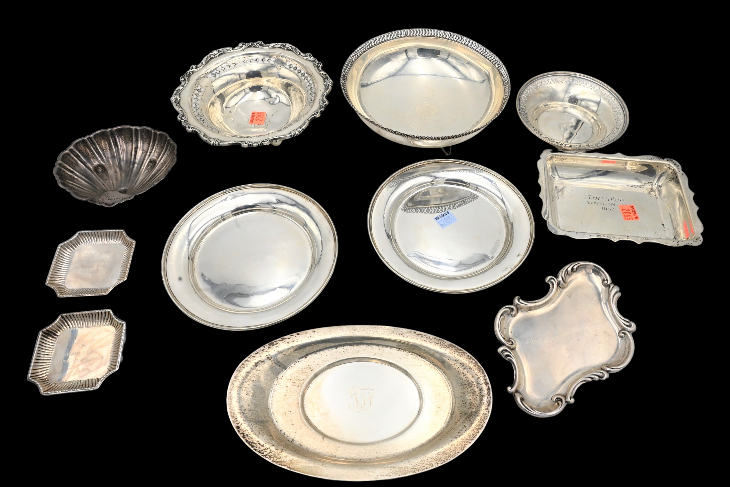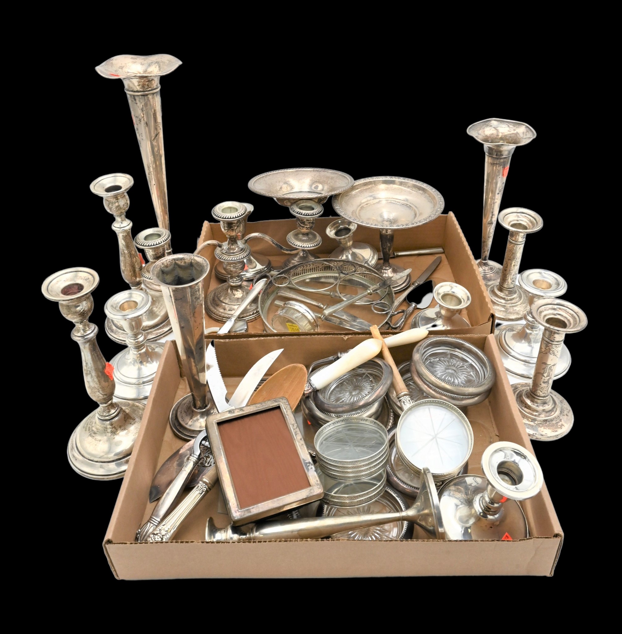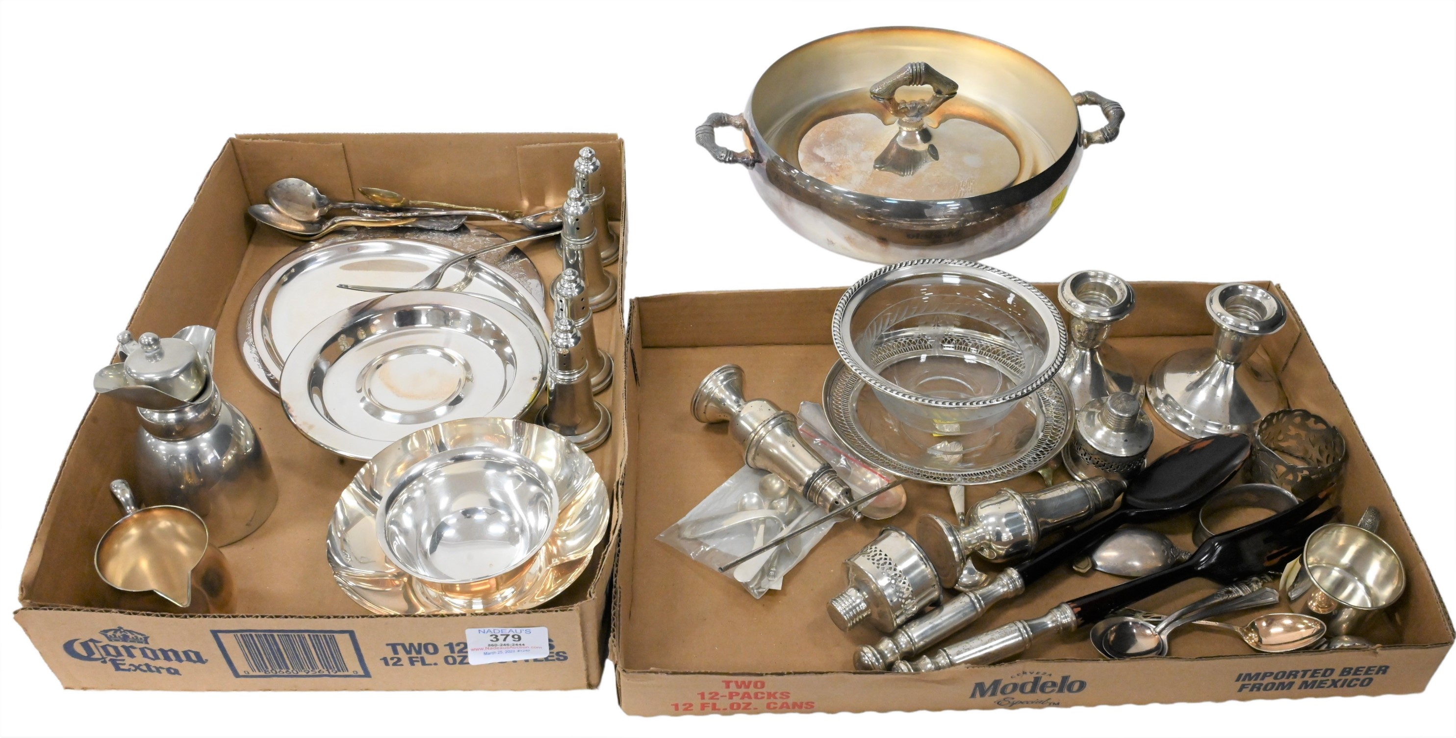 Two Tray Lots of Weighted Silver and Silverplate, to include weighted salt and pepper shakers, weighted candlesticks, serving utensils, sterling demitasse spoons, along with napkin rings, etc.