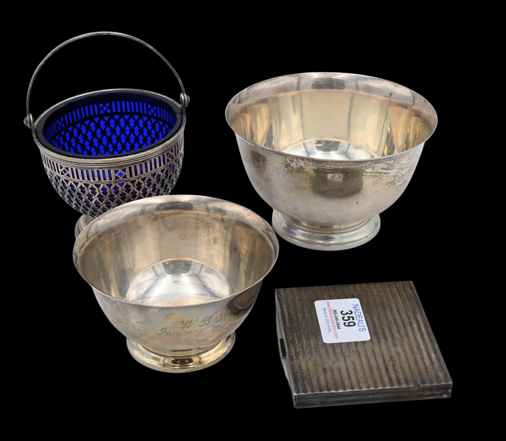 Four Piece Tiffany and Company Sterling Silver Group, to include one small Paul Revere reproduction bowl, one large bowl, one cigarette case – 3 1/2″ x 3 1/4″,along with one cobalt having attached glass lined handled basket, height 3 inches, diameter 5 inches, 18.7 t.oz. weighable.