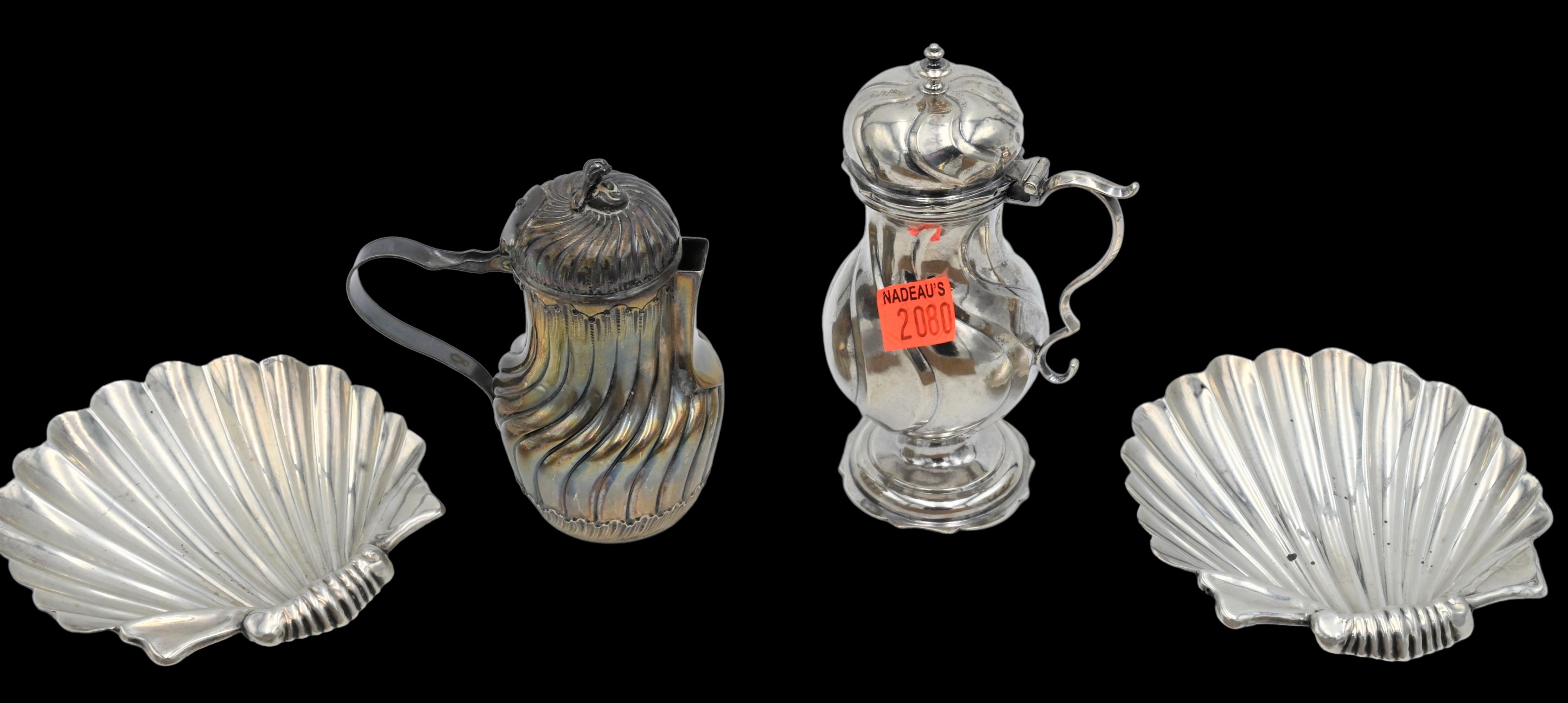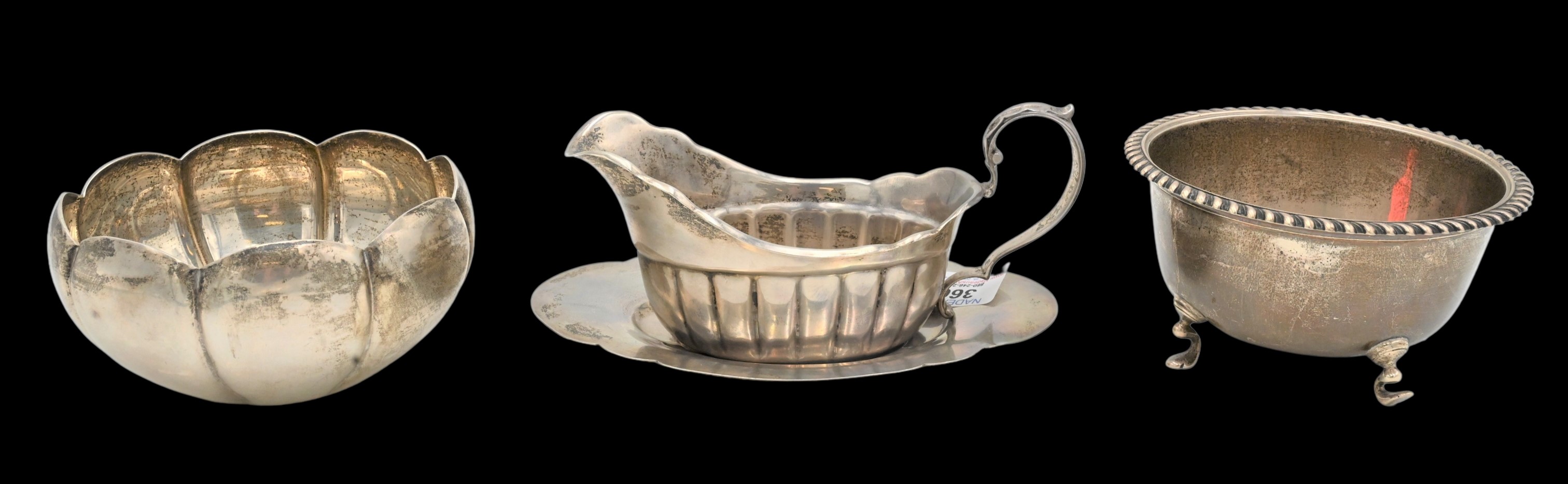 Four Piece Cartier Sterling Silver Group, to include a gravy boat and underplate, footed bowl, along with a flower form bowl, length 3 inches, diameter 5 inches, 24.6 t.oz.