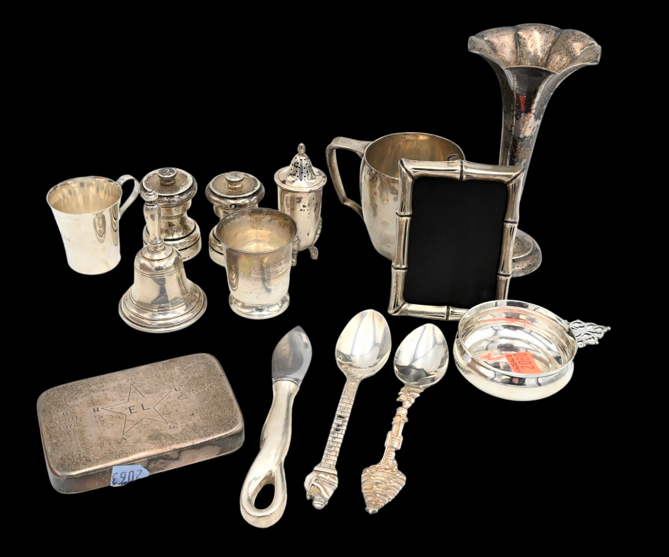 14 Piece Tiffany and Company Sterling Silver Lot, to include 3 cups, picture frame, shaker, vase, paper weight, letter opener, porringer, 2 christmas spoons, along with 2 pepper grinders, 18.8 t.oz. weighable.