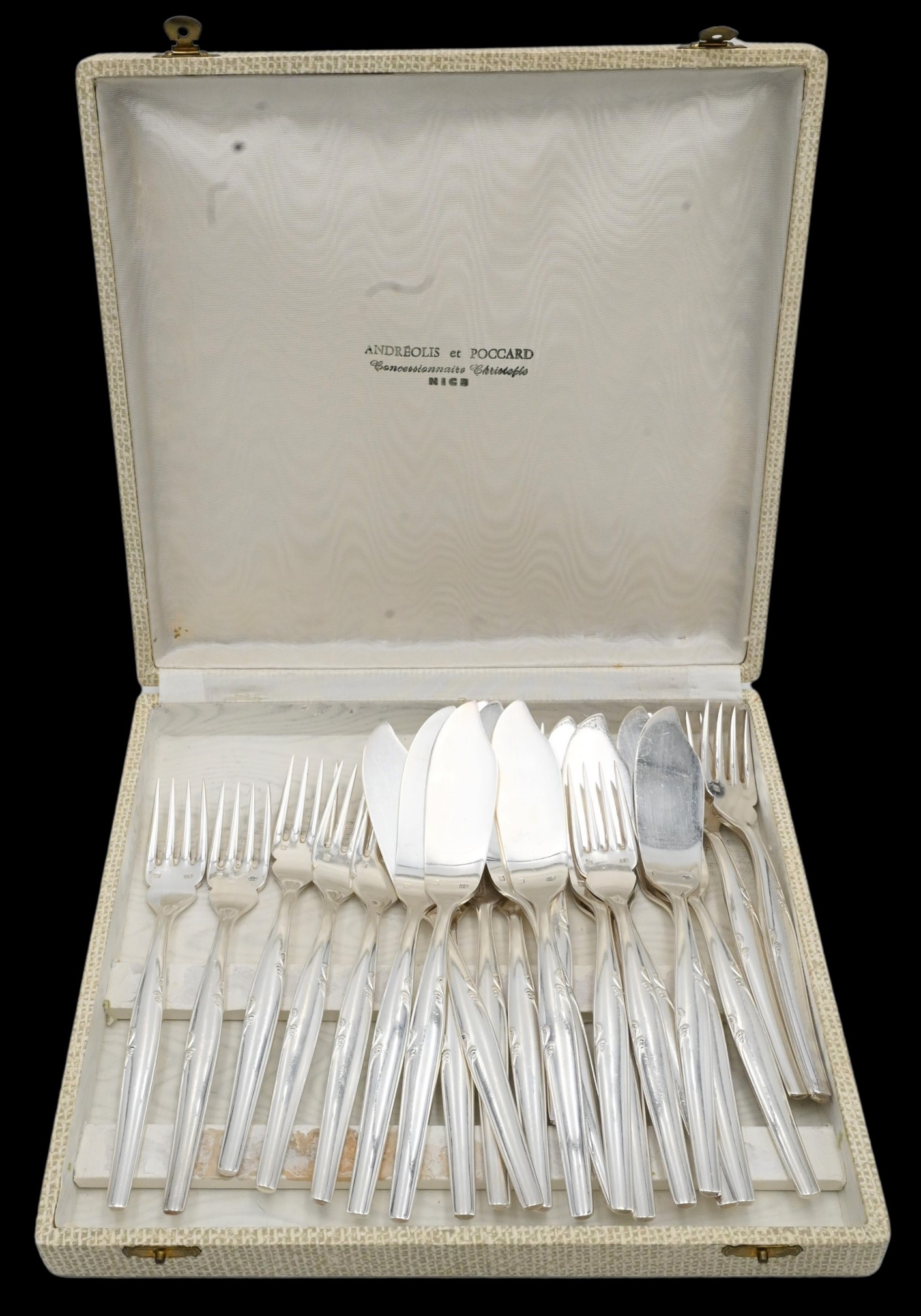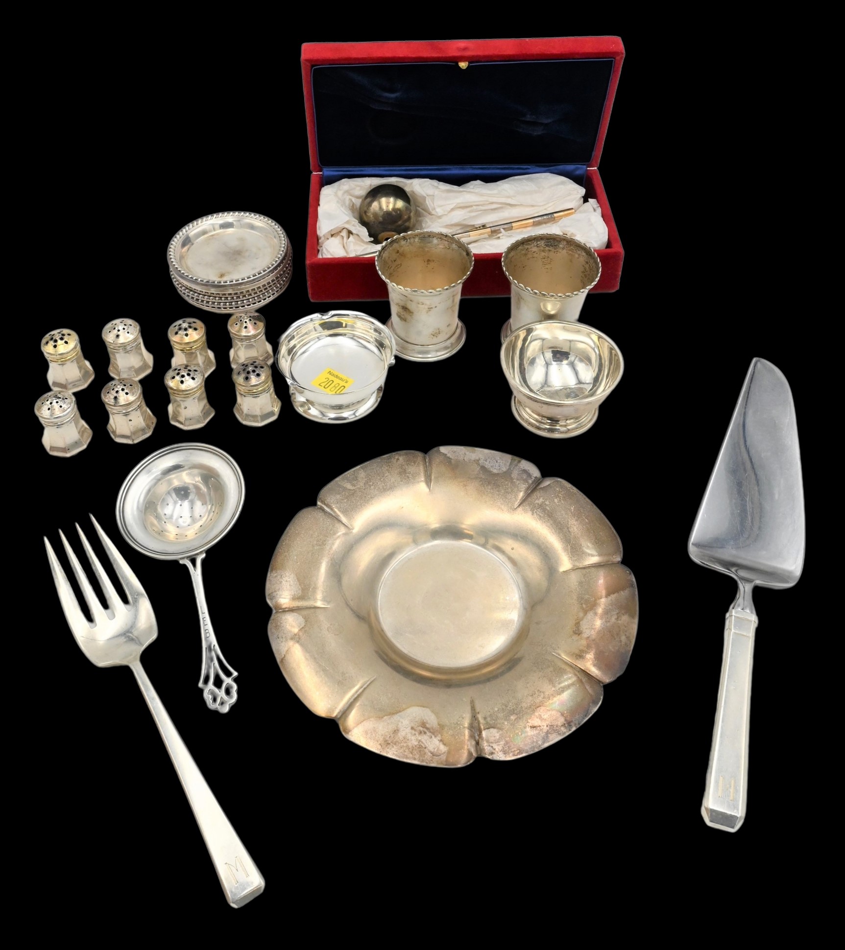 22 Piece Cartier Sterling Silver Group, to include a set of 8 shakers, 6 small plates, strainer, fork, 2 small cups, small bowl, ash tray, pen set , along with a weighted serving piece, weighable 17.3 t.oz.