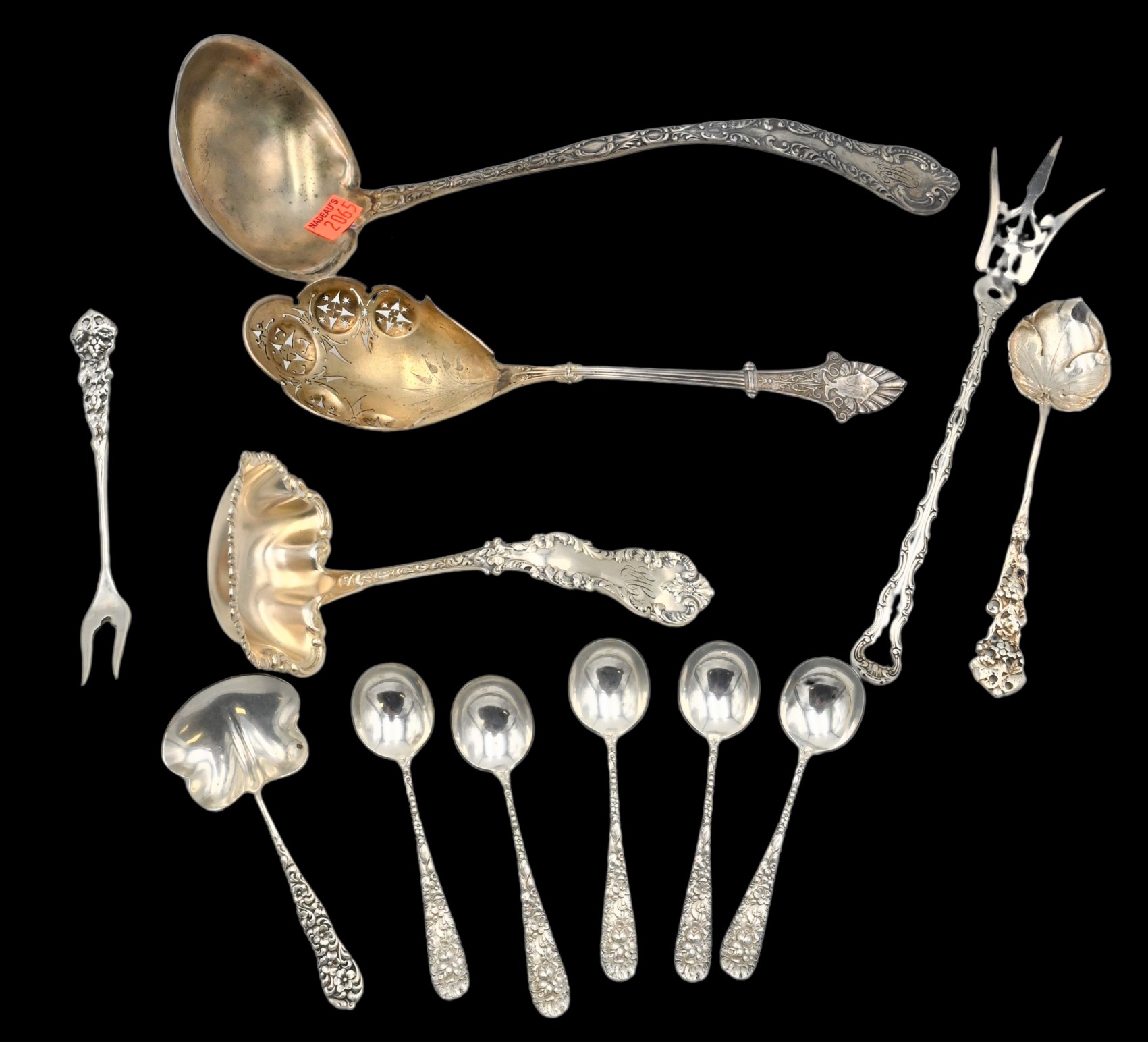 Assorted Sterling Silver Group, to include boxed set of eight demi stems, eight colored Gorham demi cups, boxed set of napkin holders, along with various other flatware, 40.5 t.oz.