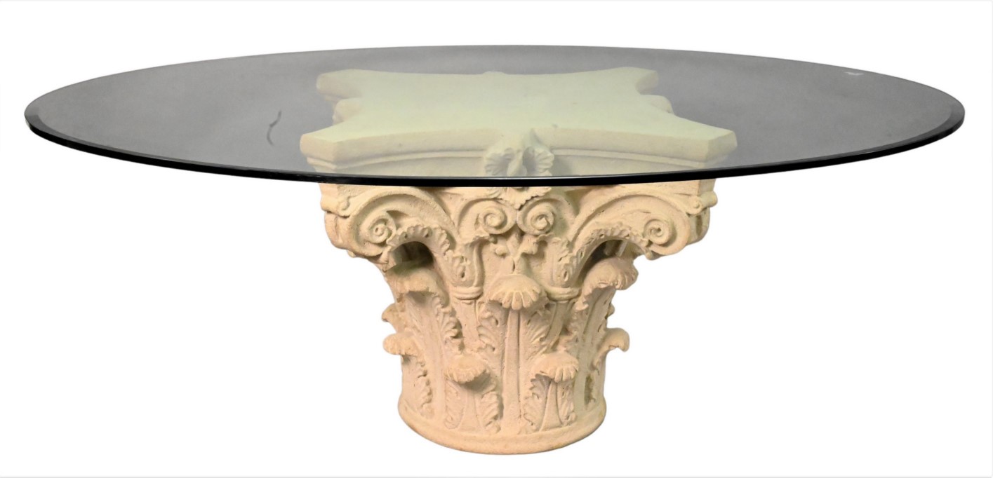 Molded Composite Capital, now mounted as a table, having oval plate glass top with beveled edge, base molded as a Corinthian column capital,