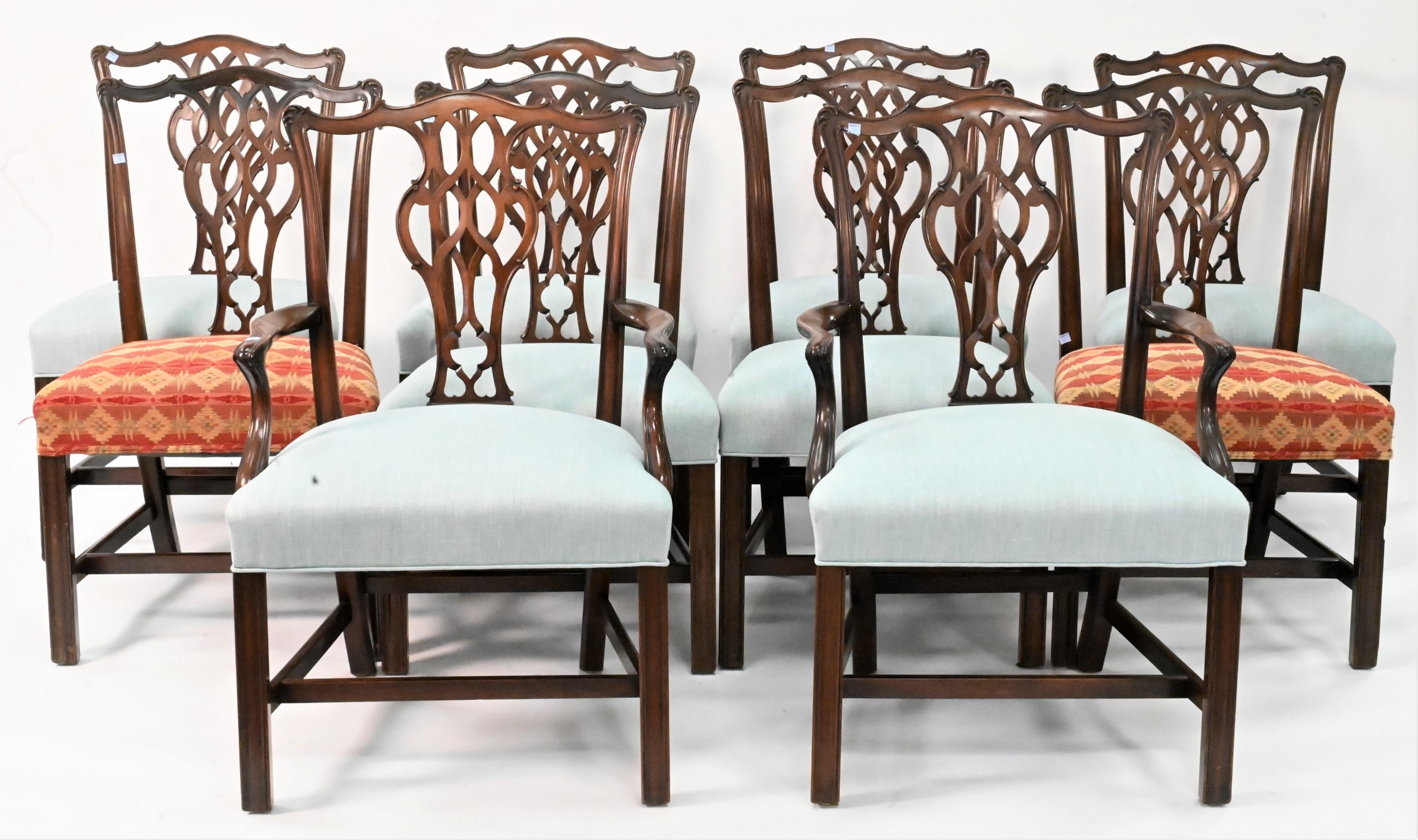 Set of 10 Schmieg & Kotzian Mahogany Chippendale Style Dining Chairs, to include two arm, eight side, all having upholstered seats, two side chairs having different seat upholstery, height 38 inches, seat length 19 inches.