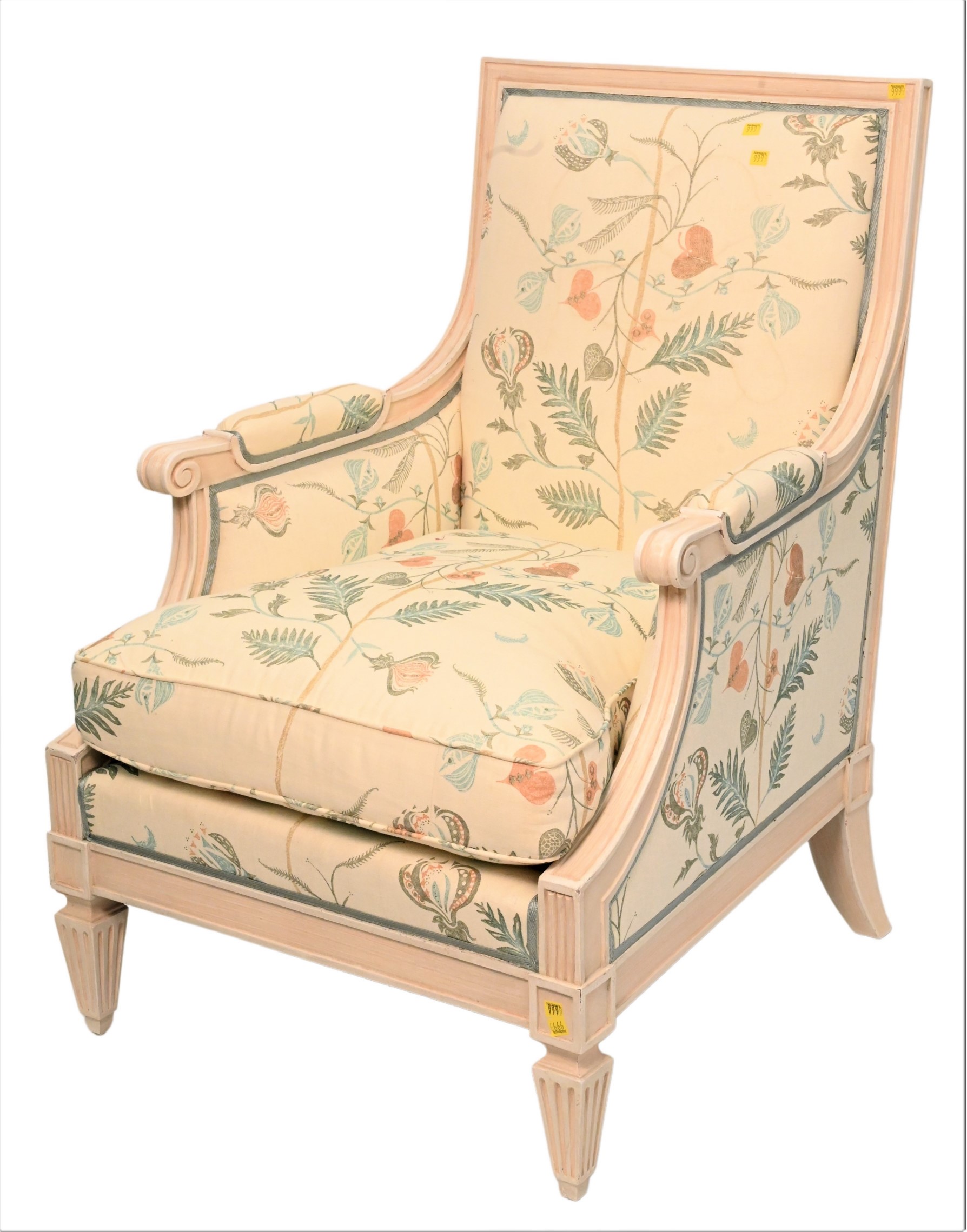 Albert Menin Interiors Custom Upholstered Club Chair, minor staining to back, along with a French style open armchair; height 37 1/2 inches, width 25 1/2 inches, depth 30 inches.