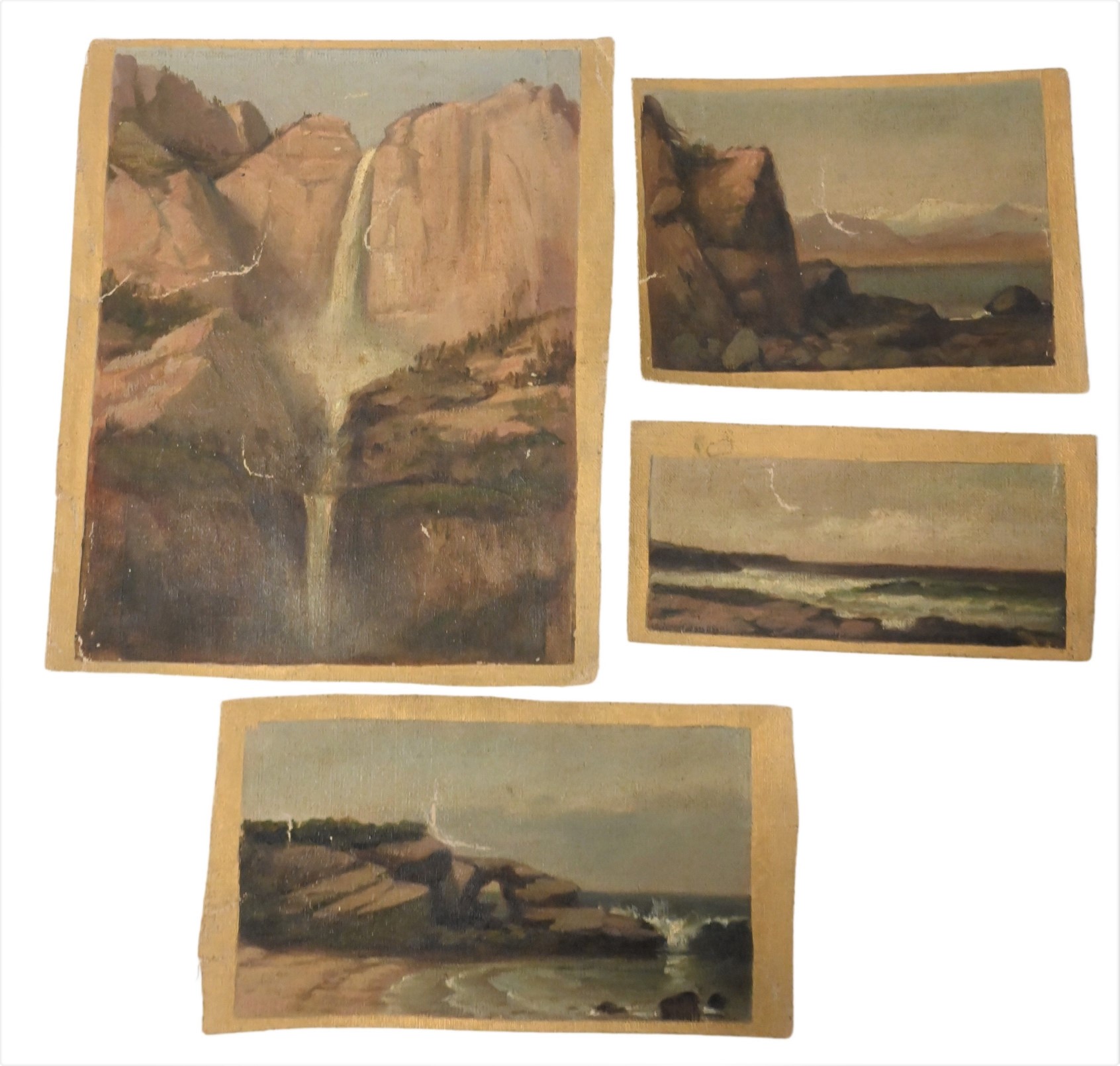 Attributed to Lemuel Maynard Wiles (1826 – 1905), four oils on canvas, studies to include a rocky seascape, 5 1/4″ x 7 1/2″; waterfall, 11″ x 9″; crashing wave against rocks, 5 1/4″ x 9 1/2″; along with a seascape, 3 3/4″ x 7 3/4″.