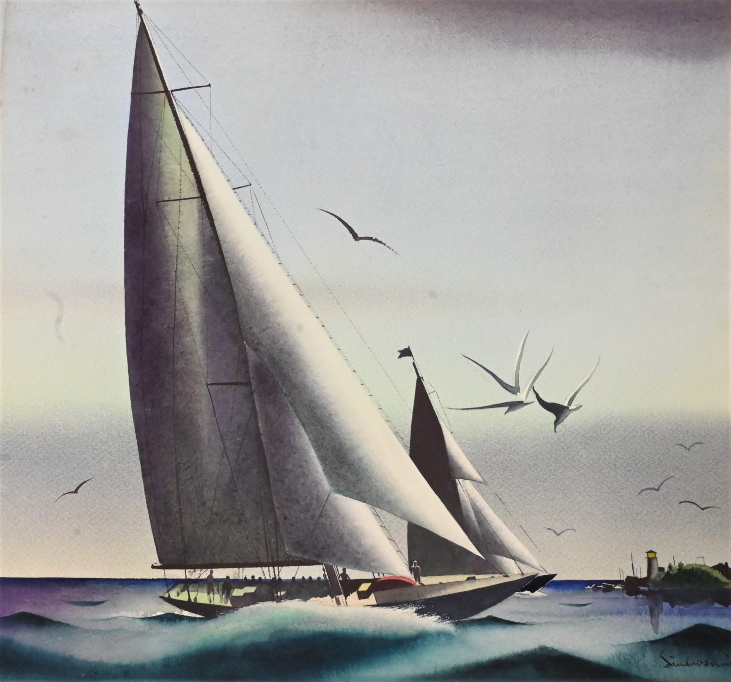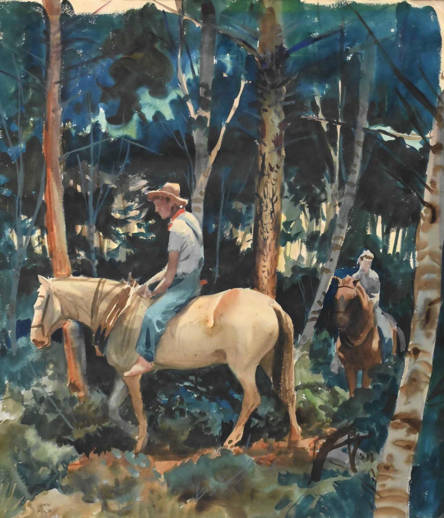 John Pike (American, 1911 – 1979), “Trail Riding Bareback”, watercolor on paper, signed lower left “John Pike”, 25 1/2″ x 21 3/4″, Casco Bay Frames Gallery label on back.