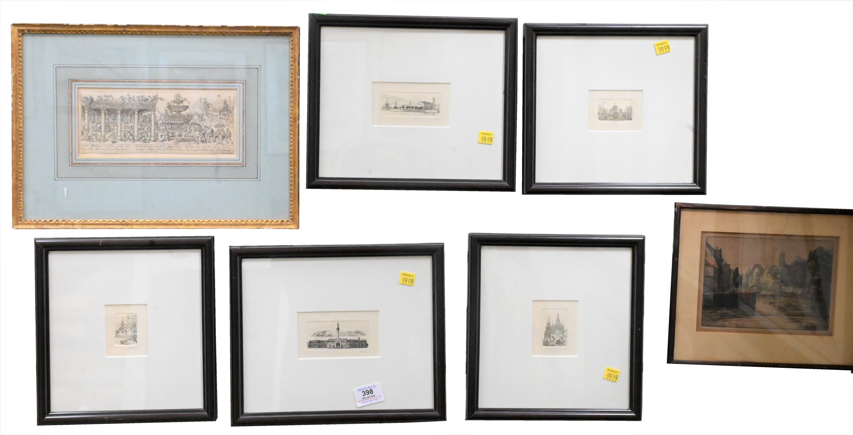Group of Seven Etchings and Engravings, to include five small etchings by “NYXOB”, a Caroline Armington etching, along with an early classical scene with figures, engraving, Quad Ludeb; largest 3 1/4″ x 8″.