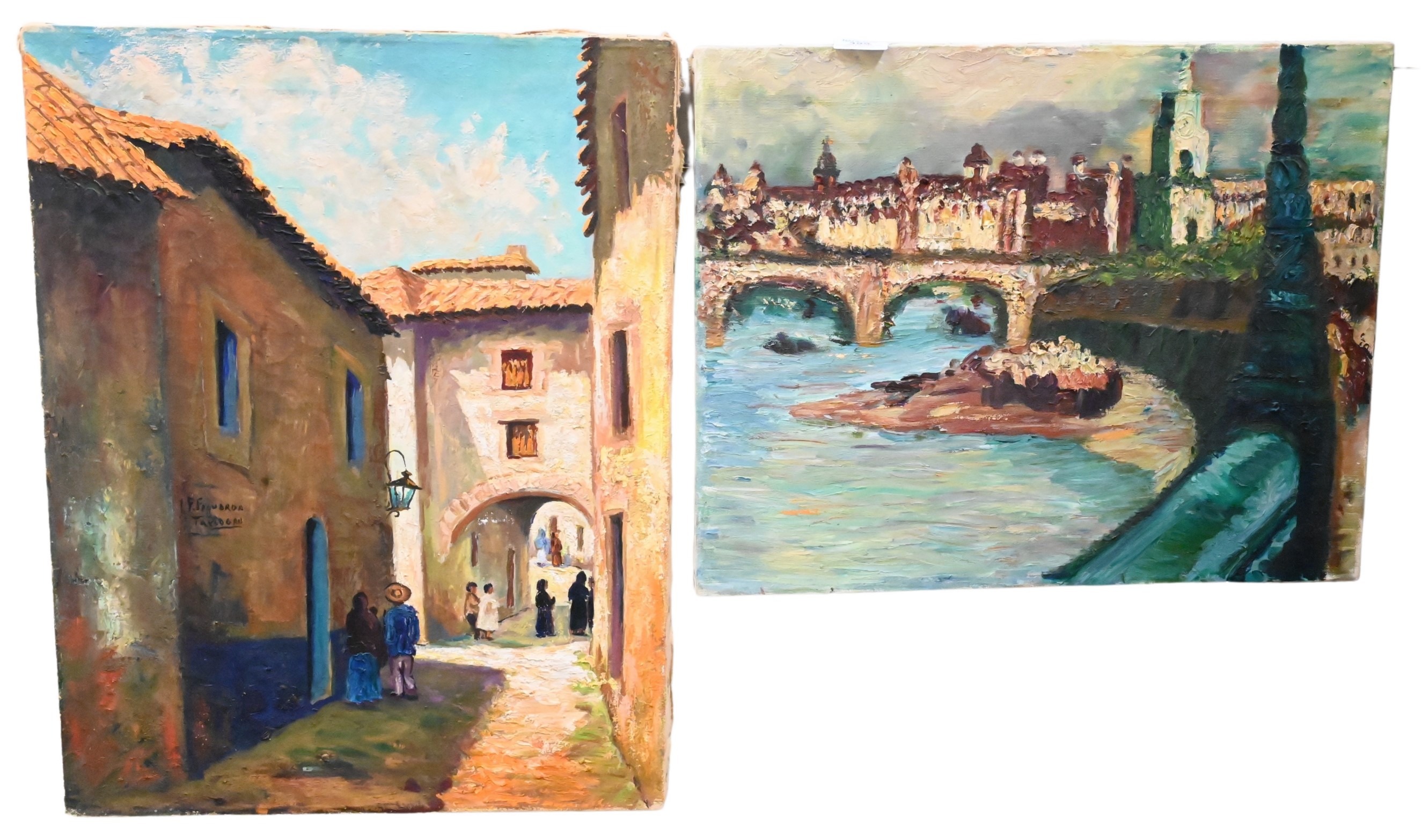 Fidel Figueroa (b. 1966), two landscapes, oil on canvas, to include a village scene, signed lower left, 23″ x 17 1/2″; along with London Bridge, unsigned, 16″ x 20″.