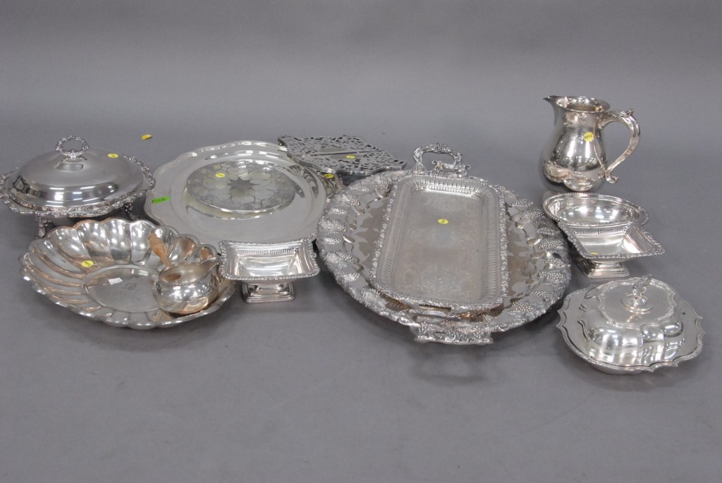 Large grouping of silverplated items three trays, two reticulated dishes, two covered dishes, pitcher, and various other items.