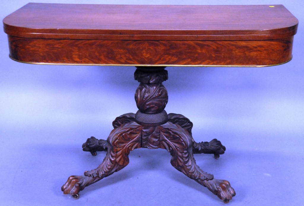 Federal mahogany game table with acanthus carved base and large paw feet.