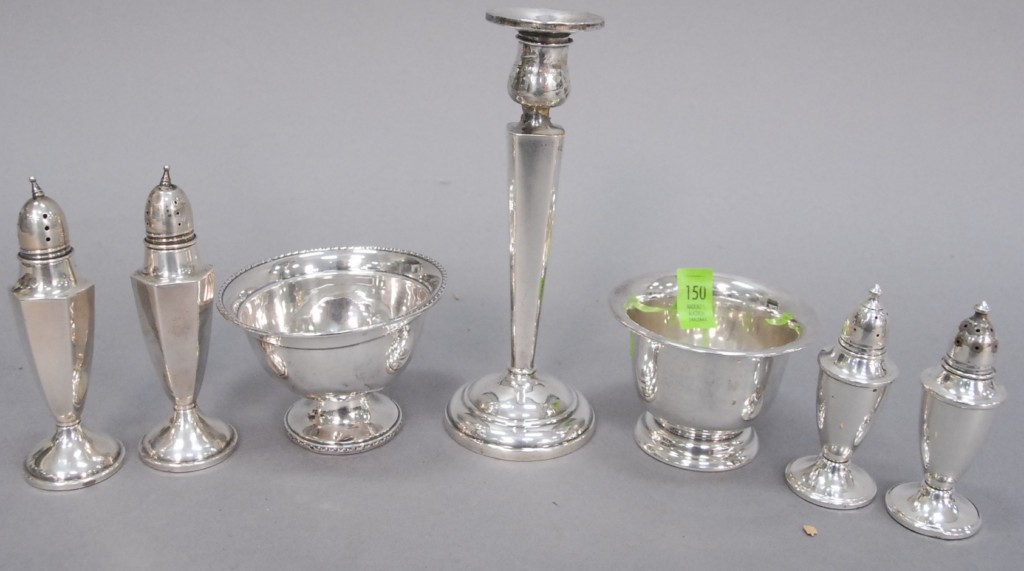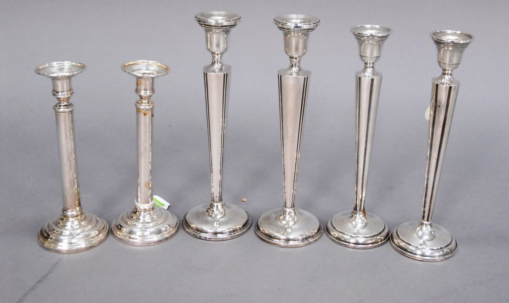 Six piece lot set of four weighted sterling silver candle sticks along with pair of weighted sterling silver candlesticks.