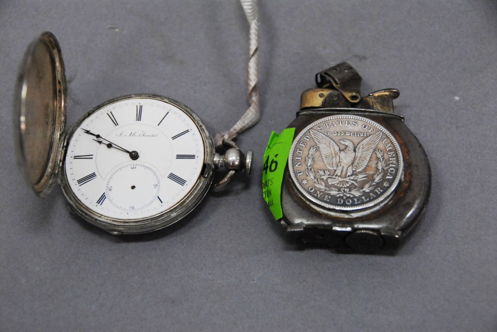 Silver watch and cigarette lighter mounted with two silver coins, one being a Morgan Silver Dollar.