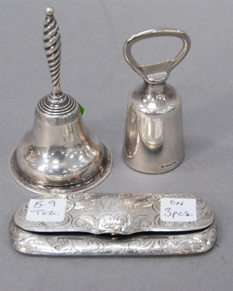 Three piece lot of silver bell, eyeglass case, and bottle opener, 5.9 t oz.