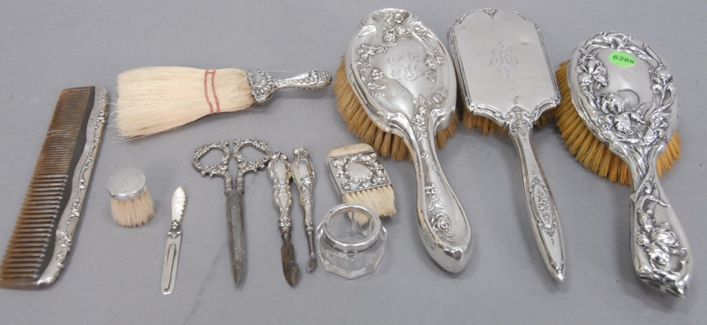 Three sterling topped pieces inkwell, match holder, and decanter.