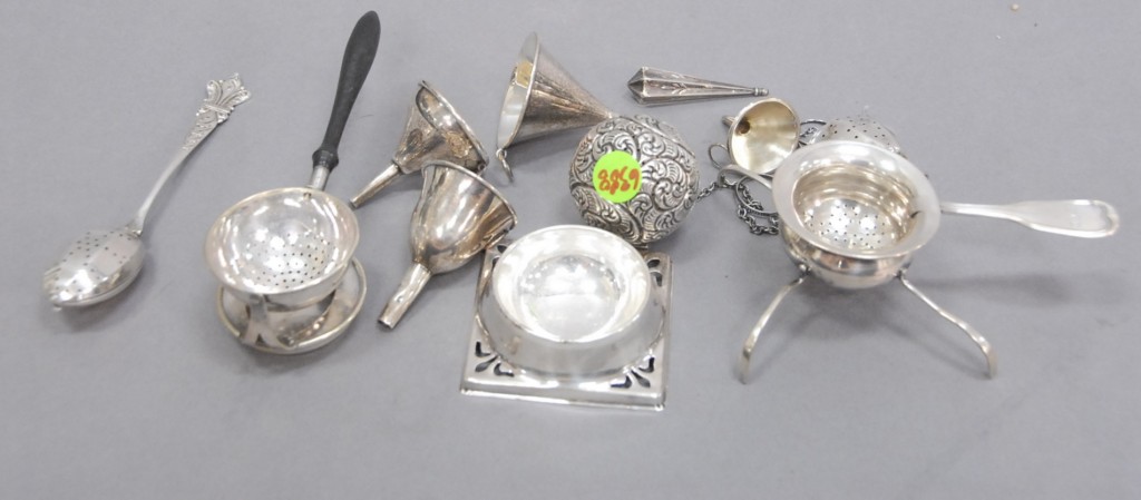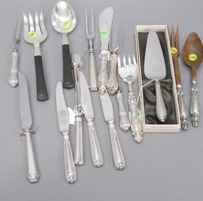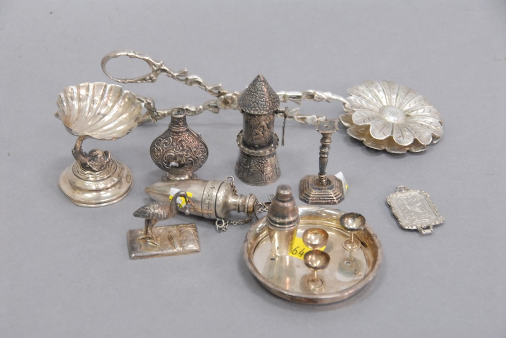 Sterling silver lot small windmill, cocktail shaker, candlestick, pair of tongs, perfume bottle, 12 t oz.
