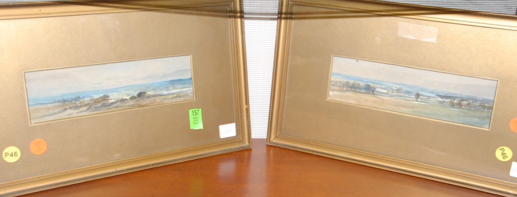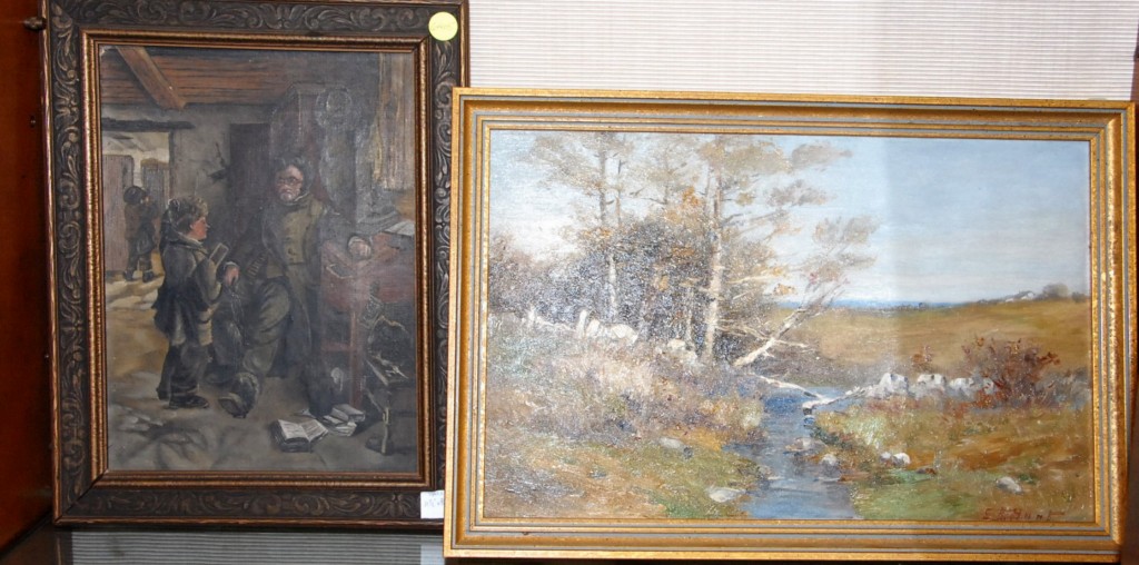 Two paintings landscape with small stream, European interior scene, oil on board and oil on canvas, signed lower right E. K. Hunt, 11 x 8 and 10 x 16.