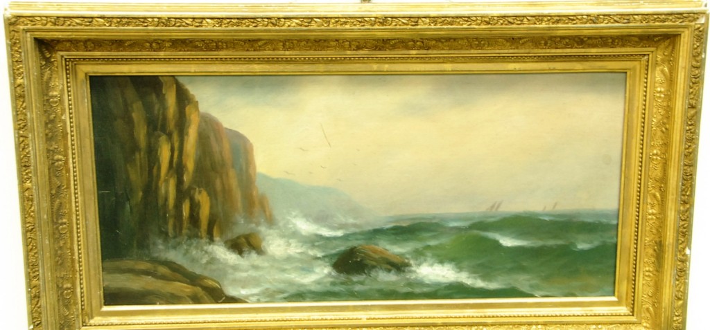 Oil on board Rough ocean cliff side unsigned, 12 x 26.