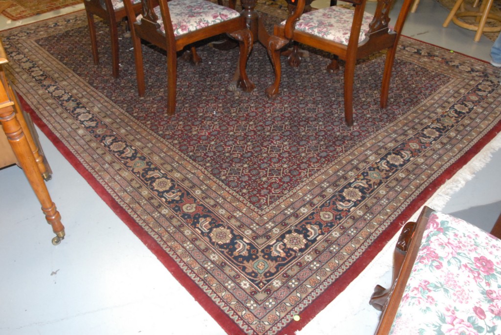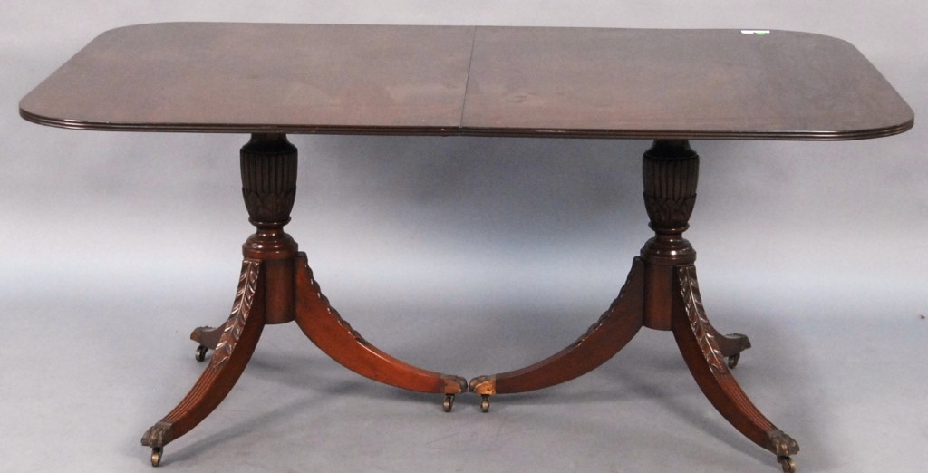 Custom mahogany two part dining table on pedestal bases with one extra leaf, ht. 30in. lg. 67in. wd. 47in. plus one 18 leaf.