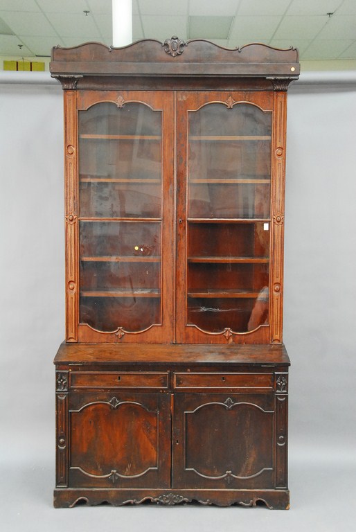 Victorian mahogany bookcase secretary desk in three parts, top section being a crest over middle with two glass doors over base with flip lid writing surface, drawer and two doors. ht. 106in. wd. 56in.