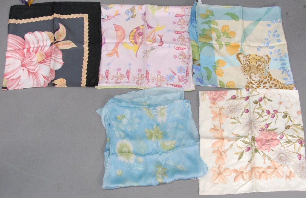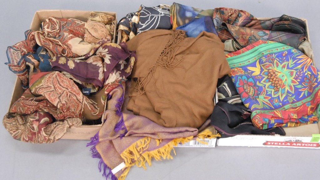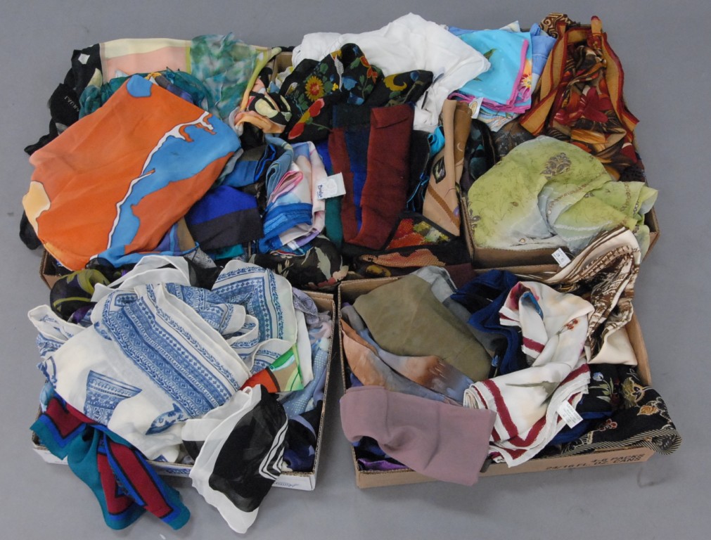 Five boxes of scarves Talbots, Johnasen, Dana Buckman, Amet Ladoue, and Joani Fiulio, approximately 60 pieces in total.