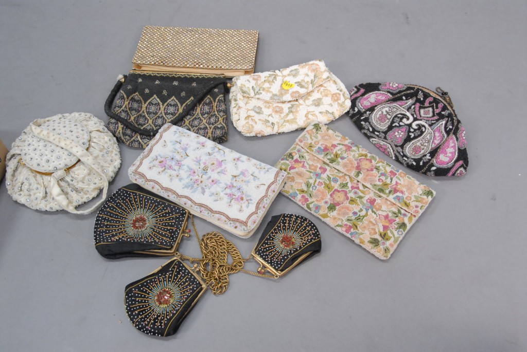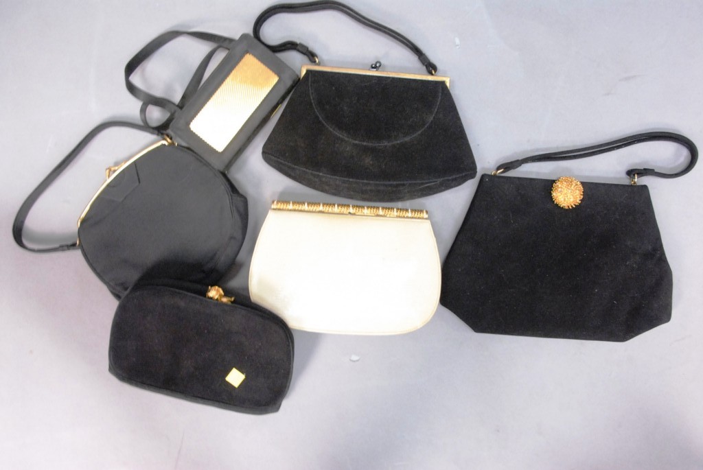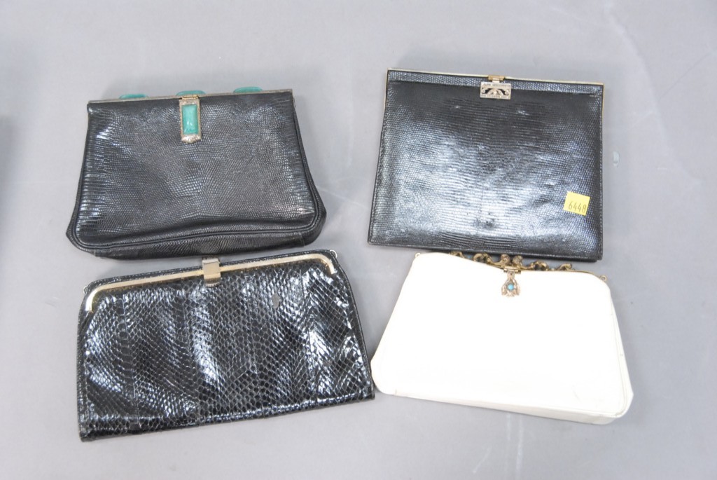 Six purses Koret clutch bag black and gold flower with jeweled clasp, Koret clutch bag black with gold flower clasp, Koret clutch bag lizard skin, Koret purse with gold jeweled encrusted frame and clasp, unmarked gold metal purse with silk handle and case, Coblentz black purse, and Dorian purse.