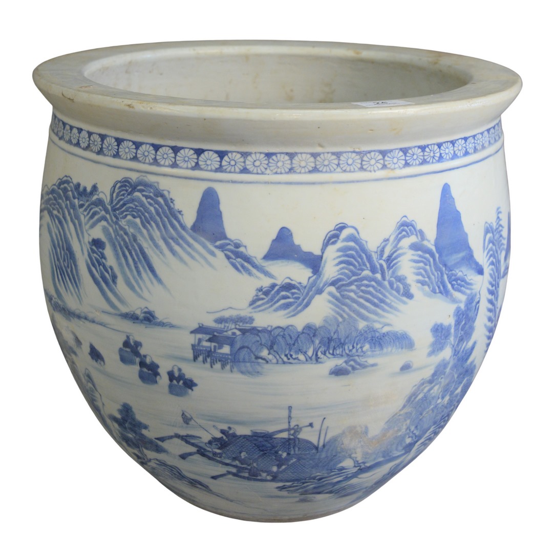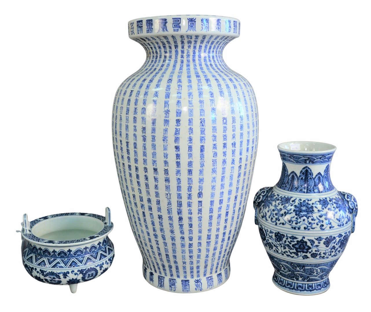 Three Piece Lot to include a Chinese blue and white tripod censer having a six character mark to the underside; a blue and white vase also having a six character mark; along with a blue and white vase decorated with characters, unmarked; tallest height 18 1/2 inches.