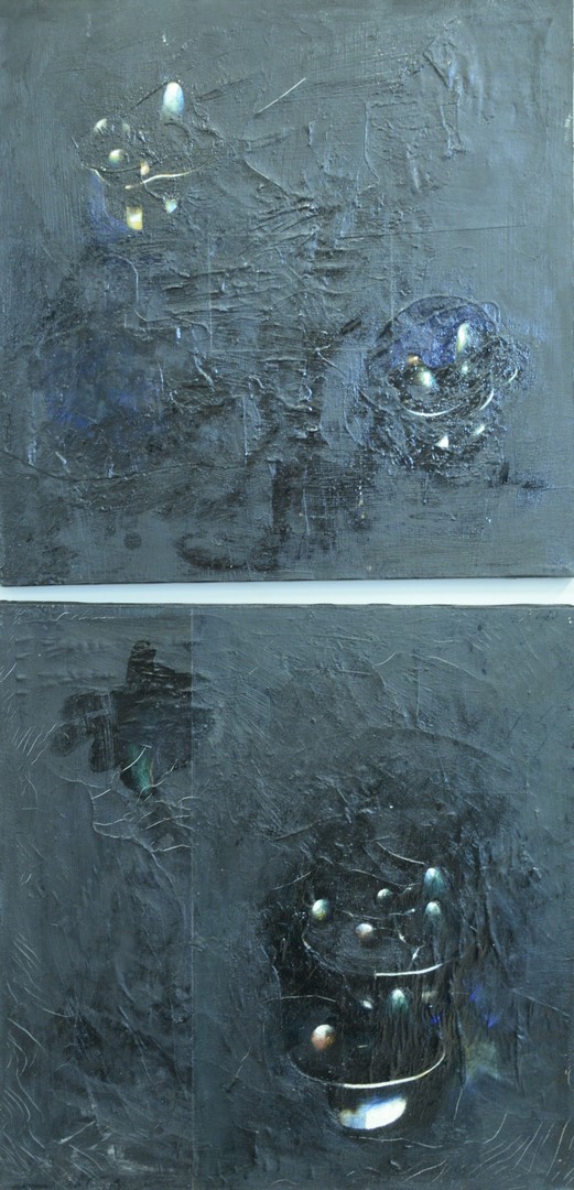 Kevin Larmon, (American, b. 1955), 4×4; and 223 (two works), 1985-1986, oil on canvas; each signed, titled, and dated on the reverse, each 18″ x 18″, both having a Curt Marcos Gallery label on the reverse.