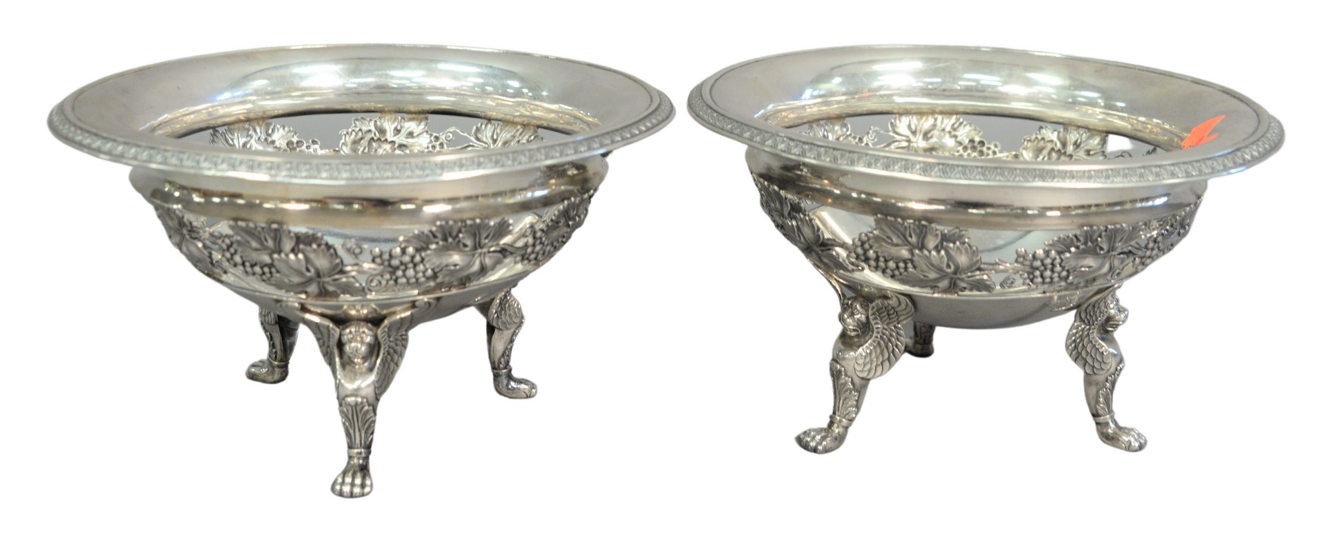 Fletcher and Gardiner, Philadelphia, pair of silver bowls on winged lion legs on paw feet, height 5 1/2 inches, diameter 9 1/2 inches, 64.5 t.oz. Provenance: From a Newport, Rhode Island historic home, in the same family since 1761.