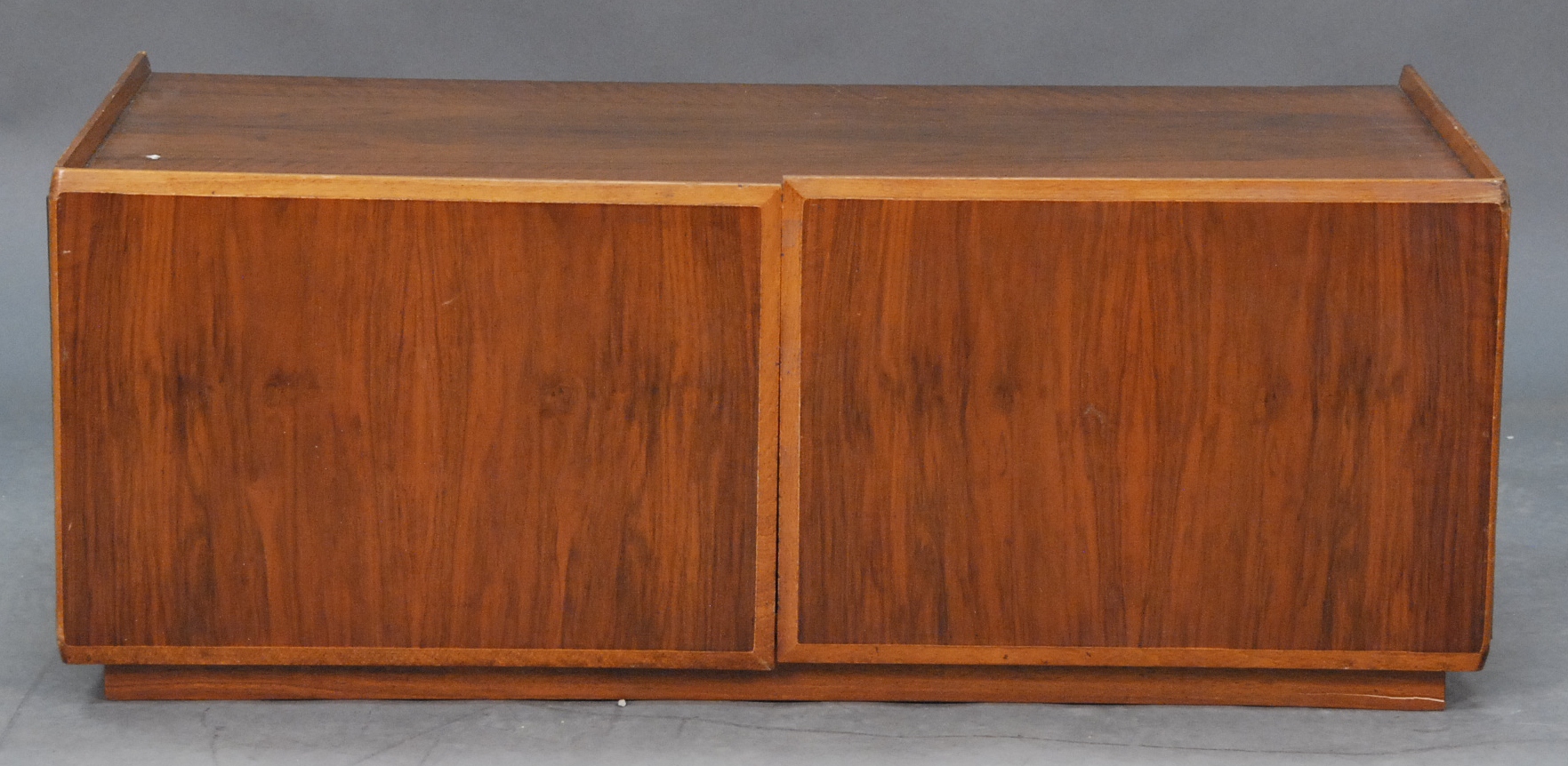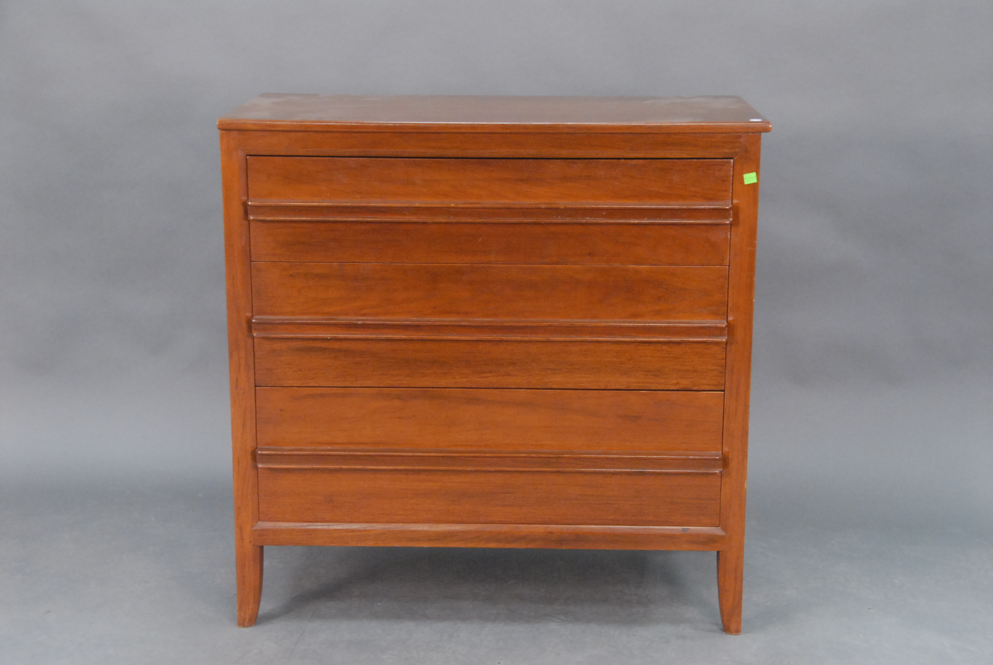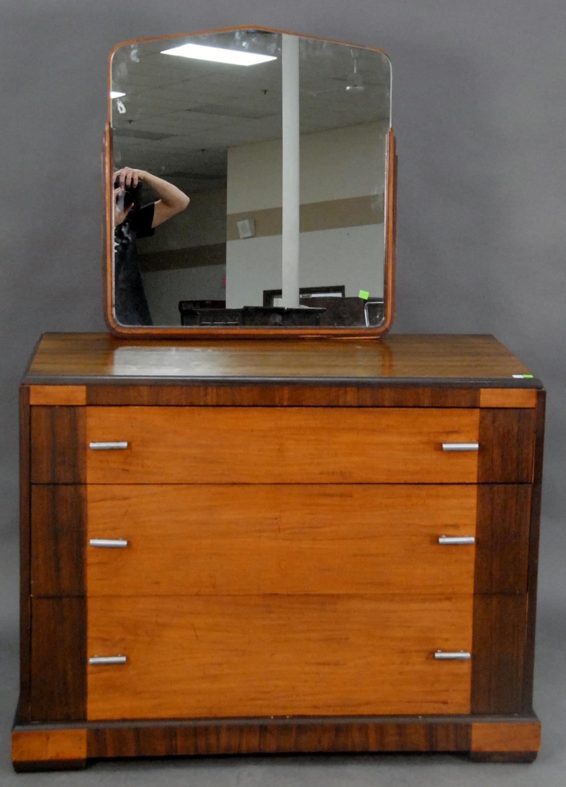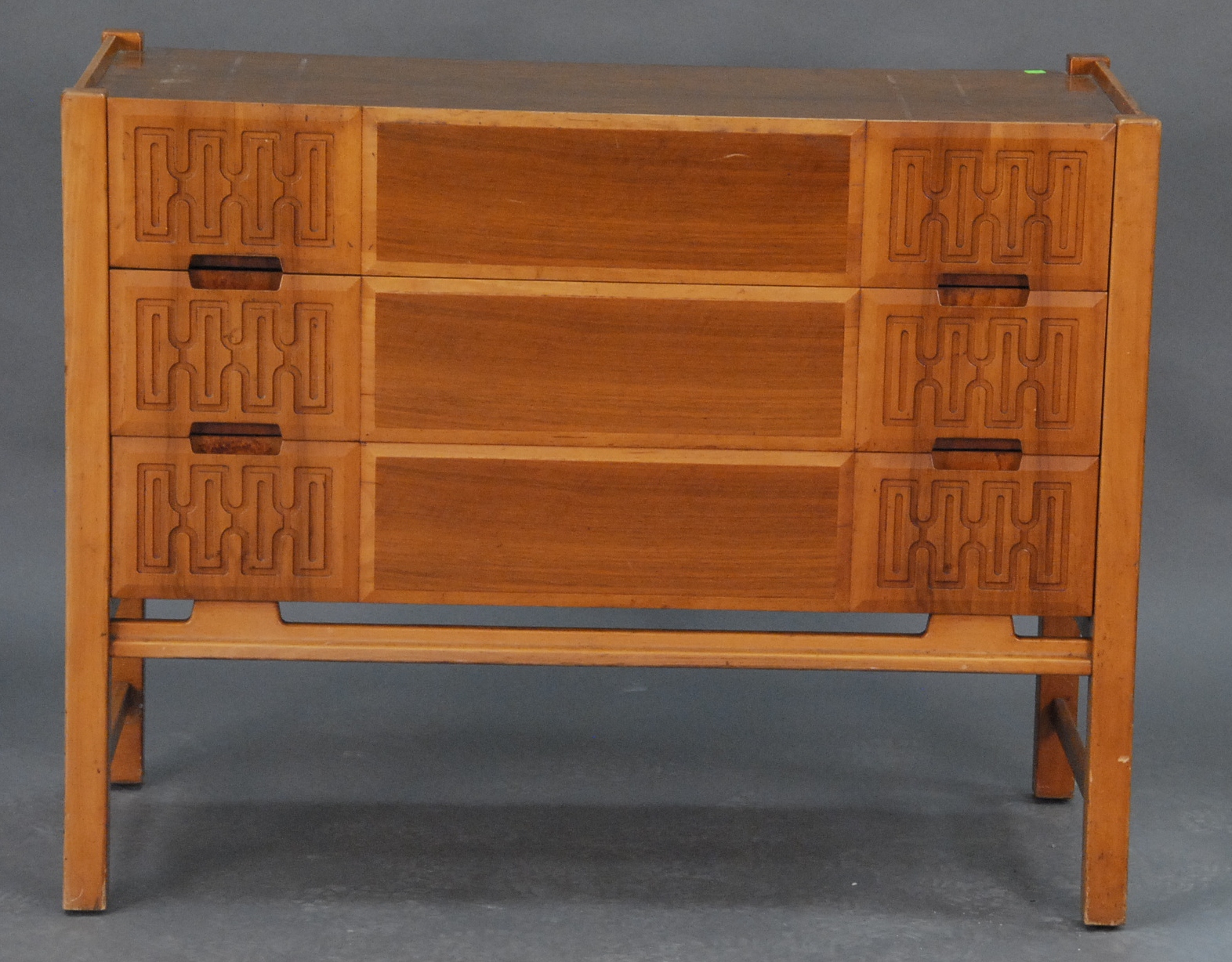 Swedish modern two piece cabinet by the Urban Furniture Company of mixed woods, the upper section with two doors and the lower half with three drawers the reverse of which is marked ‘Made in Sweden, Factory #14, and an indiscernible logo’ as well as a paper label ‘Urban Furn. Co. B. Altman and Co., circa 1949, ht. 32in. wd. 42in.