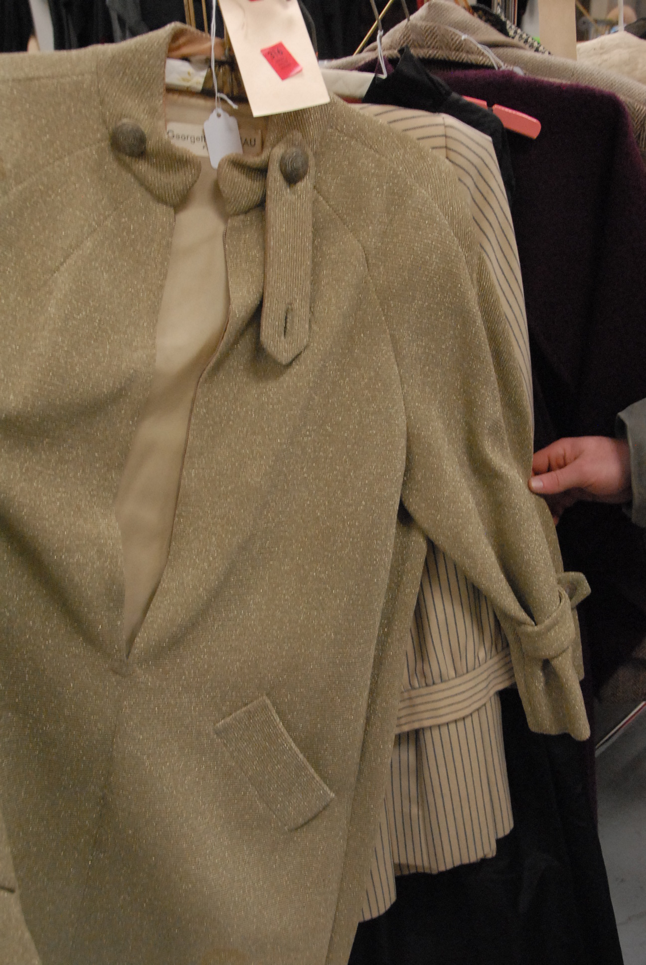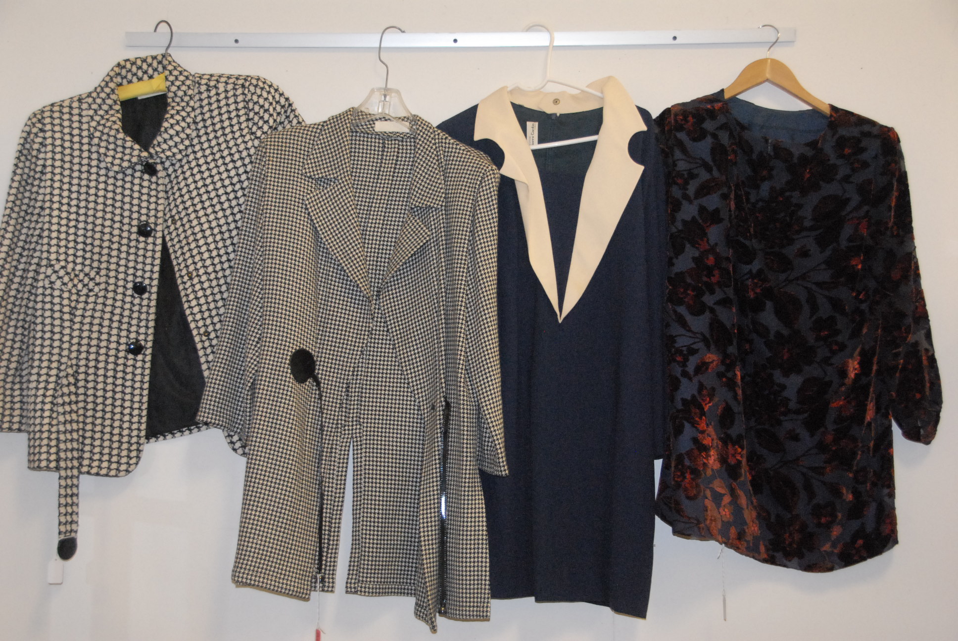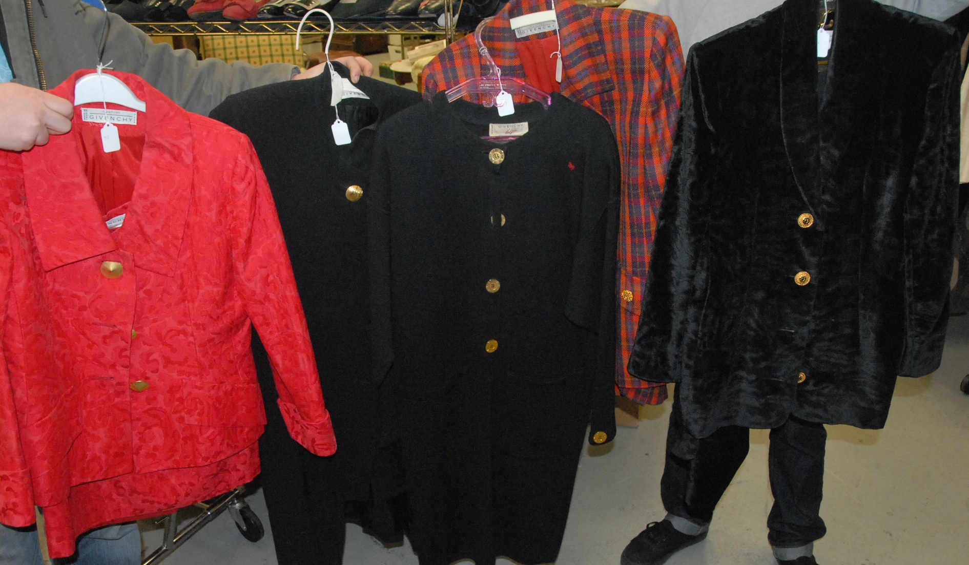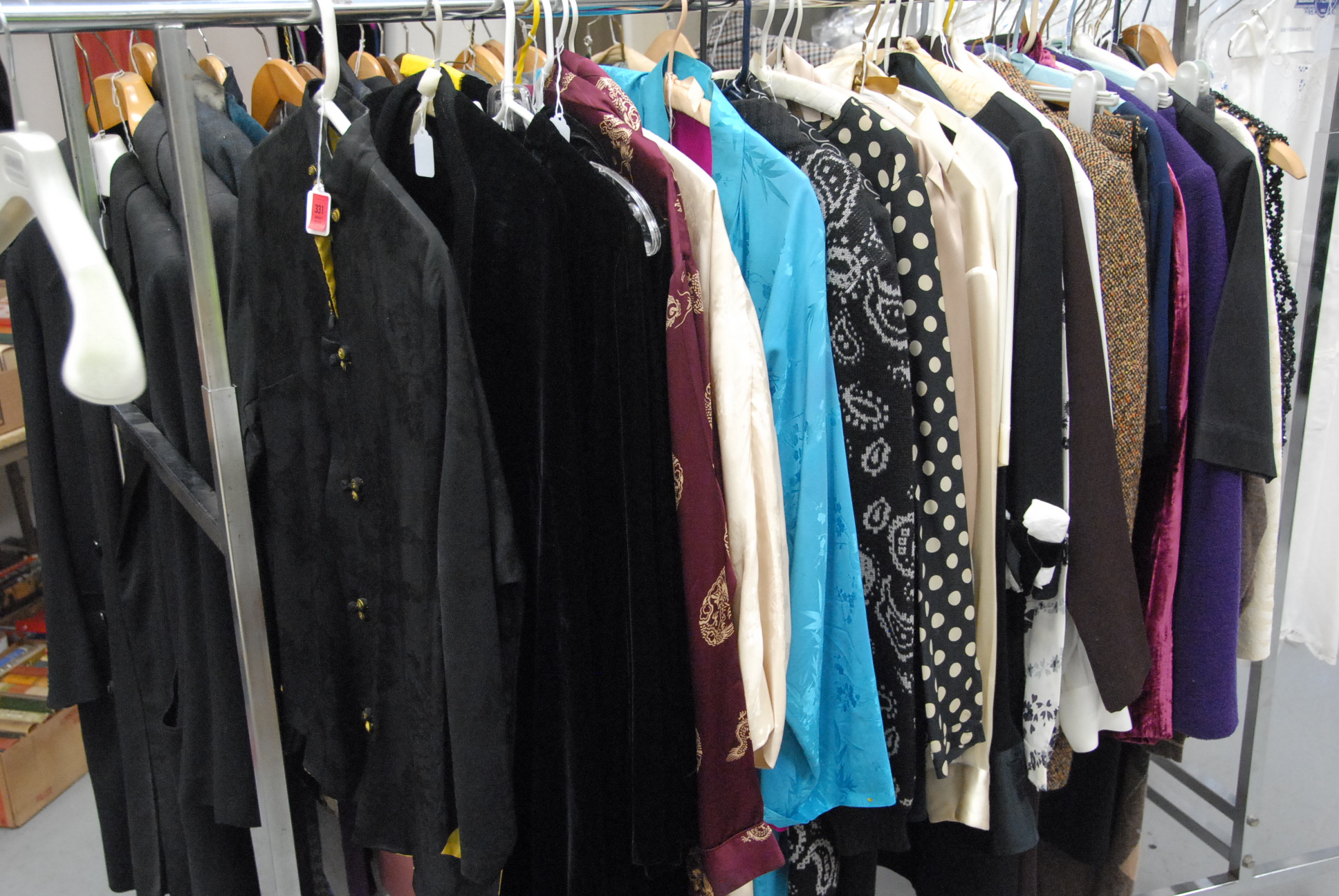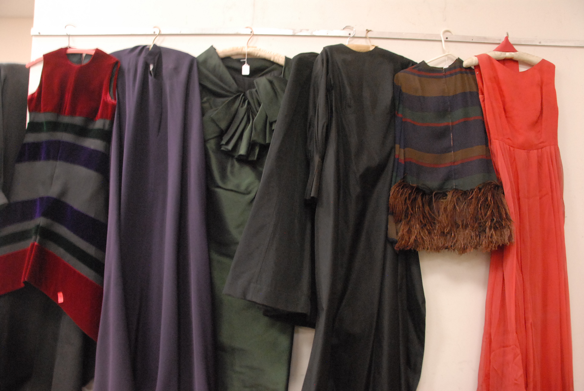 Entire rack, both sides, of men’s and woman’s clothes including Gump’s silk shirts, Chinese Arts & Crafts silk shirt, Yve Saint Laurent, and various other clothes including beaded woman’s vest.