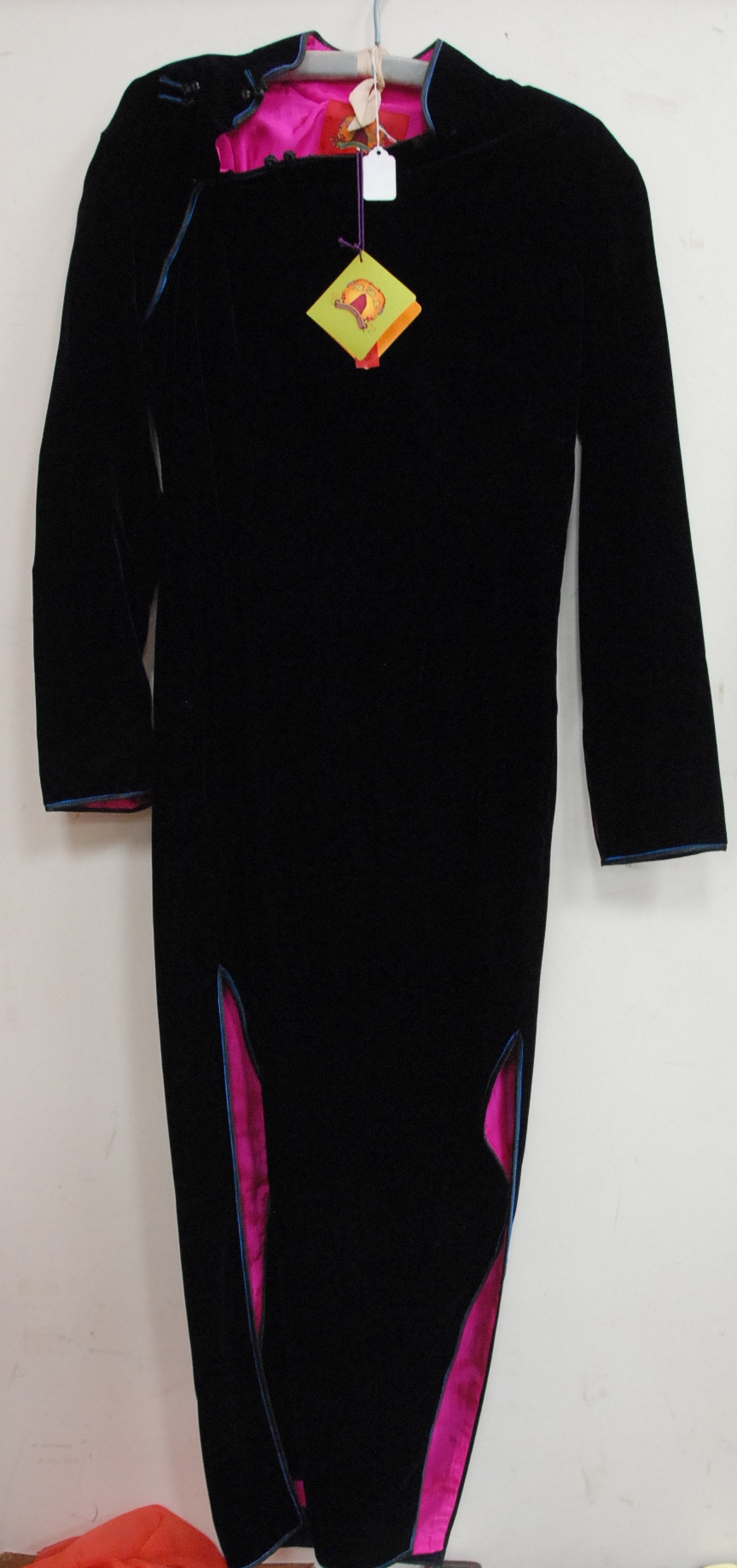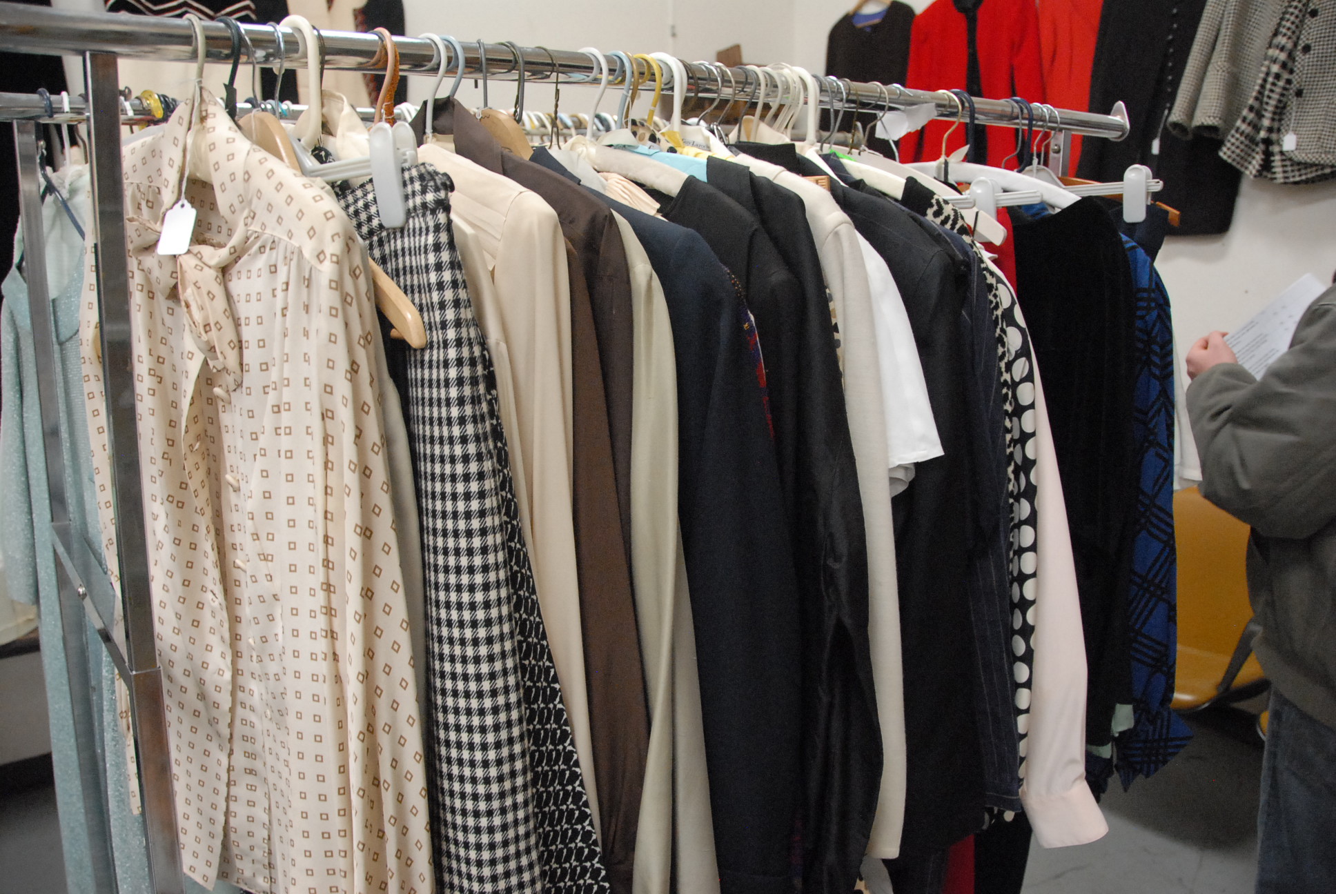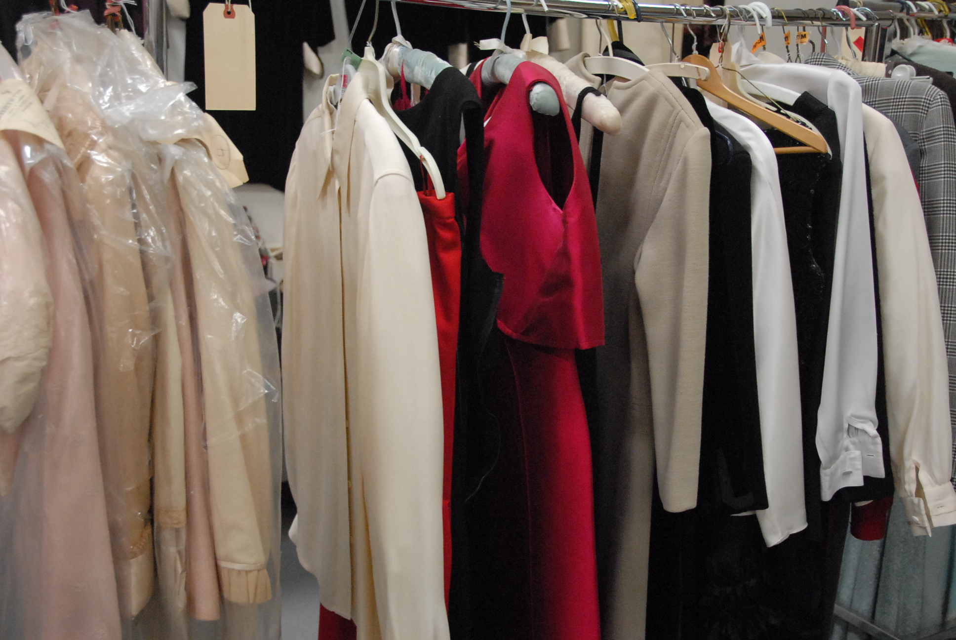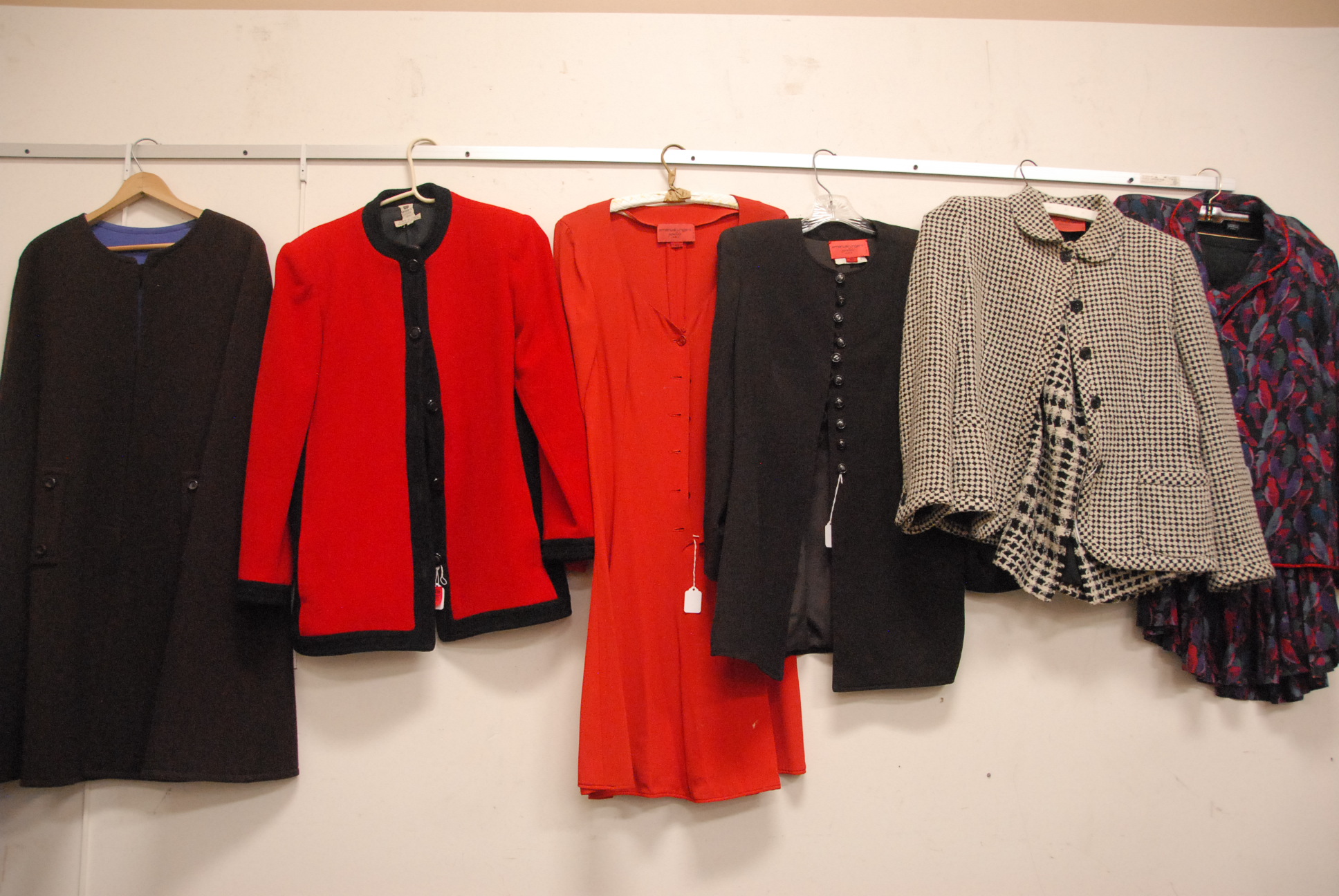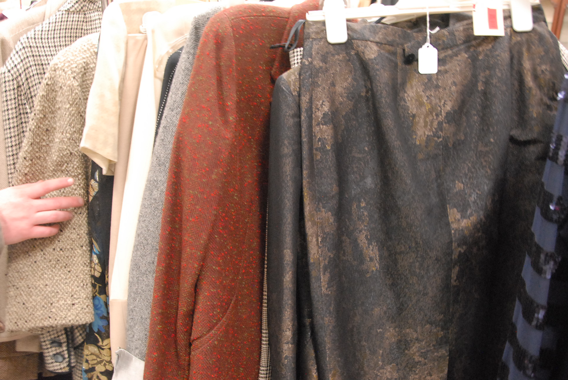 Entire rack, both sides, of men’s and woman’s clothes including Gump’s silk shirts, Chinese Arts & Crafts silk shirt, Yve Saint Laurent, and various other clothes including beaded woman’s vest.