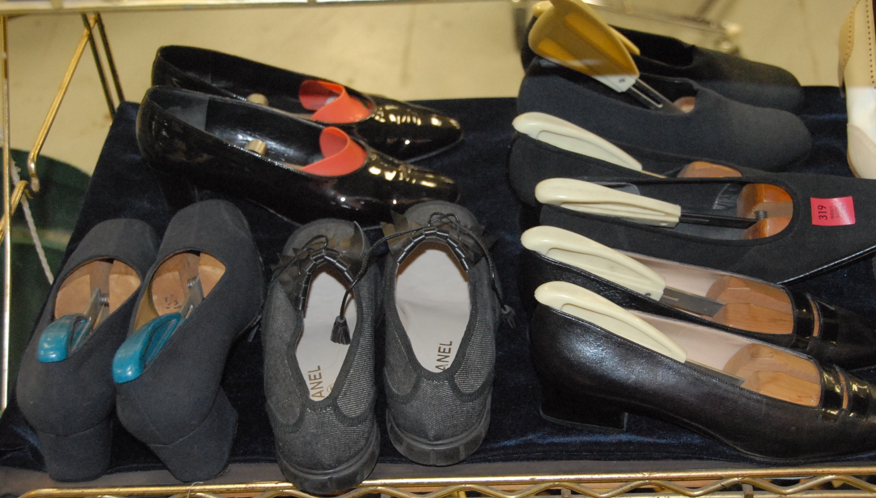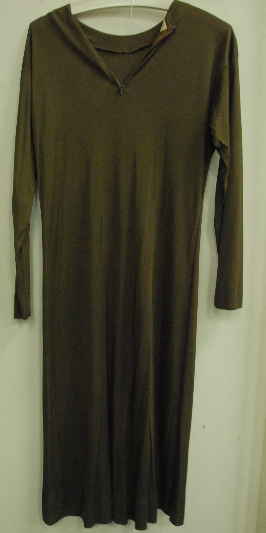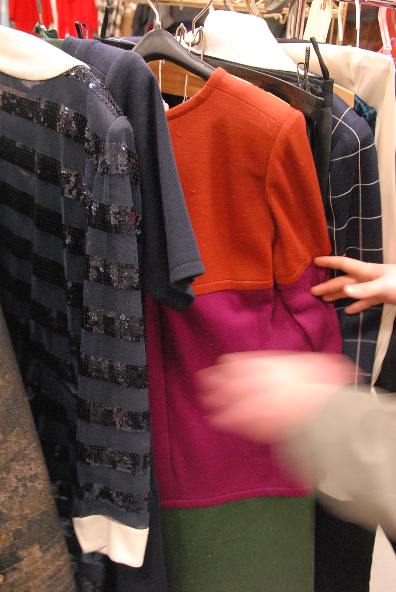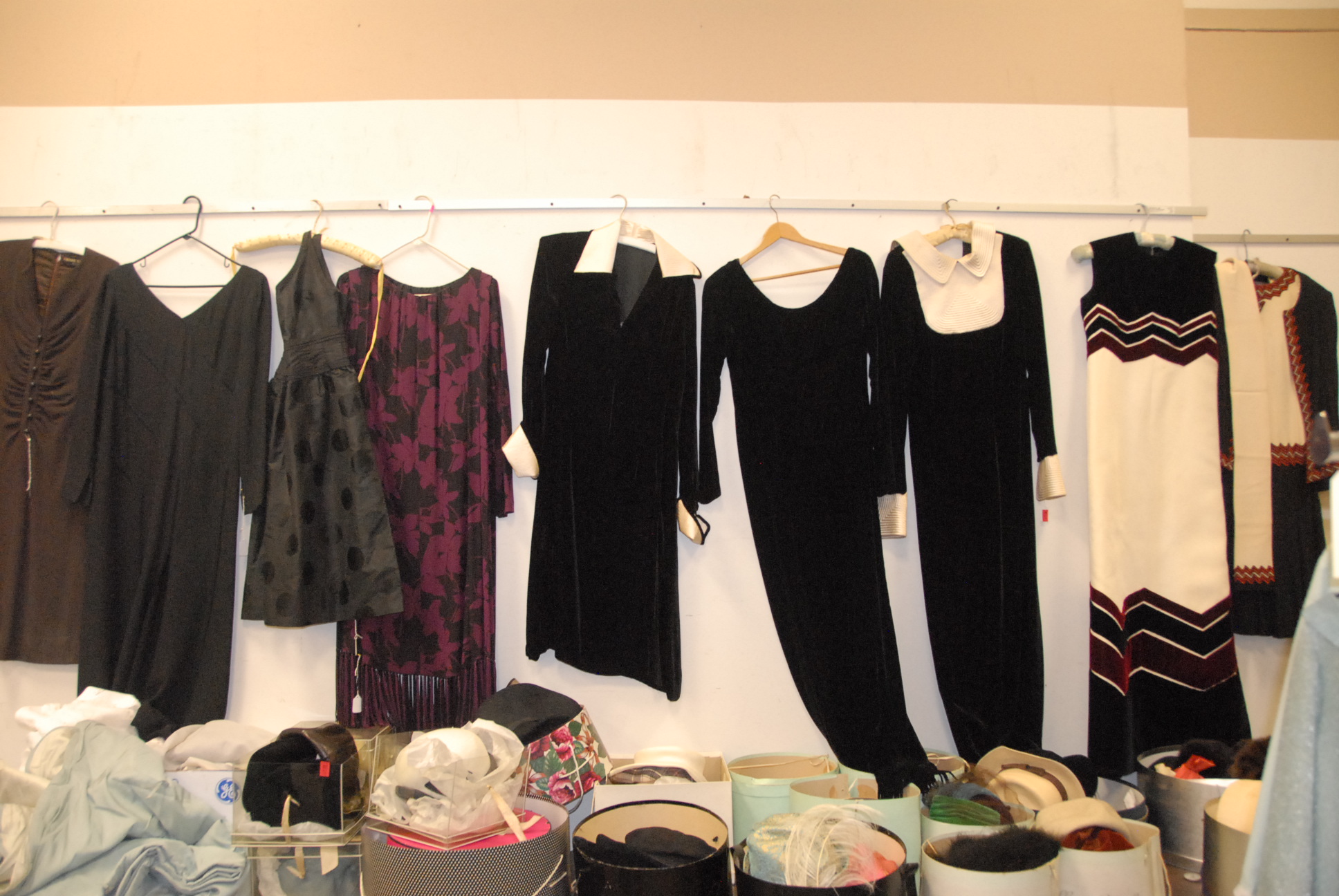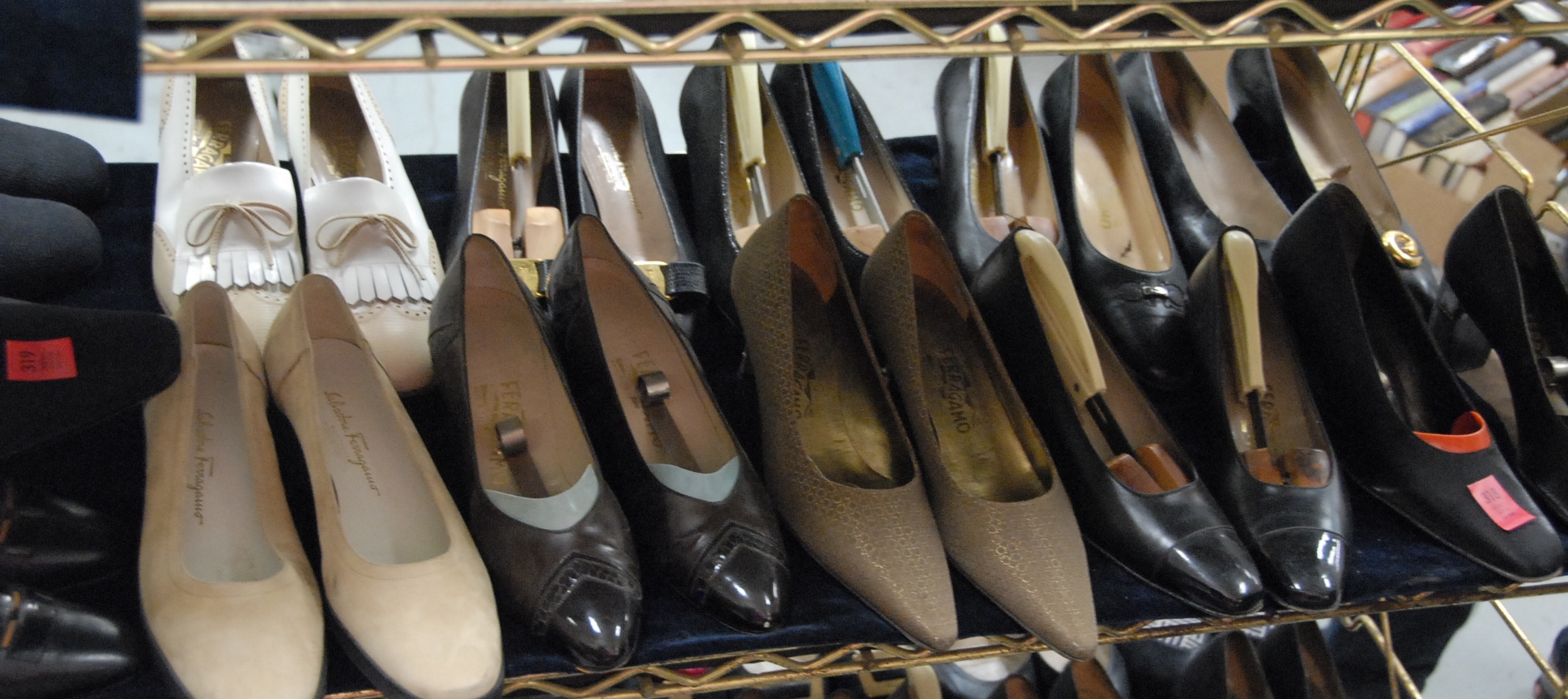 Entire rack, both sides, of men’s and woman’s clothes including Gump’s silk shirts, Chinese Arts & Crafts silk shirt, Yve Saint Laurent, and various other clothes including beaded woman’s vest.