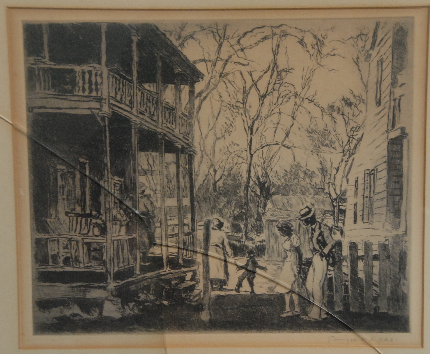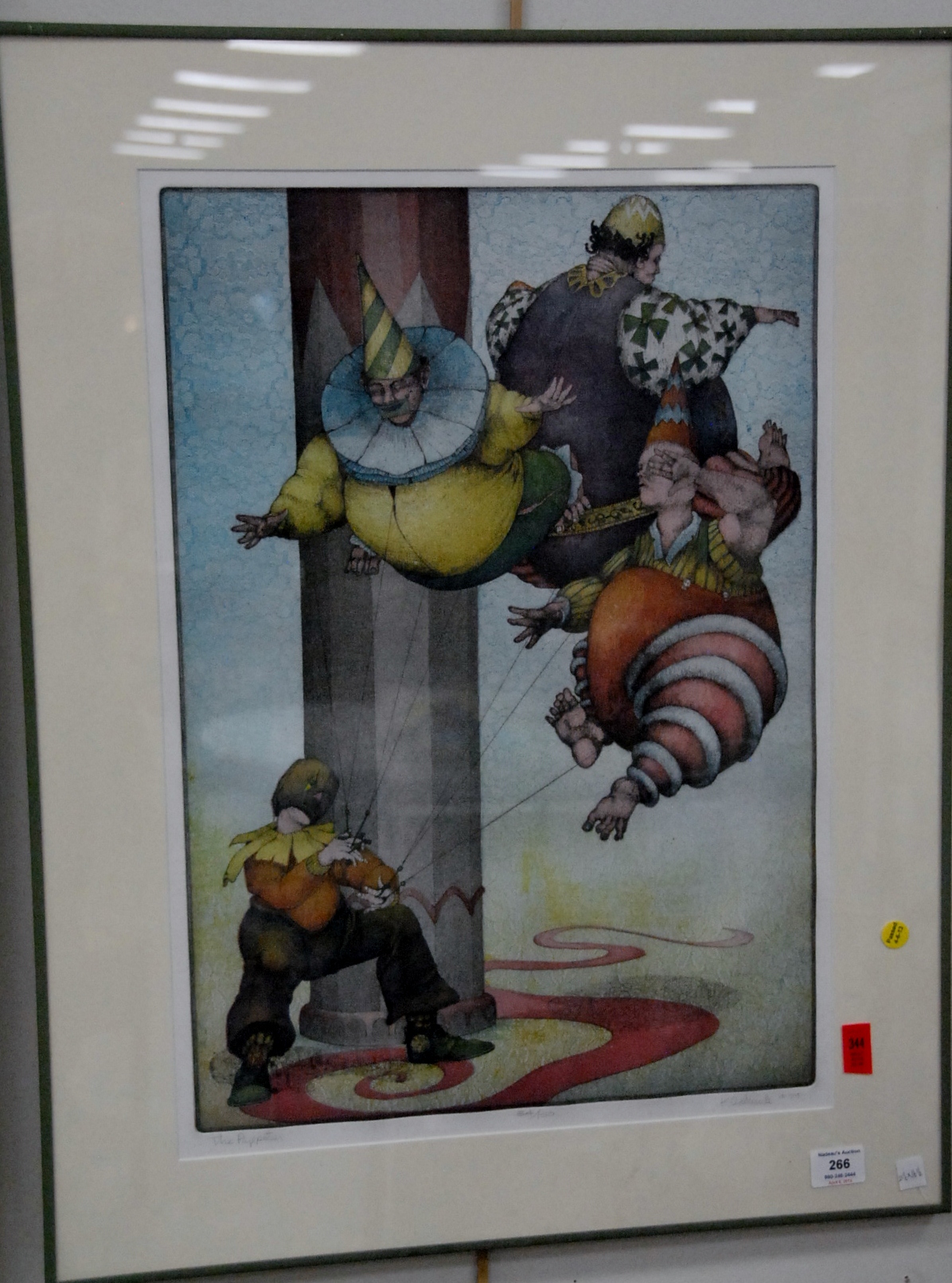 Charles Klabunde American 1935 THE PUPPETEER colored etching signed lower right Klabunde 79′ numbered lower center 34/150 titled lower left The Puppeteer plate size 23 1/2 x 16 1/2