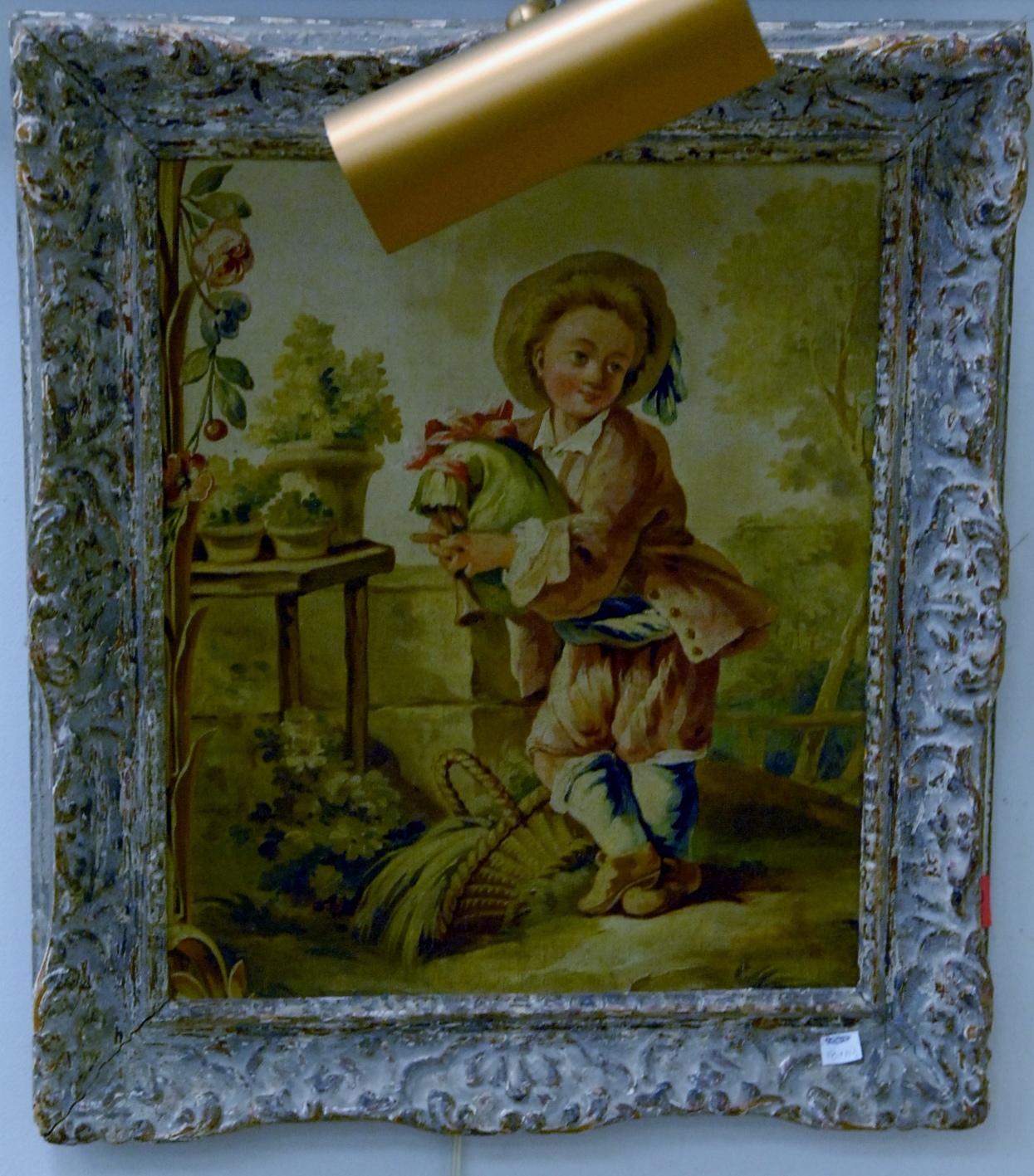 Oil on board painting of young boy leaning against wall marked on reverse Property of Elizabeth Weicker East 70th Street, New York and old label on reverse Tailleur Fils & Cie Paris 19th century, 18 x 14 1/2.