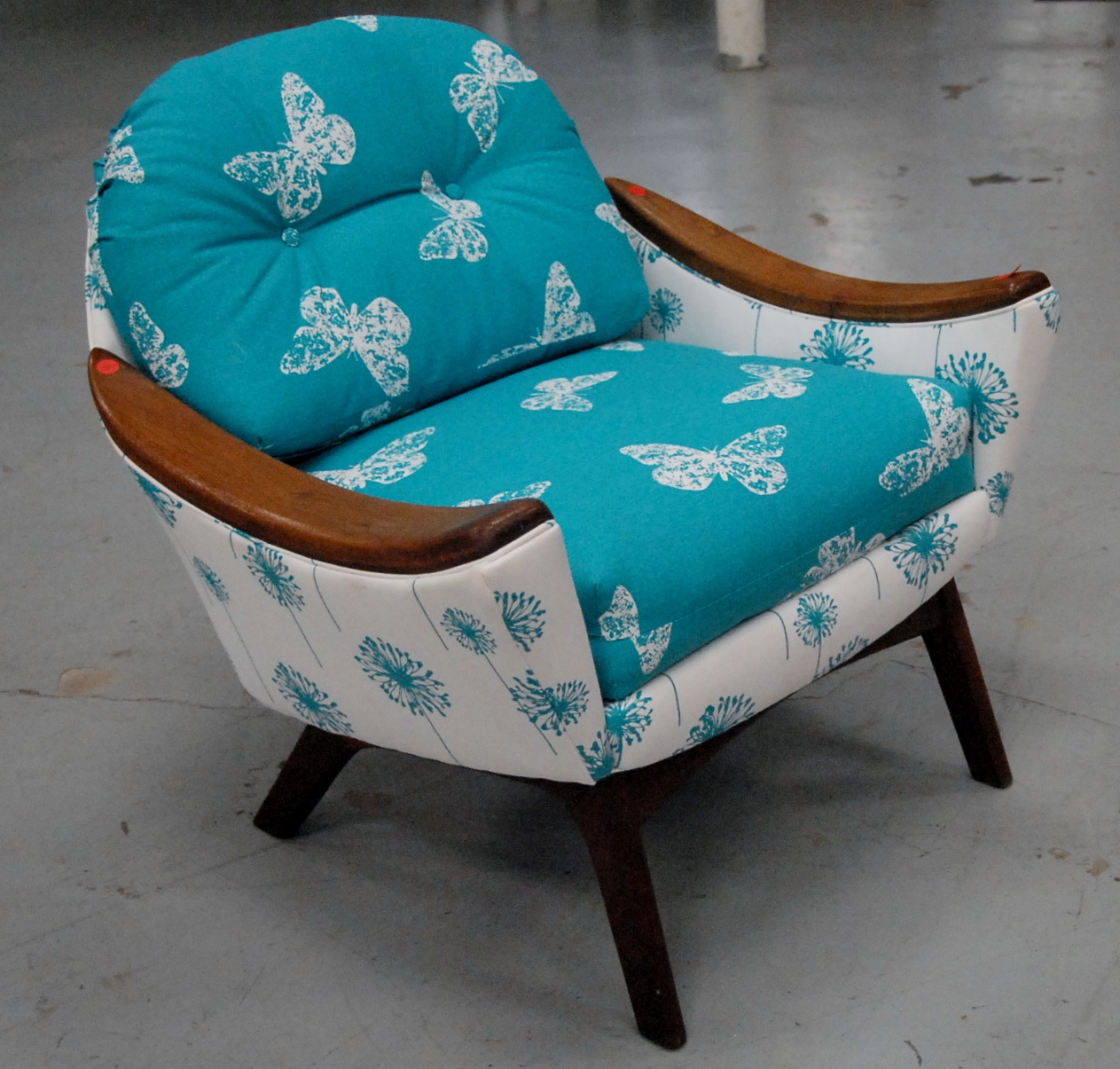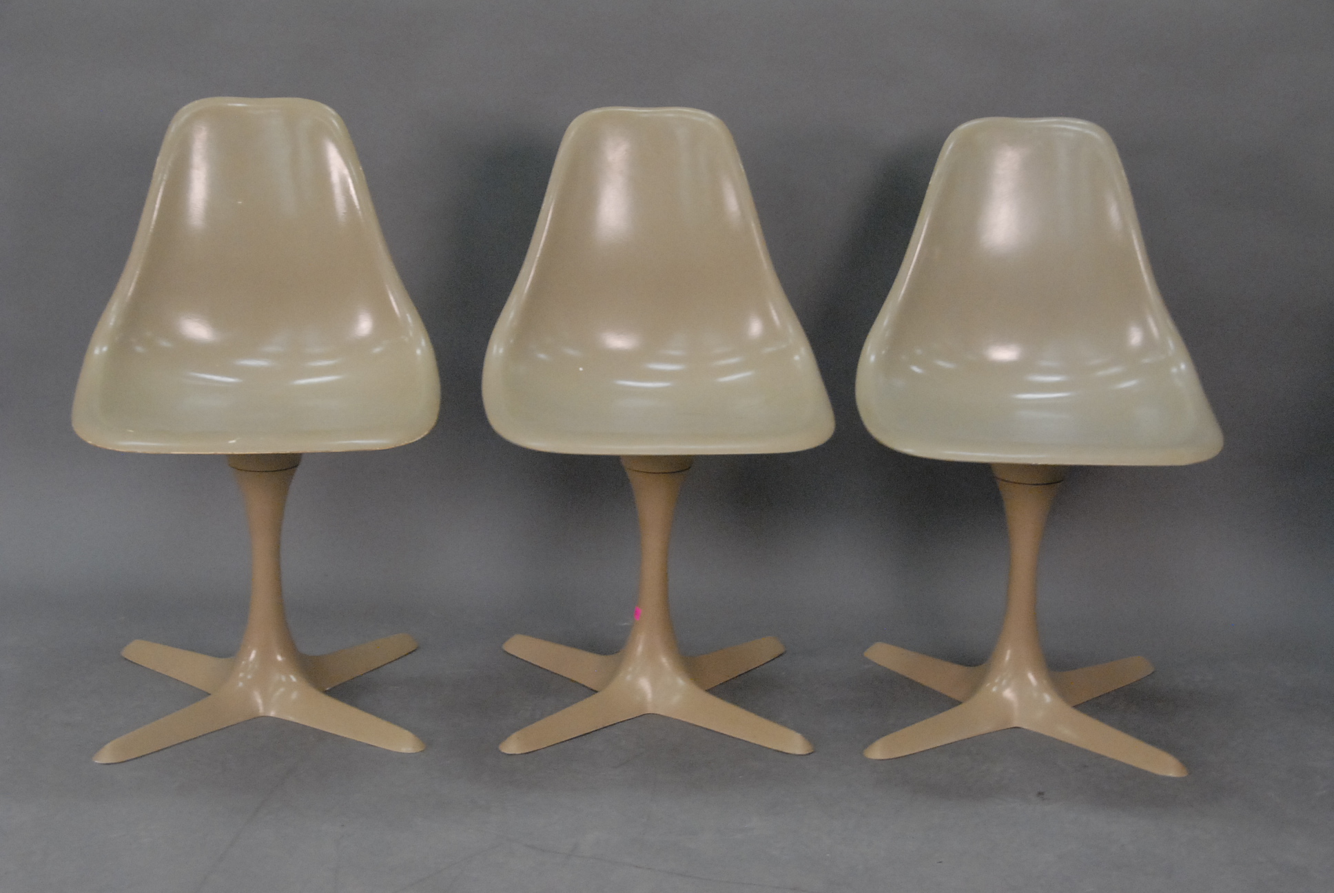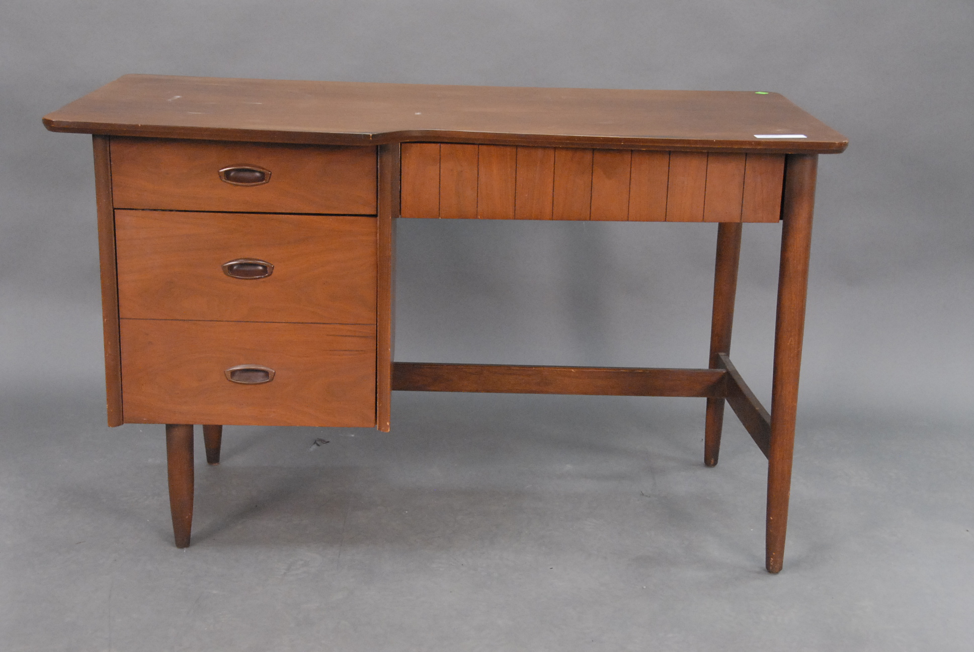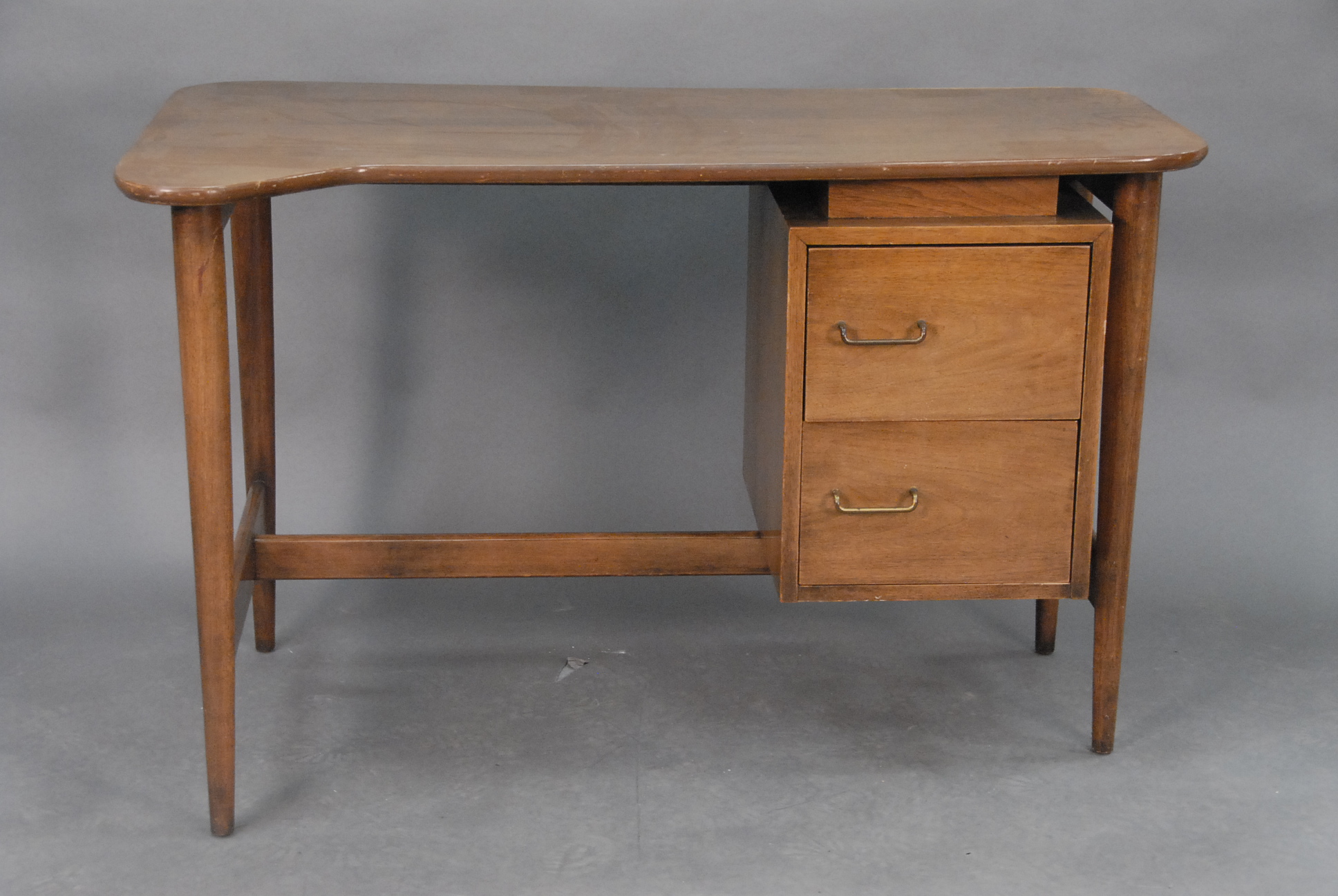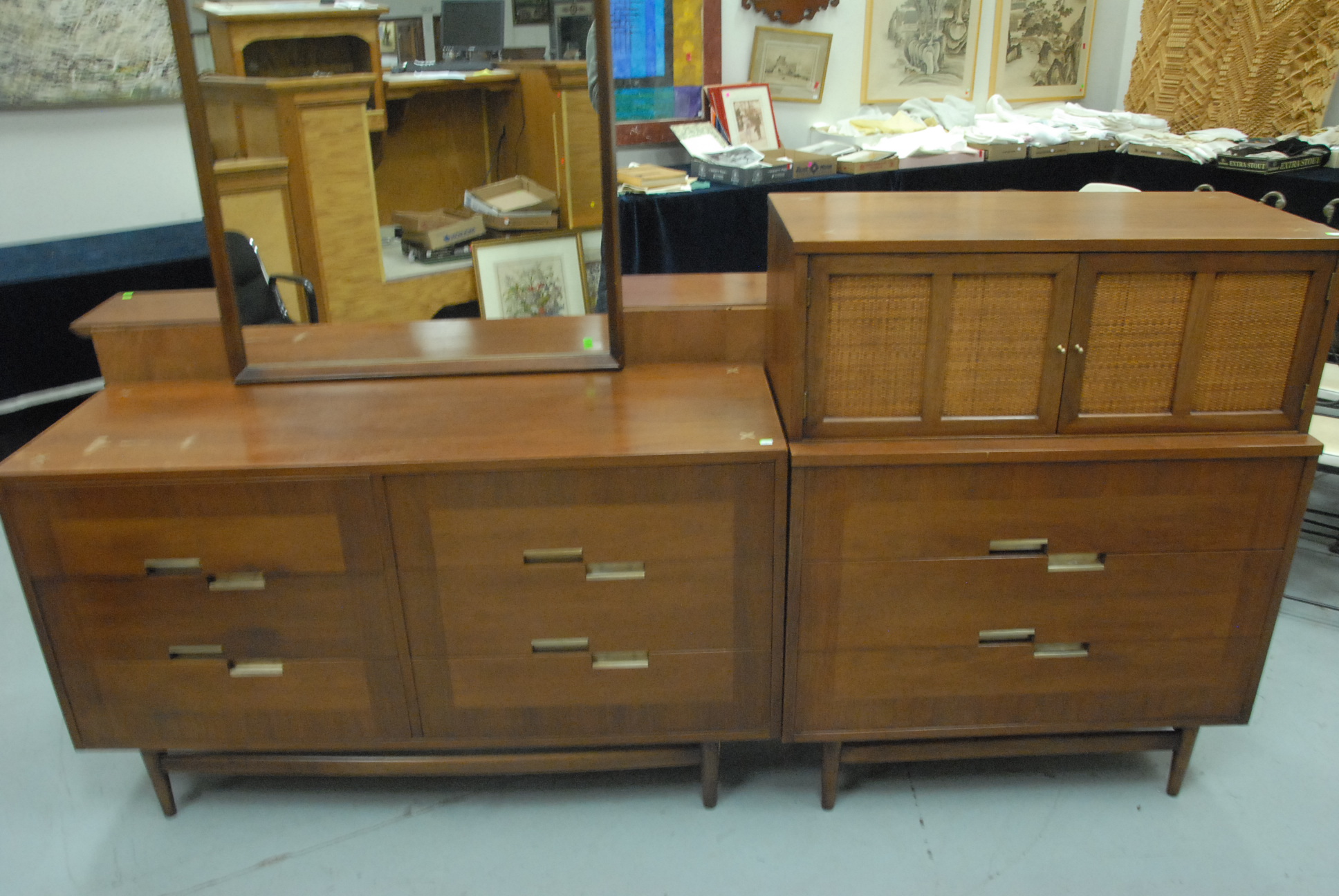 American of Martinsville walnut bedroom set attributed to Merton Gershun consisting of a two section tall chest with caned doors above three drawers, a six drawer long chest with mirror, and a double headboard.