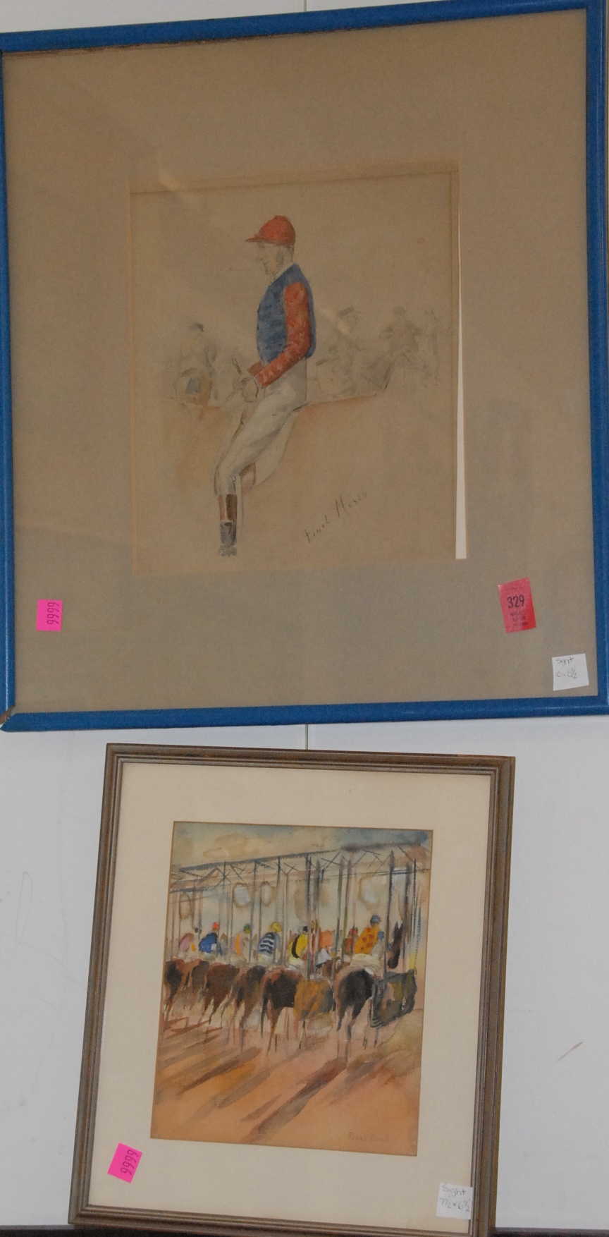 Two watercolors of horseracing, George Finch Mason 1850-1915 JOCKEY ON HORSEBACK 10 x 8 1/2 and the other horses lined up signed Frank Boyd 7 1/2 x 6 1/2.
